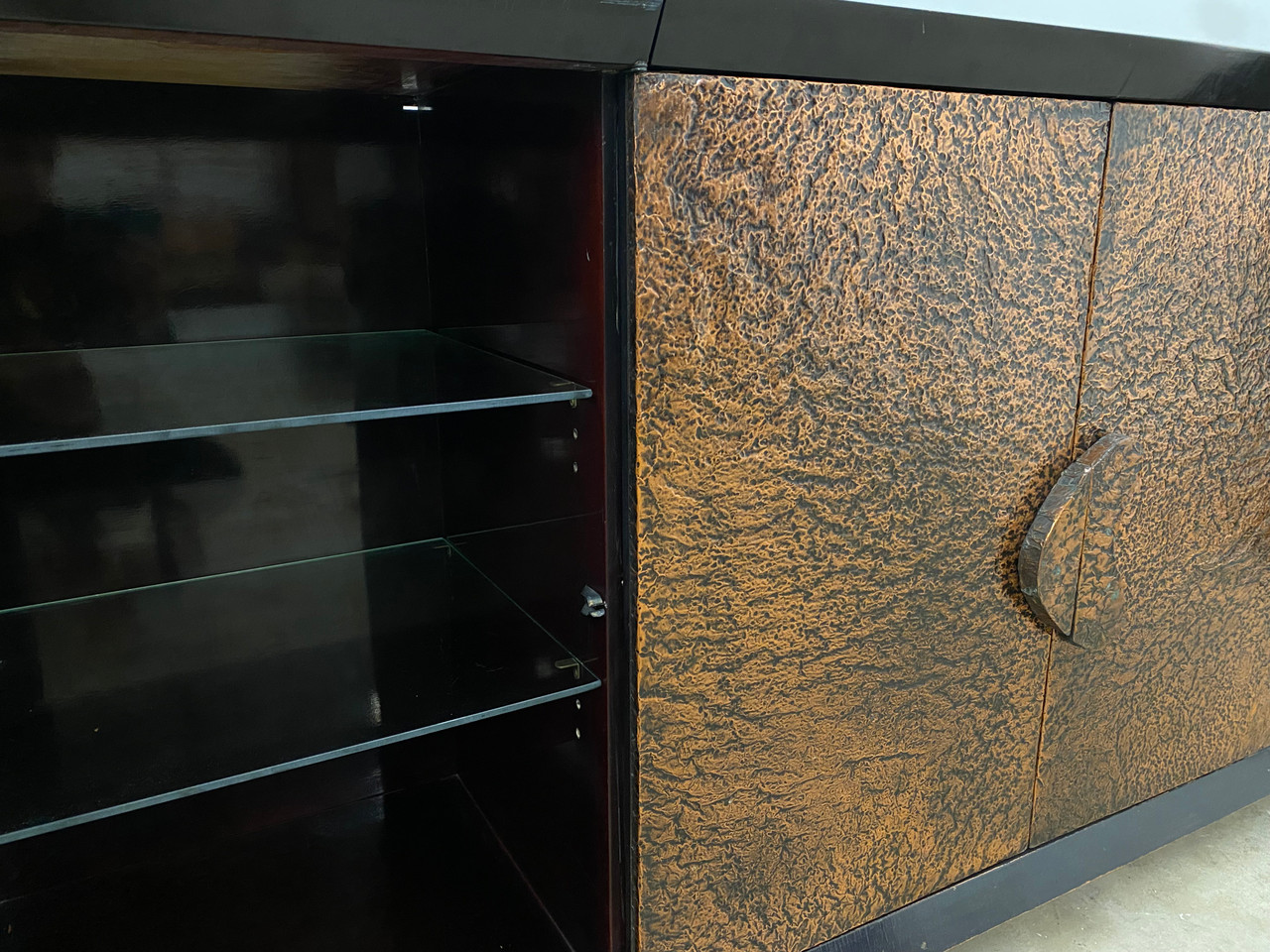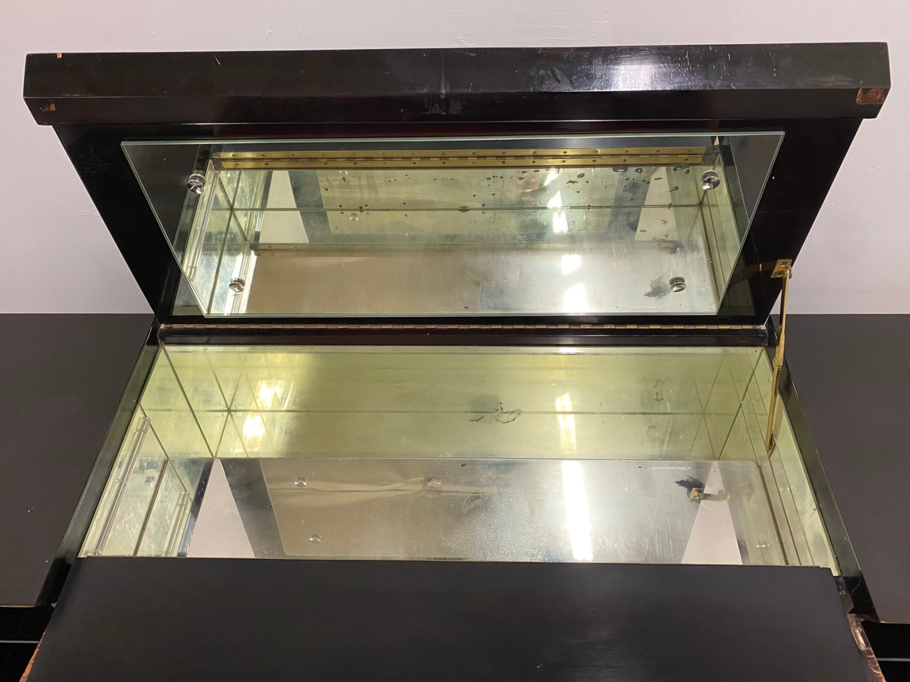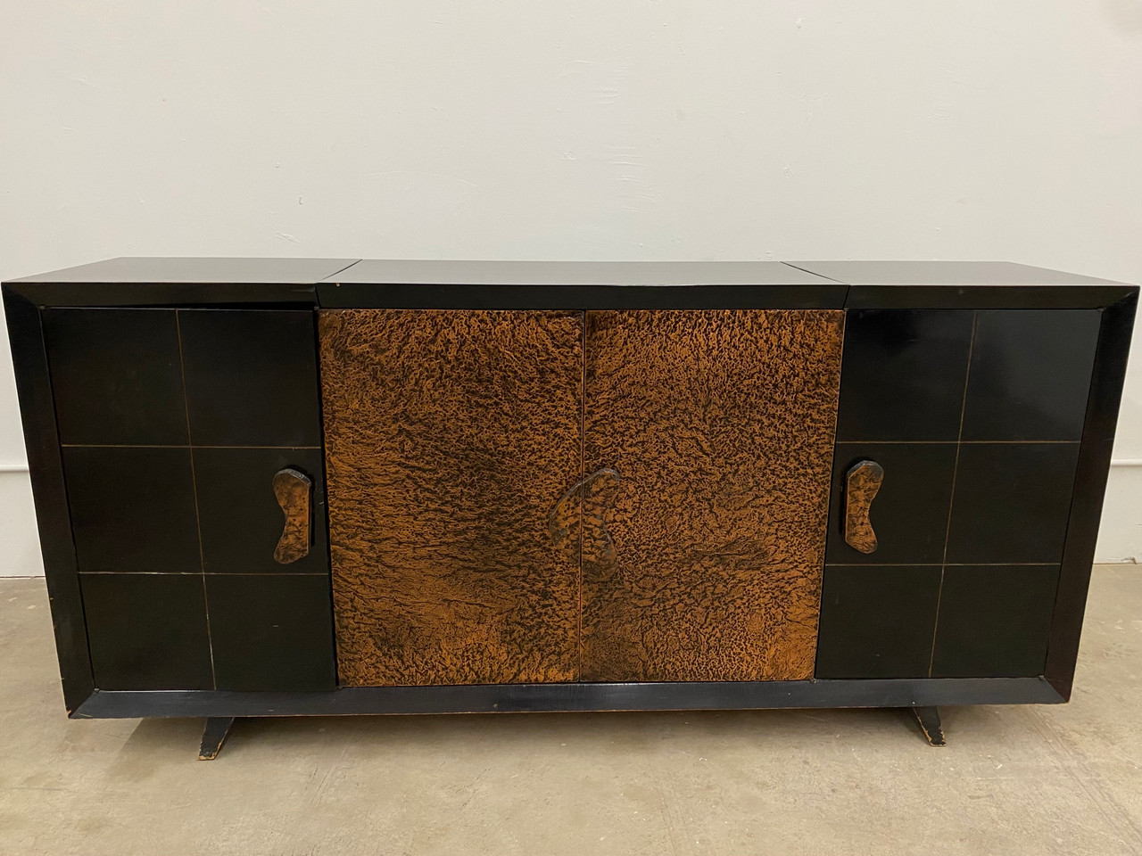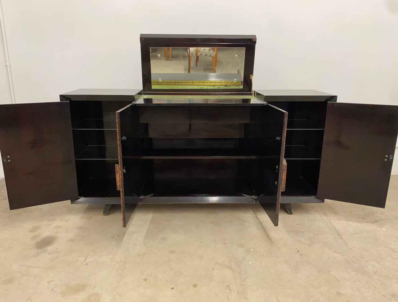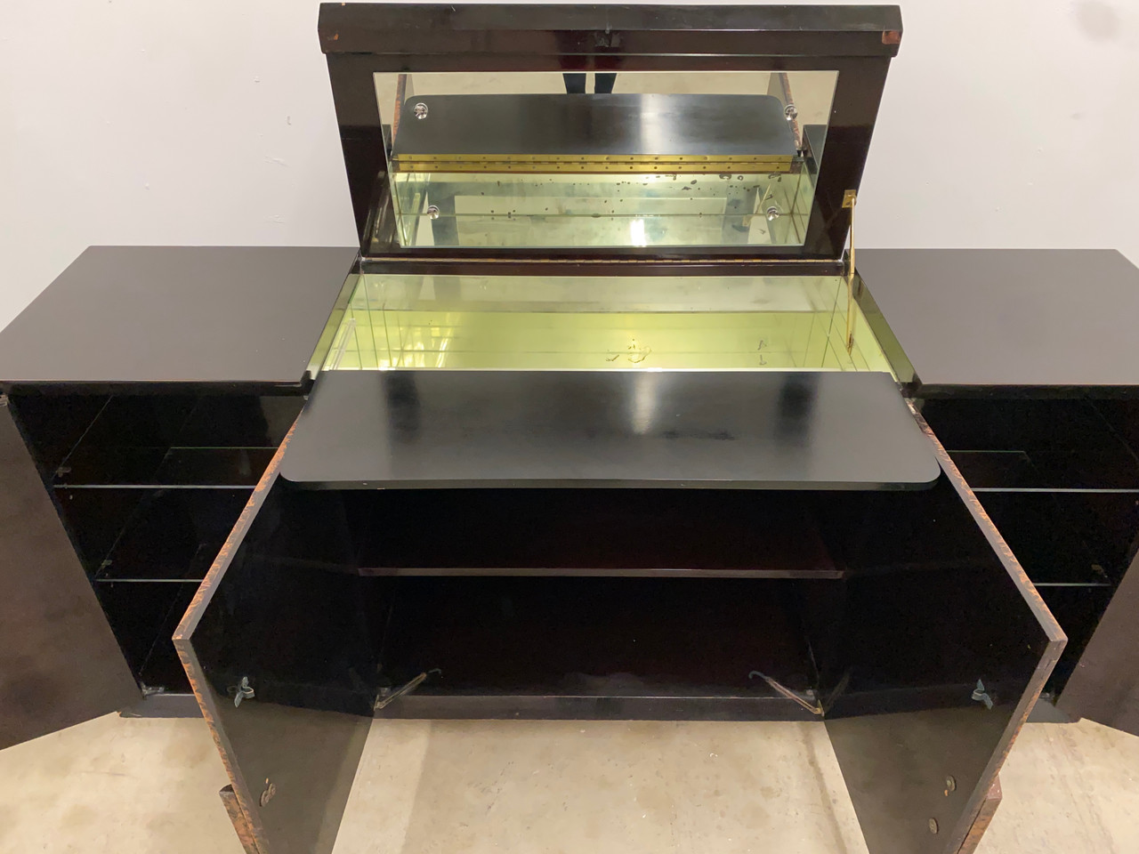 Fantastic Mahogany console bar with flip open top. Mirrored interior with bottle storage well. Hammered Copper doors and handles on large center cabinet with wood shelf. Side cabinets have two glass shelves. In good vintage condition. High quality construction was built to last.