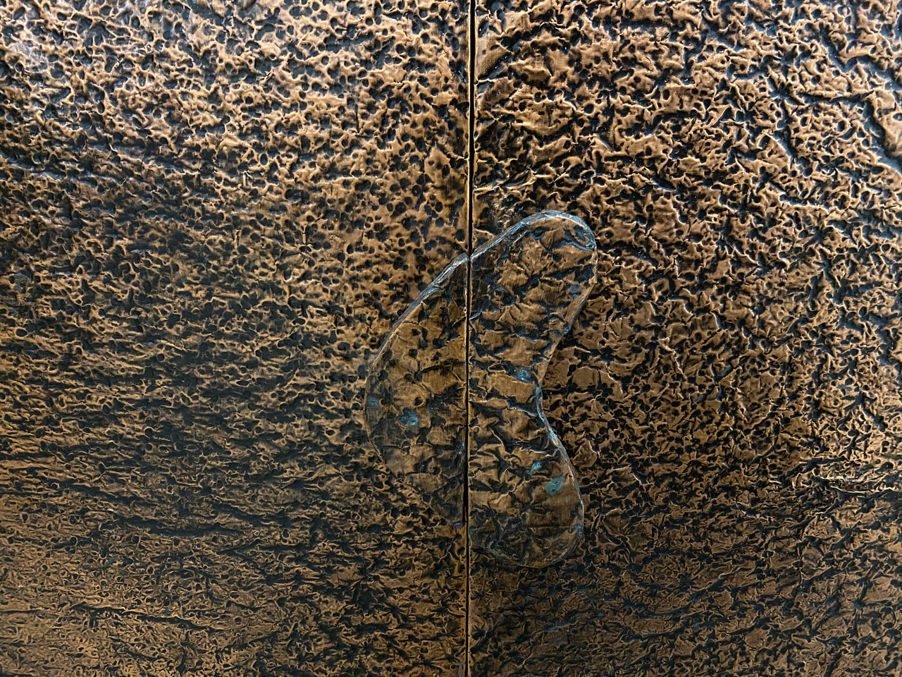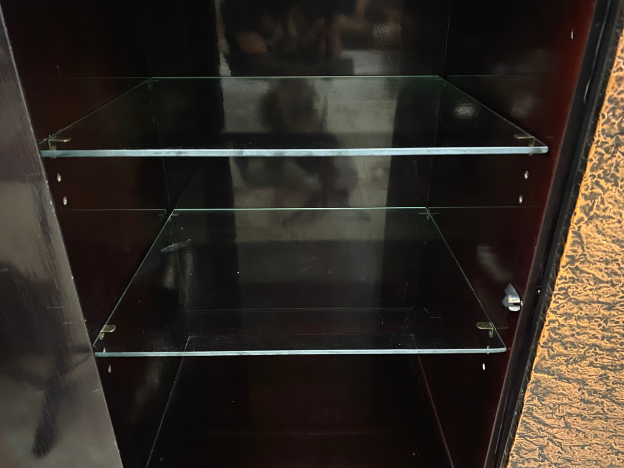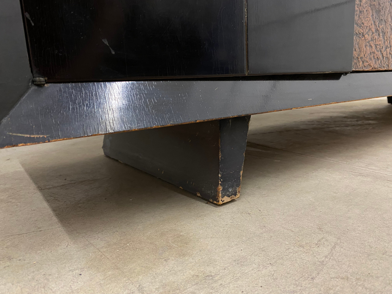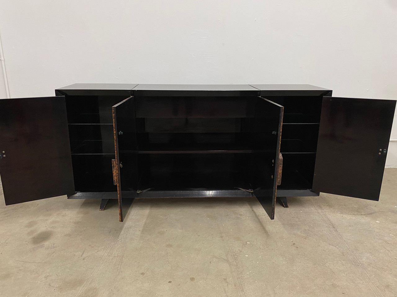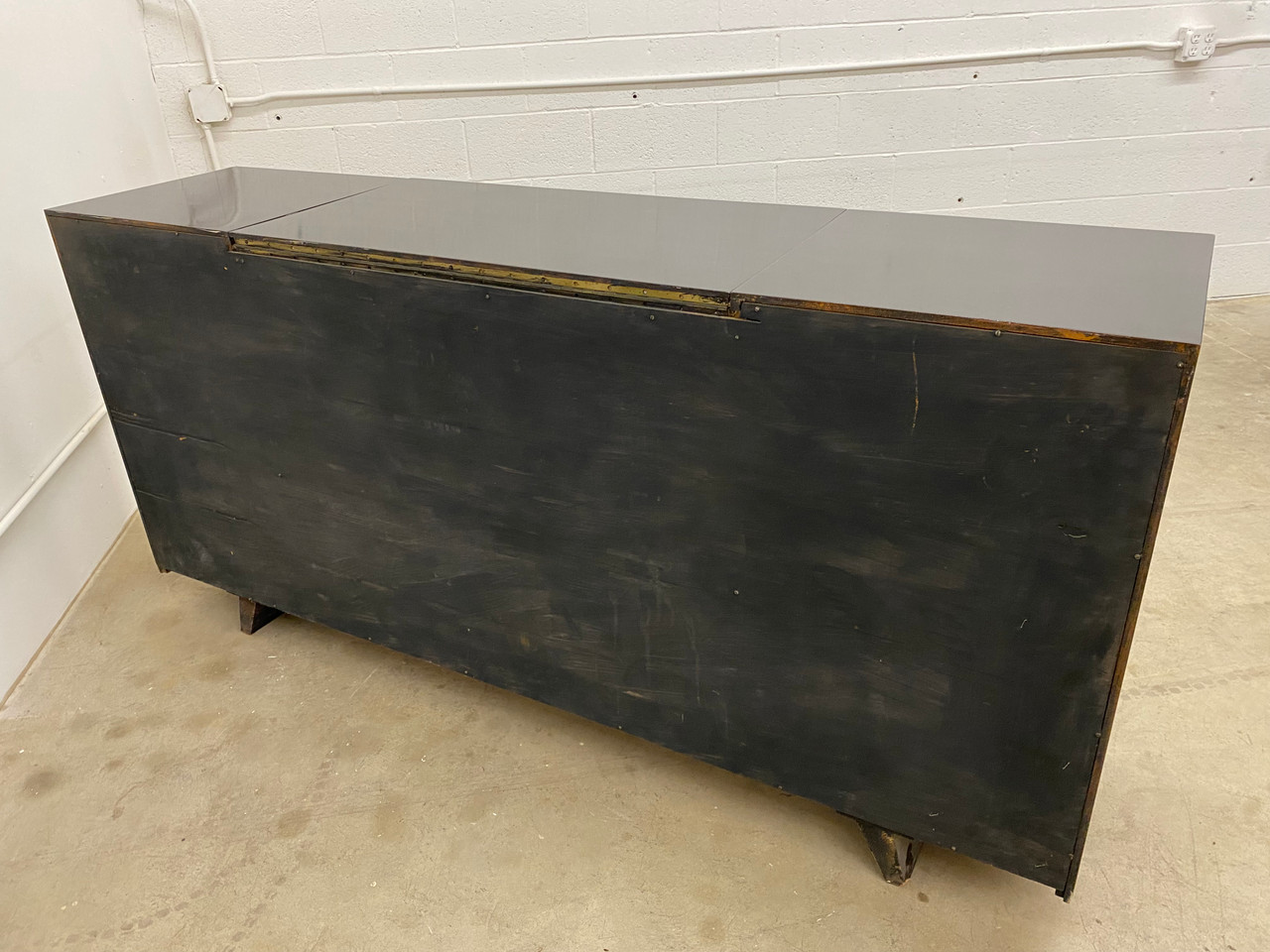 Fantastic Mahogany console bar with flip open top. Mirrored interior with bottle storage well. Hammered Copper doors and handles on large center cabinet with wood shelf. Side cabinets have two glass shelves. In good vintage condition. High quality construction was built to last.