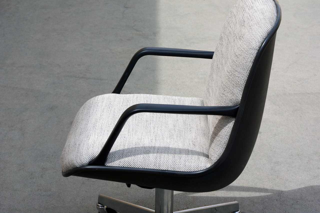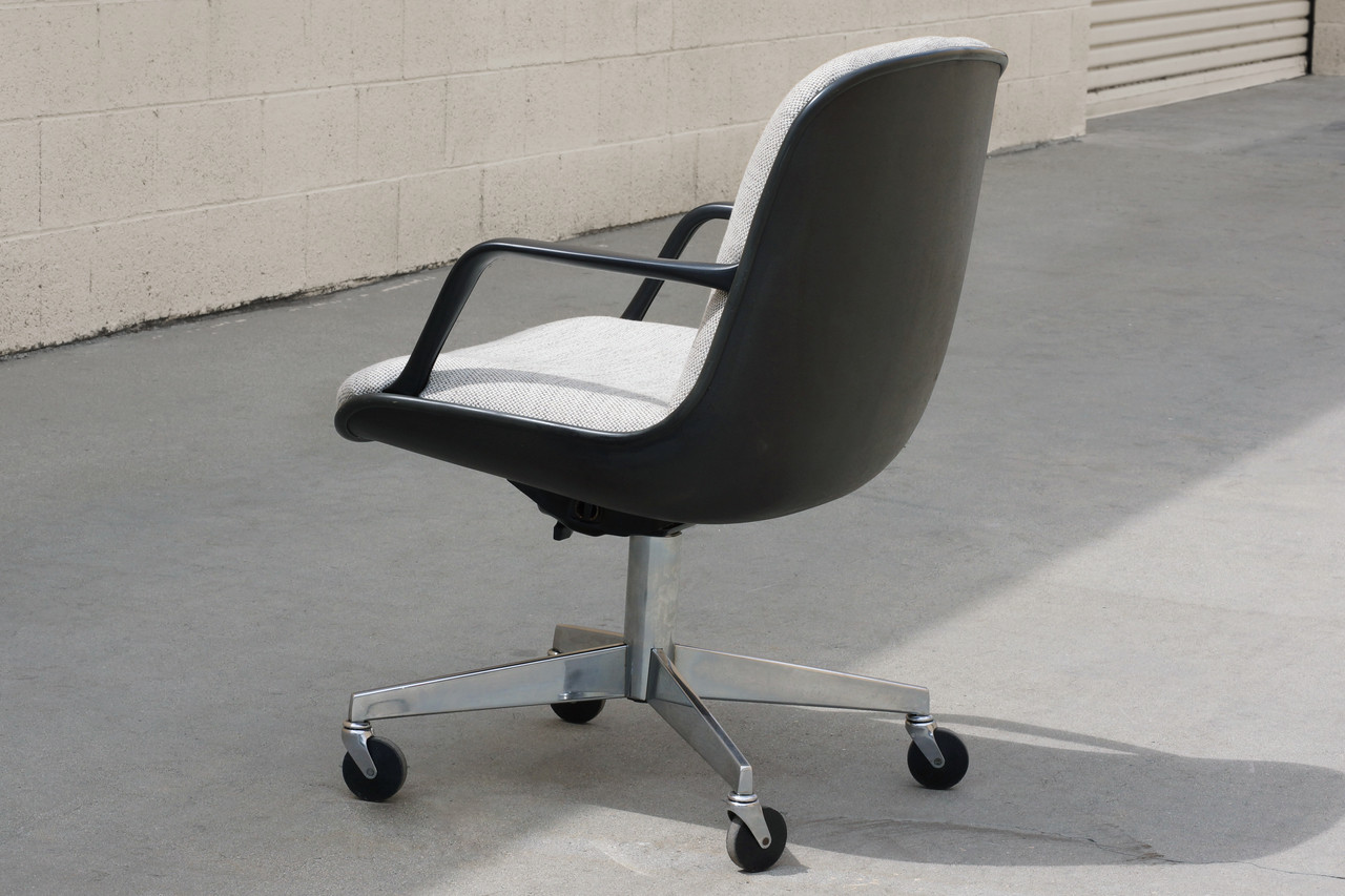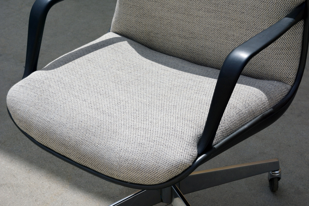 Vintage 1984 Steelcase office chair, model 451. This mid century inspired chair features an iconic bucket seat on a chrome base. Newly reupholstered in gray tweed fabric. Rolls on casters. In the style of the famed Charles Pollock Chair.