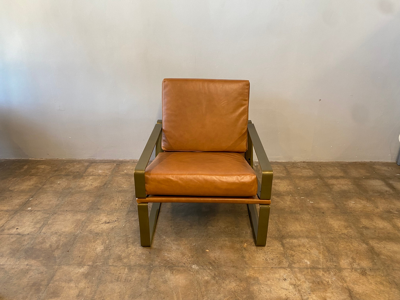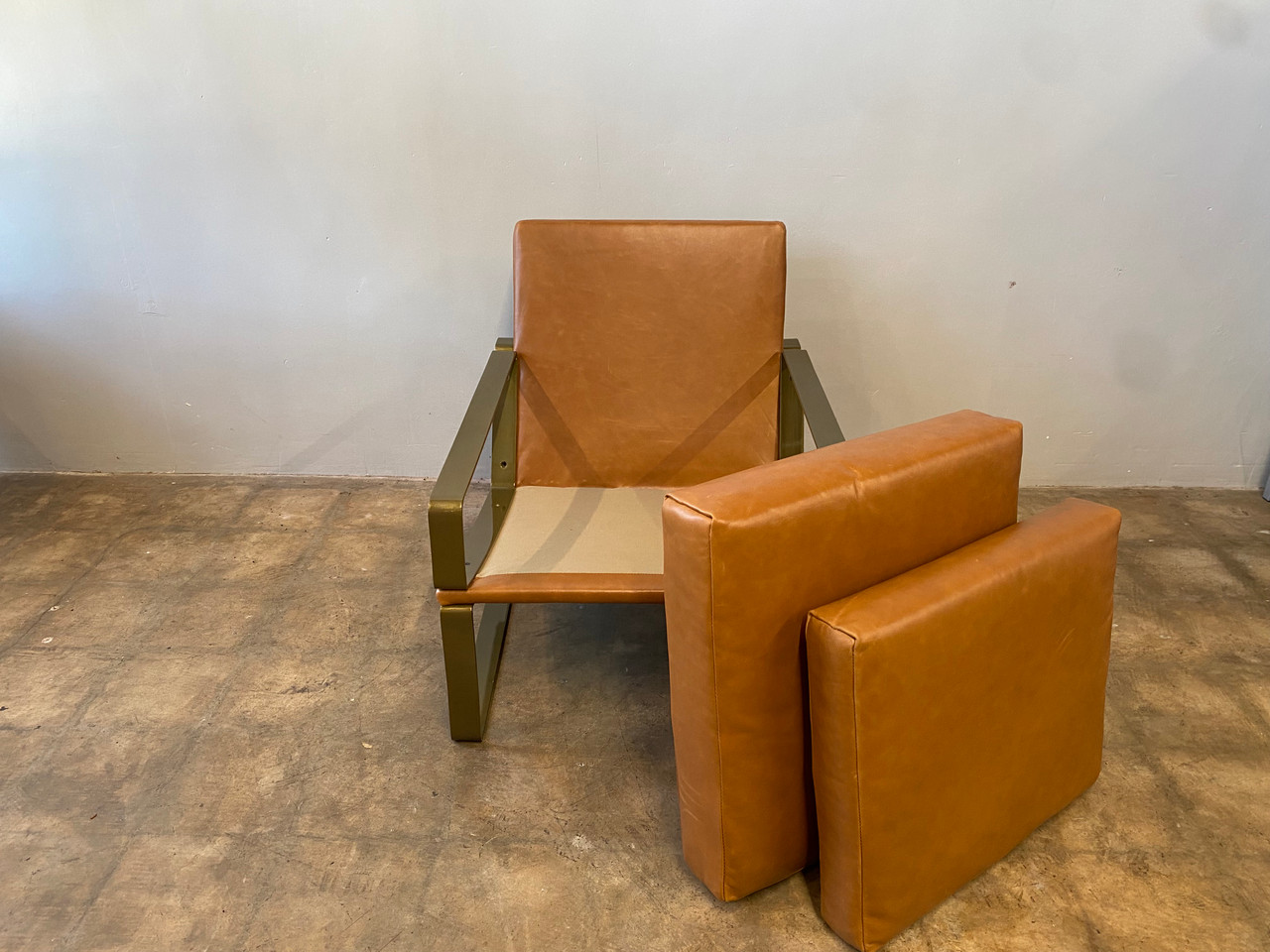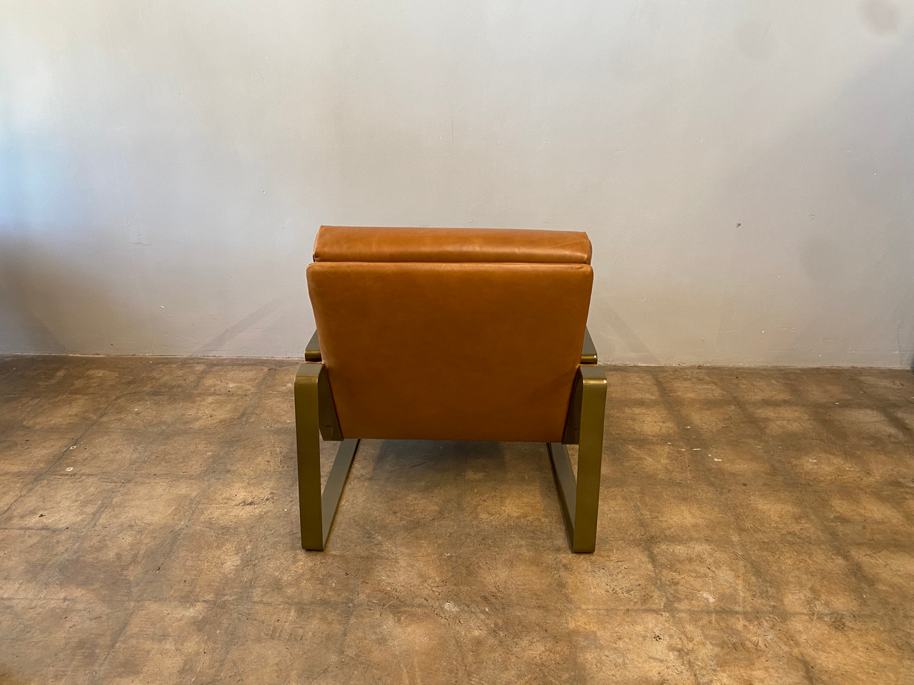 Pair of vintage 1990s Italian lounge chairs. Feature newly upholstered natural leather and transparent brass powder coat finish. Unique detached geometric-shaped base and arms.
