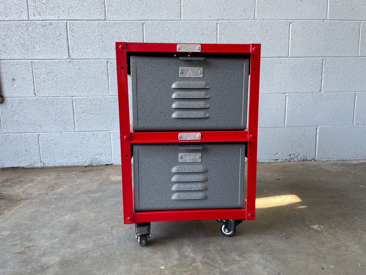 Our newly fabricated locker basket units are inspired by the mid-century classics we've been refinishing for years. Featured here is a 1 x 2 unit on locking casters with Fire Engine Red baskets (RD 01) and a Silver Vein frame. It's the perfect storage solution for anything from tools, paper and art supplies to socks and t-shirts. Bins feature option to add a lock.