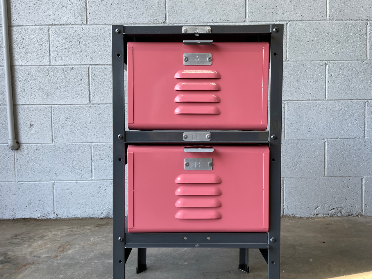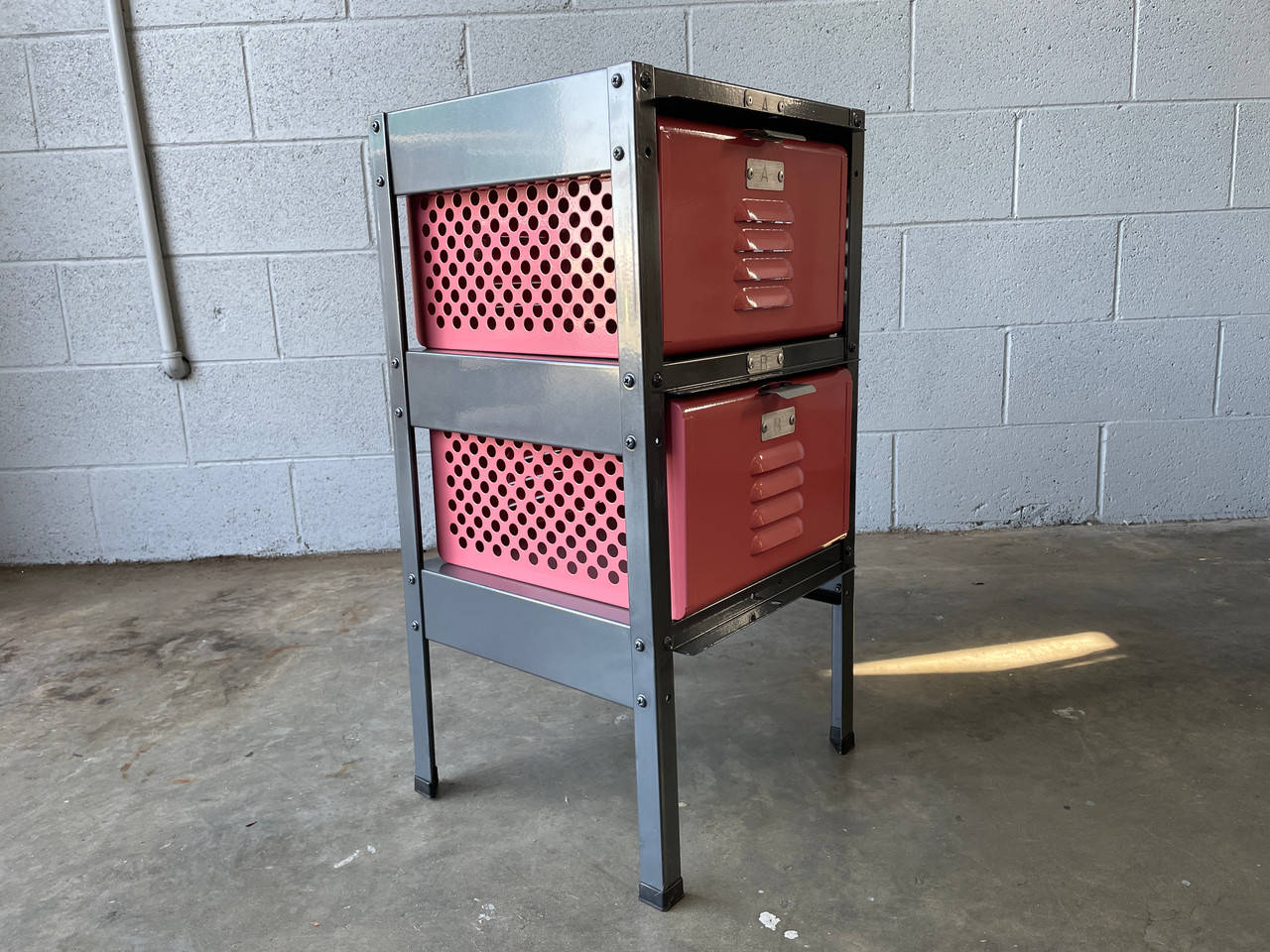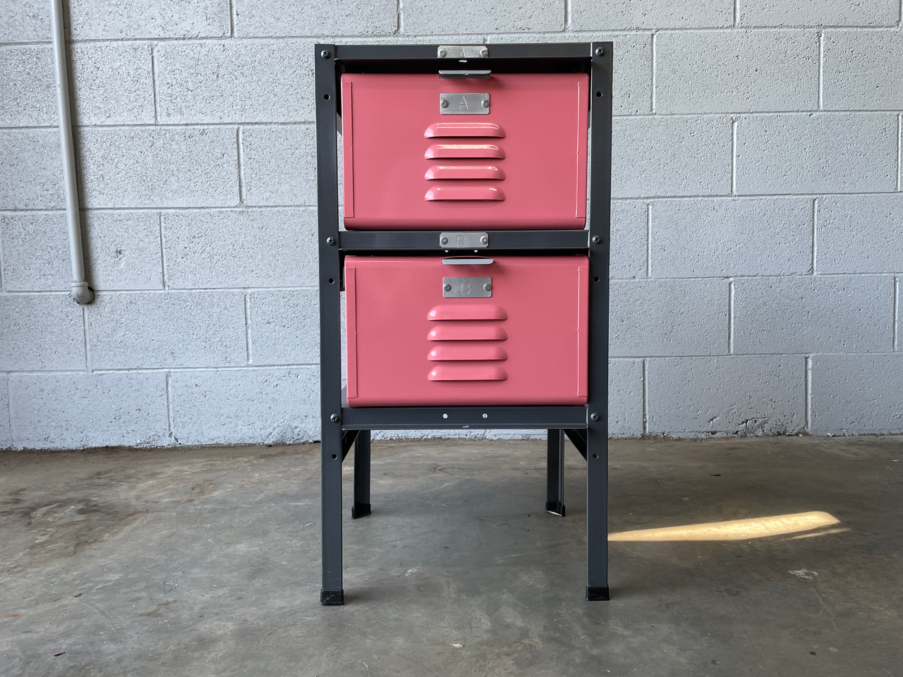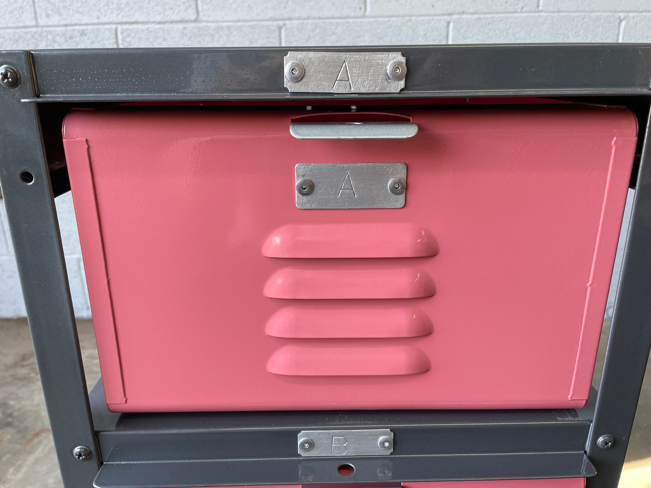 Our newly fabricated locker basket units are inspired by the mid-century classics we've been refinishing for years. Featured here is a 1 x 2 unit on 6" legs with Salmon baskets (RAL 3014) and a Metalic Gray (GR 02) frame. It's the perfect storage solution for anything from tools, paper and art supplies to socks and t-shirts. Bins feature option to add a lock.