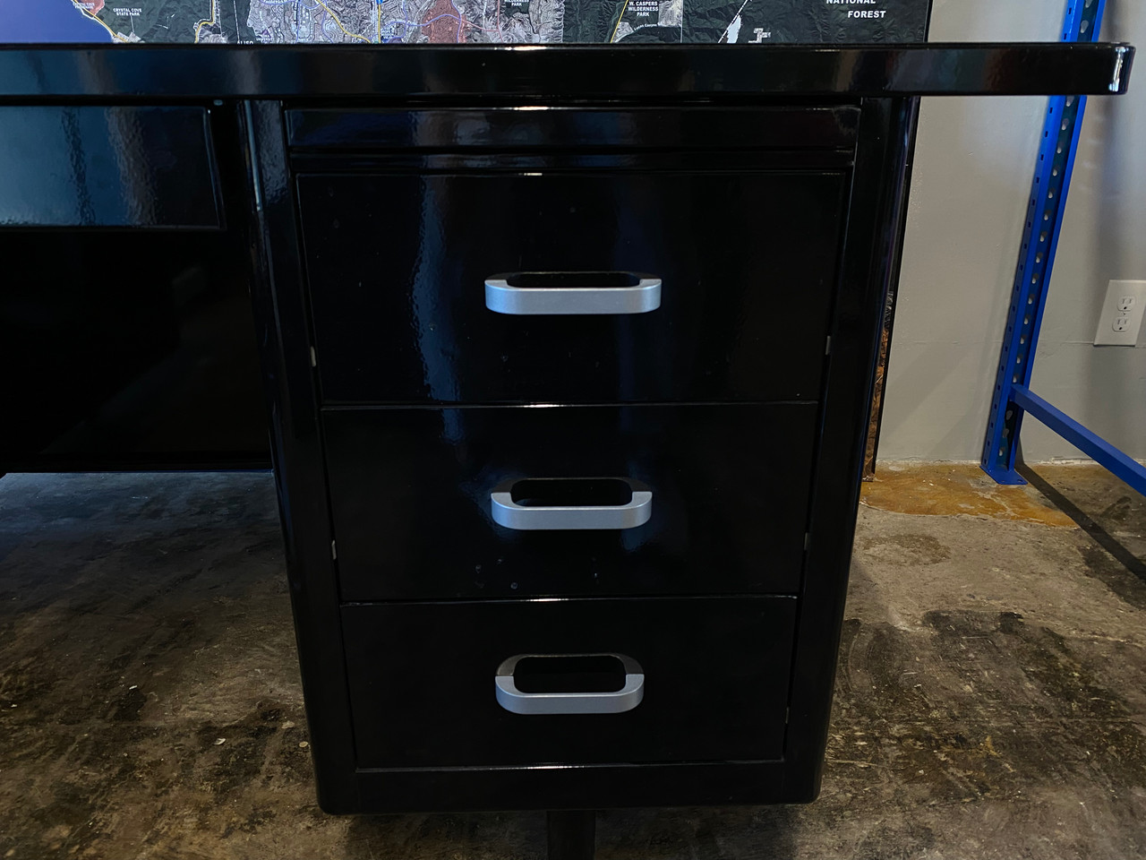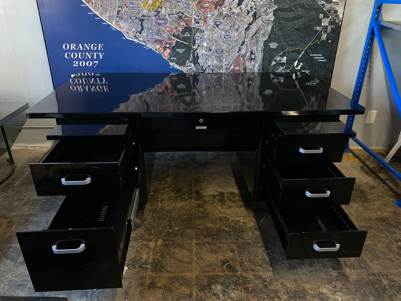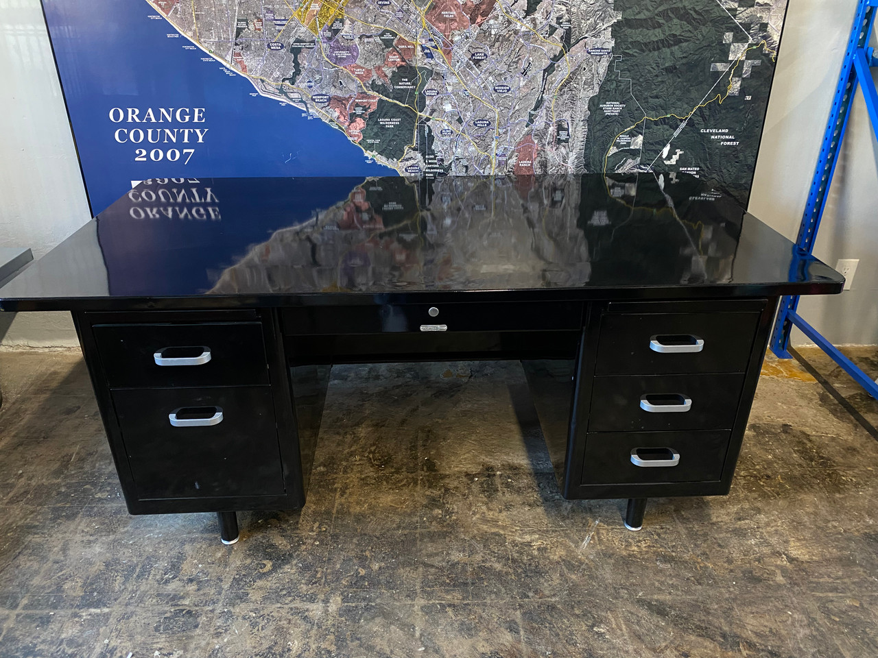 Classic mid-century double pedestal tanker desk with an oversized "fan top". Expertly refinished in a glossy black powder coat and metallic silver powder coat hardware. Features: Many utility drawers, one filing drawer, a stationary drawer, and letter trays. Heavy-duty, yet sleek mid-century modern styling.
