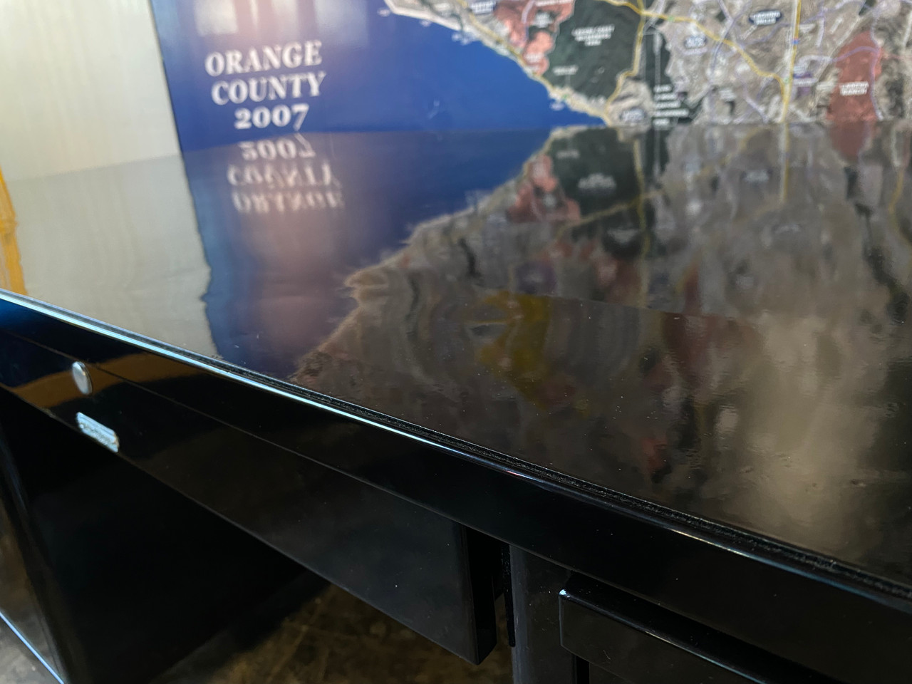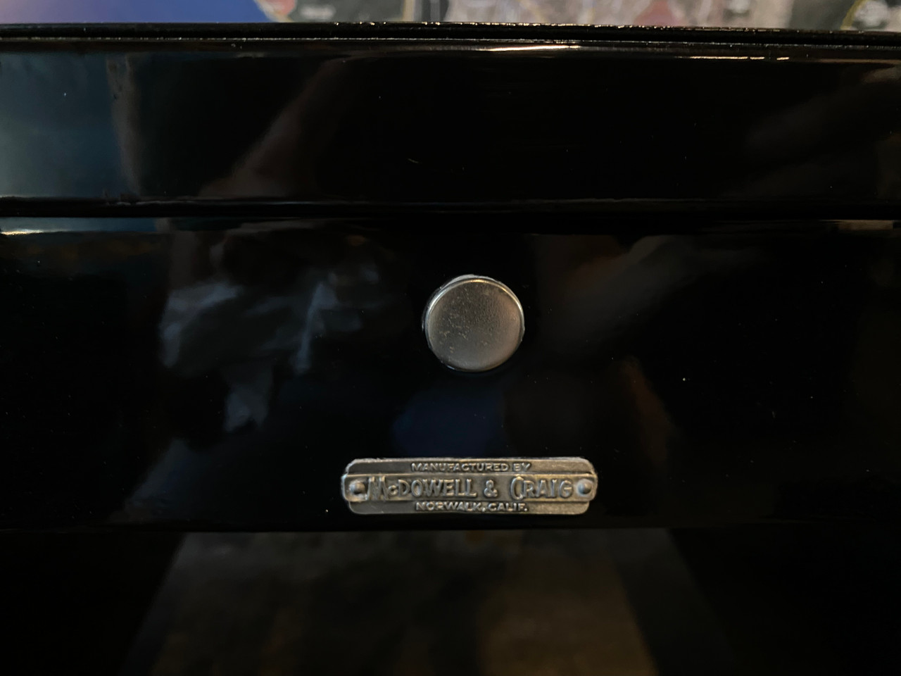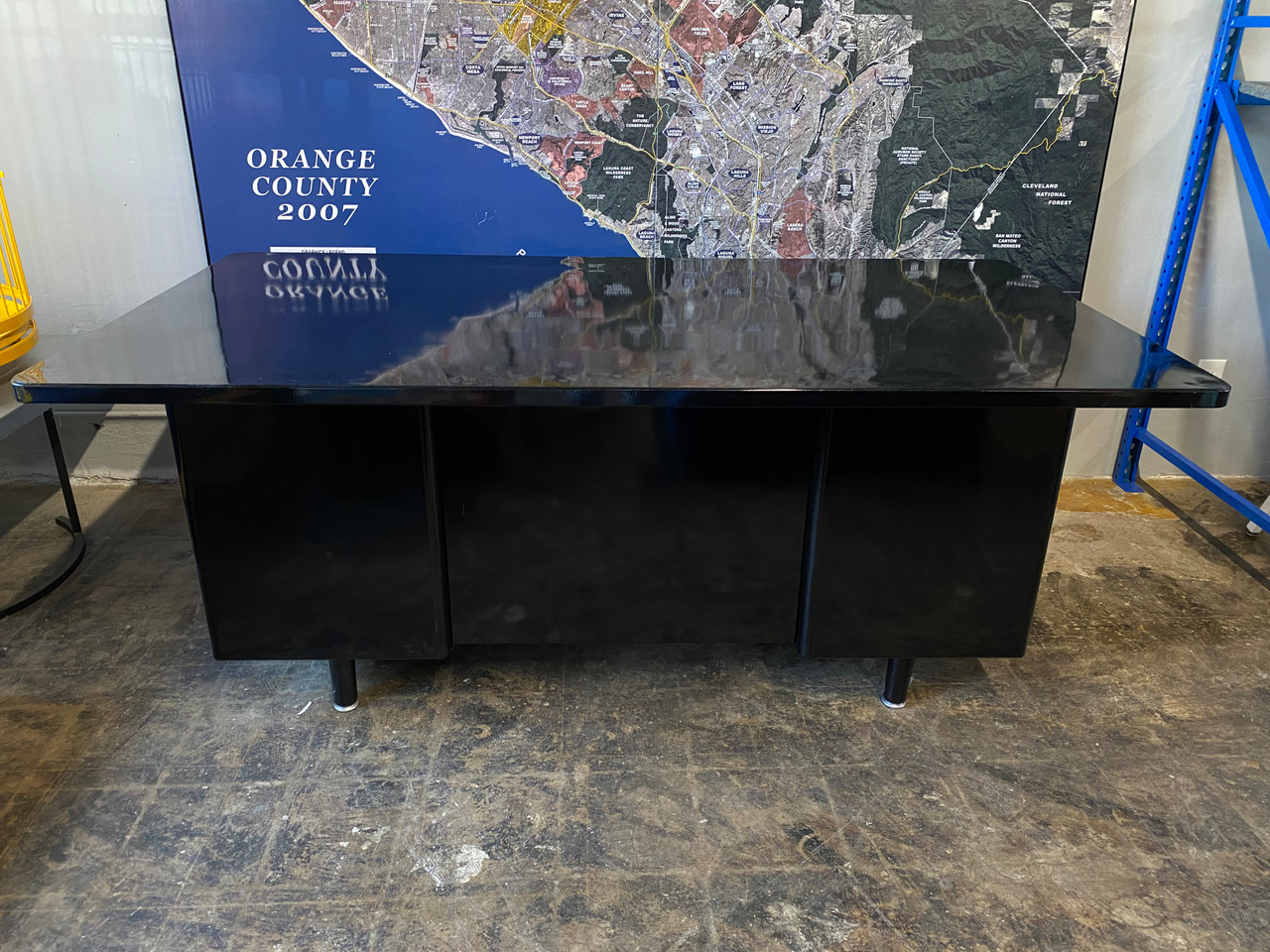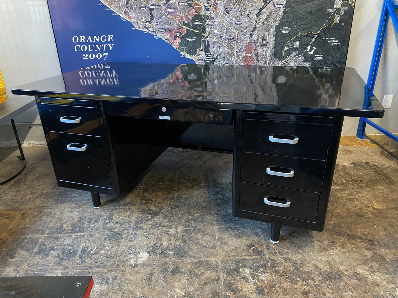 Classic mid-century double pedestal tanker desk with an oversized "fan top". Expertly refinished in a glossy black powder coat and metallic silver powder coat hardware. Features: Many utility drawers, one filing drawer, a stationary drawer, and letter trays. Heavy-duty, yet sleek mid-century modern styling.