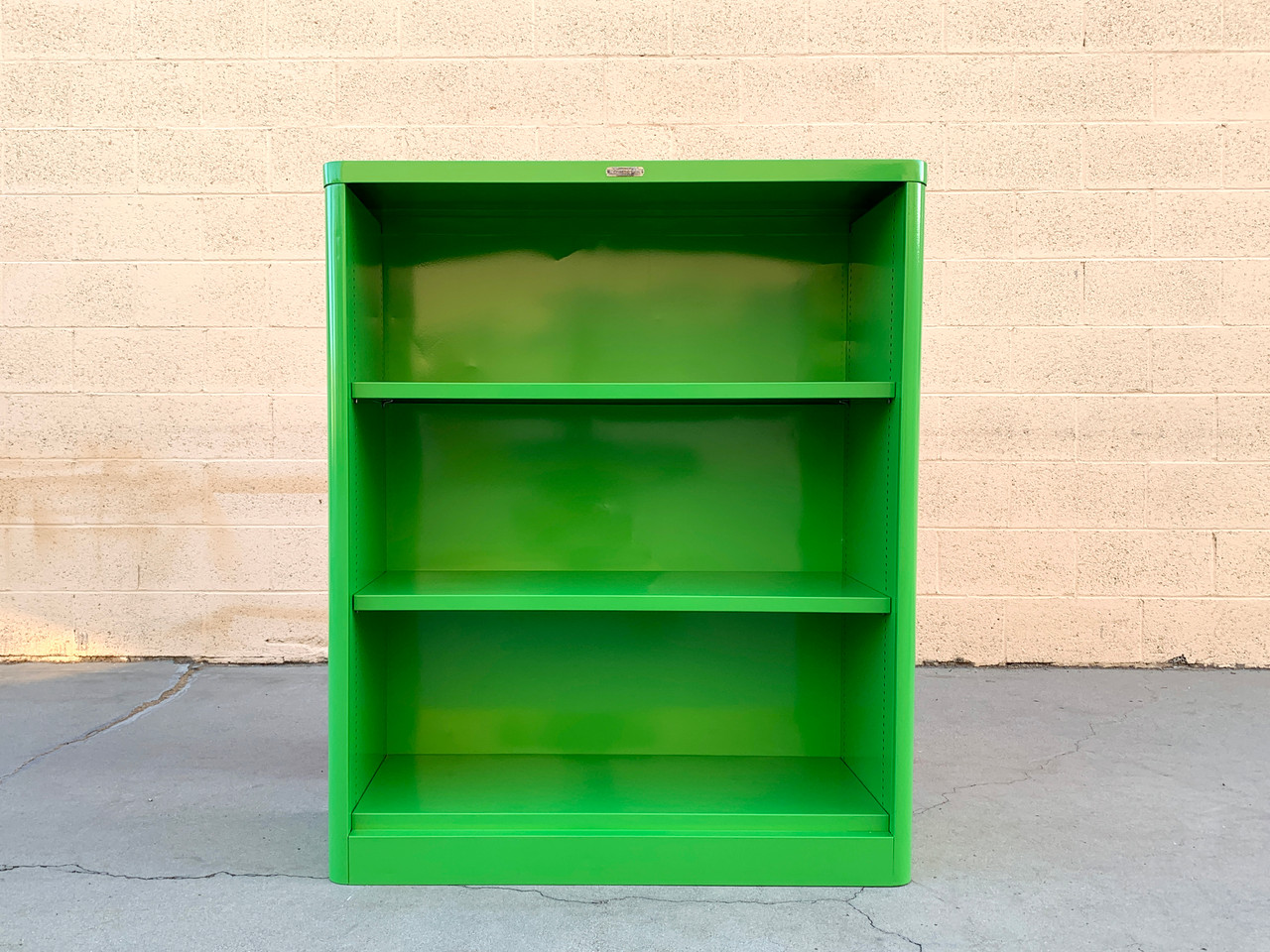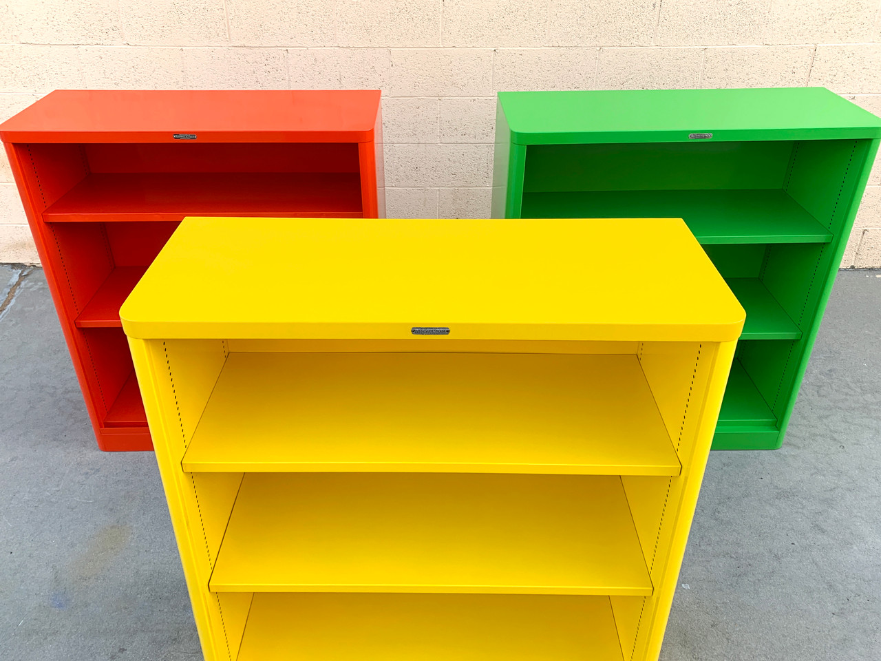 Our bookcase are in excellent refinished vintage condition. Vintage steel with custom powder coated finish and original tags, polished to a shine. We source units in the finest vintage condition, however minor wear such as dings may been seen in steel based due to age.