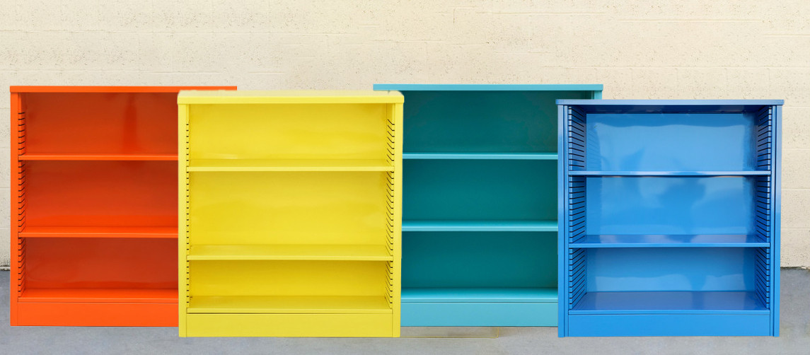 Neat 1960s tanker style steel bookcase freshly powder coated in color of your choice. Originally used in the UCLA math department, this adjustable three-shelf unit is an excellent storage option– its sleek and compact, yet holds many books. It's perfect for storage and display.