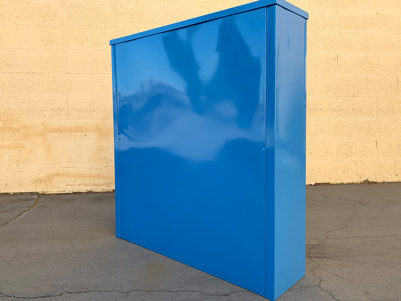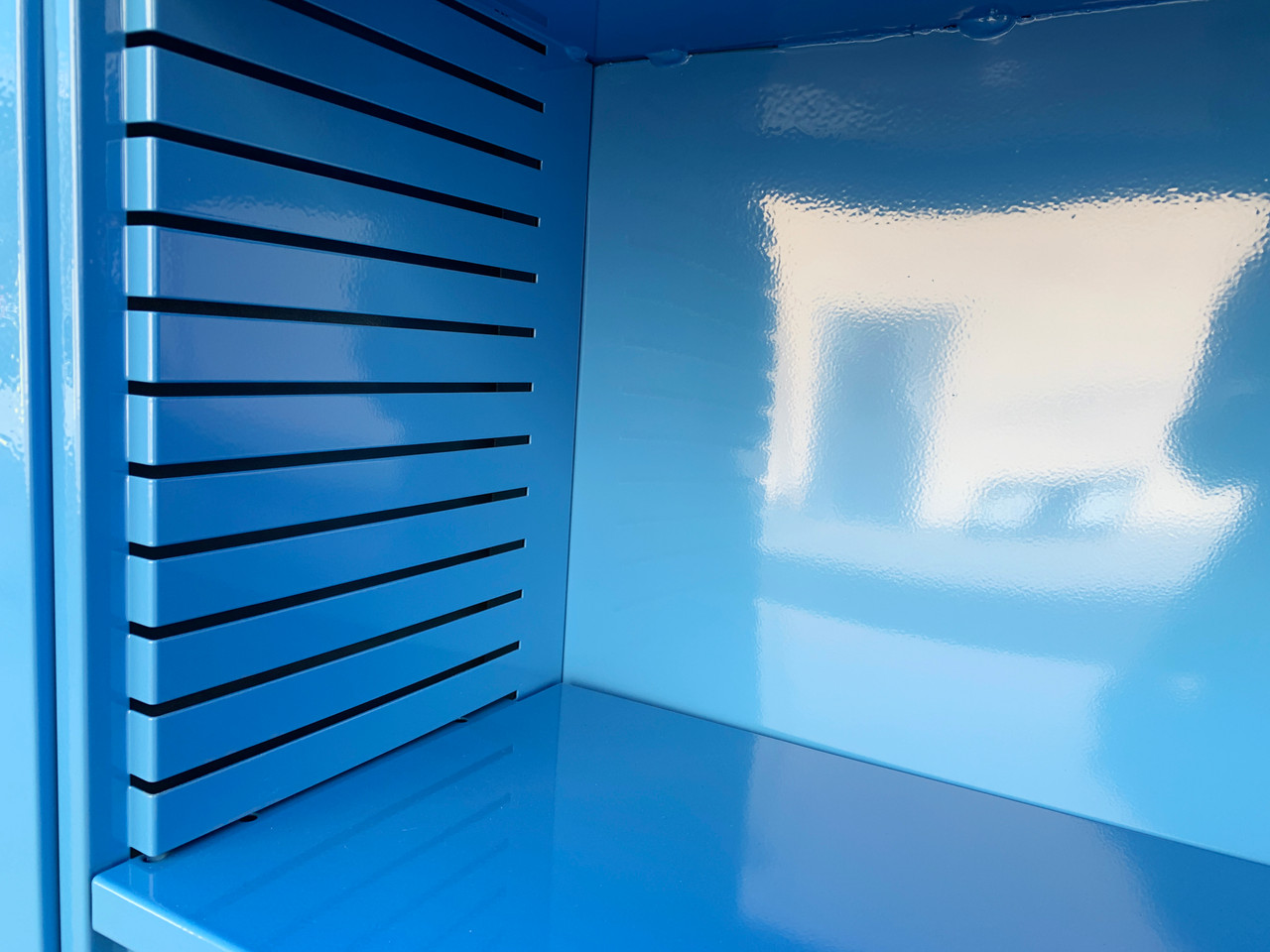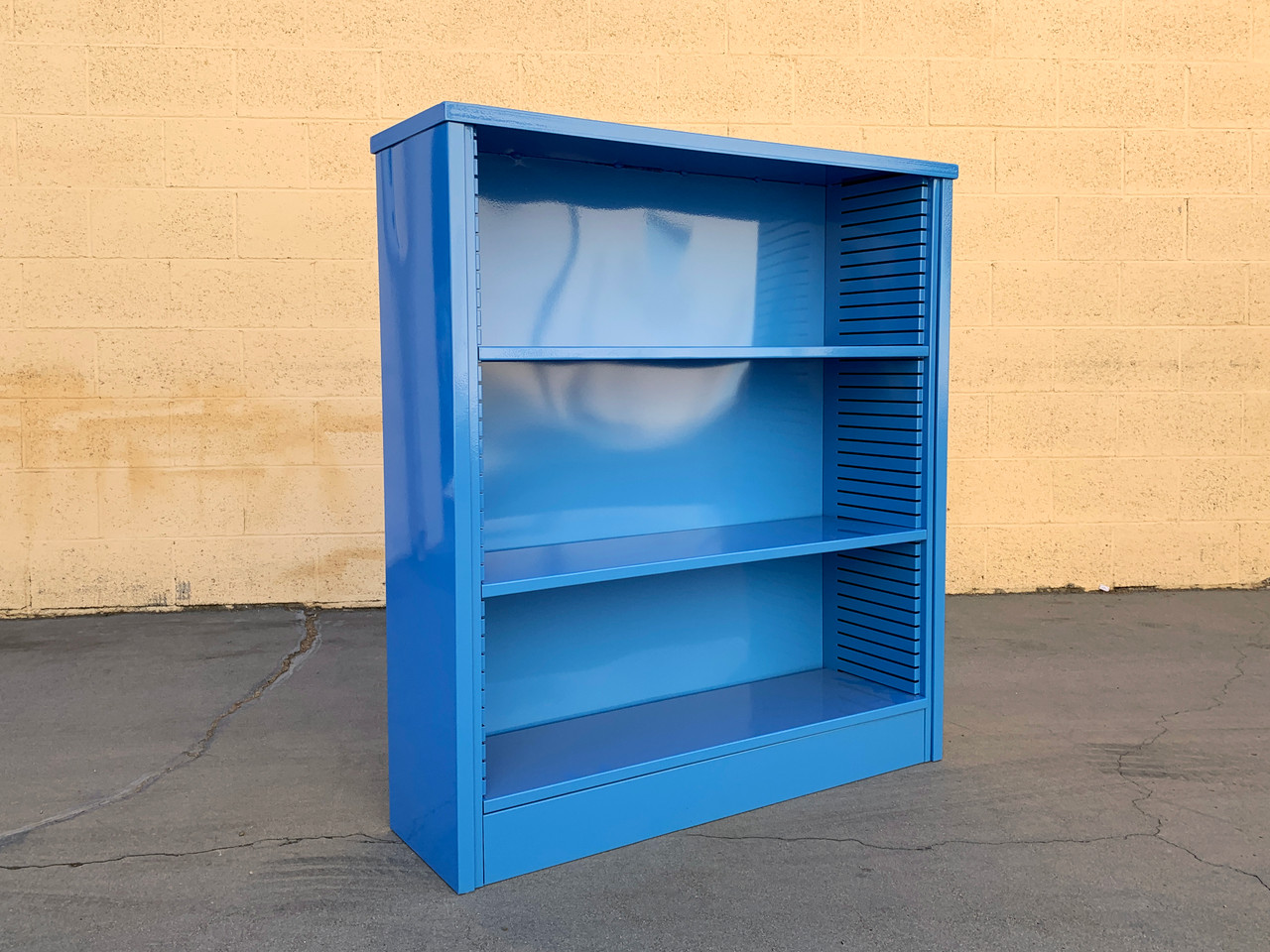 Neat 1960s tanker style steel bookcase freshly powder coated in high gloss Bright Blue (RAL5012). This adjustable 3-shelf unit is an excellent storage option– its sleek and compact, yet holds many books. It's perfect for storage and display. Please not this particular unit has a top that is slightly different than our other short tanker bookcases.