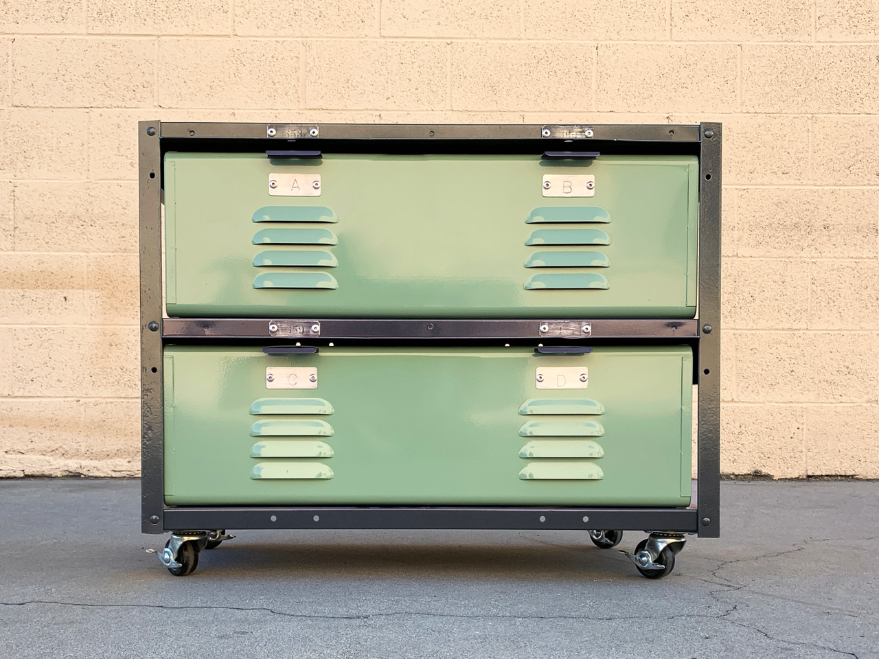Our newly fabricated locker basket units are inspired by the mid-century classics we've been refinishing for years. Featured here is a 2 x 2 unit with Sage Green baskets (RAL6021) and a natural steel frame. This unit includes two specialty double wide baskets and rolls on casters. It's the perfect storage solution for anything from tools, paper and art supplies to socks and t-shirts. Bins feature option to add a lock.