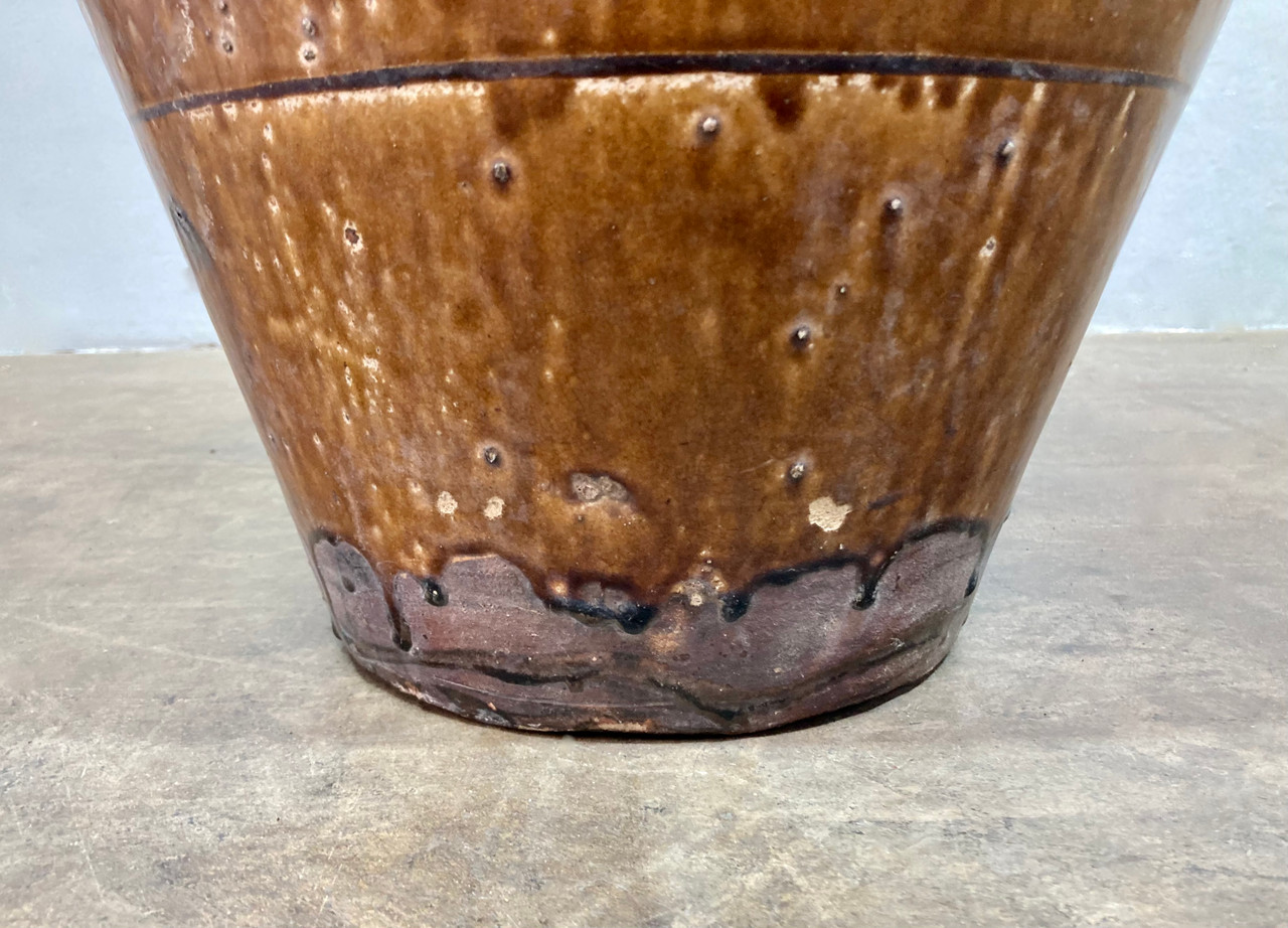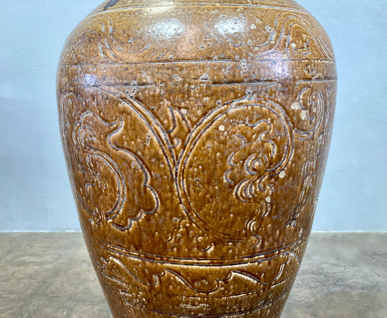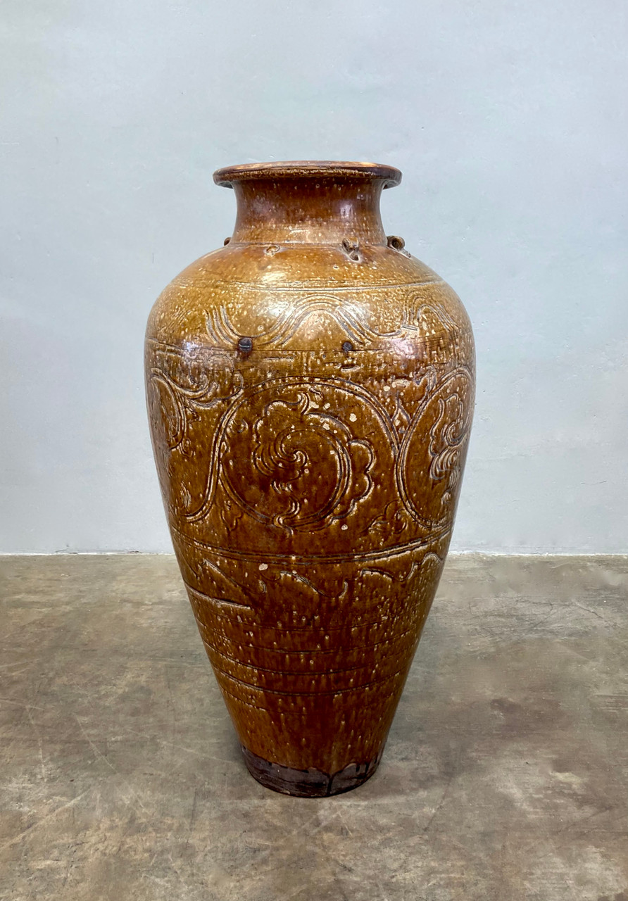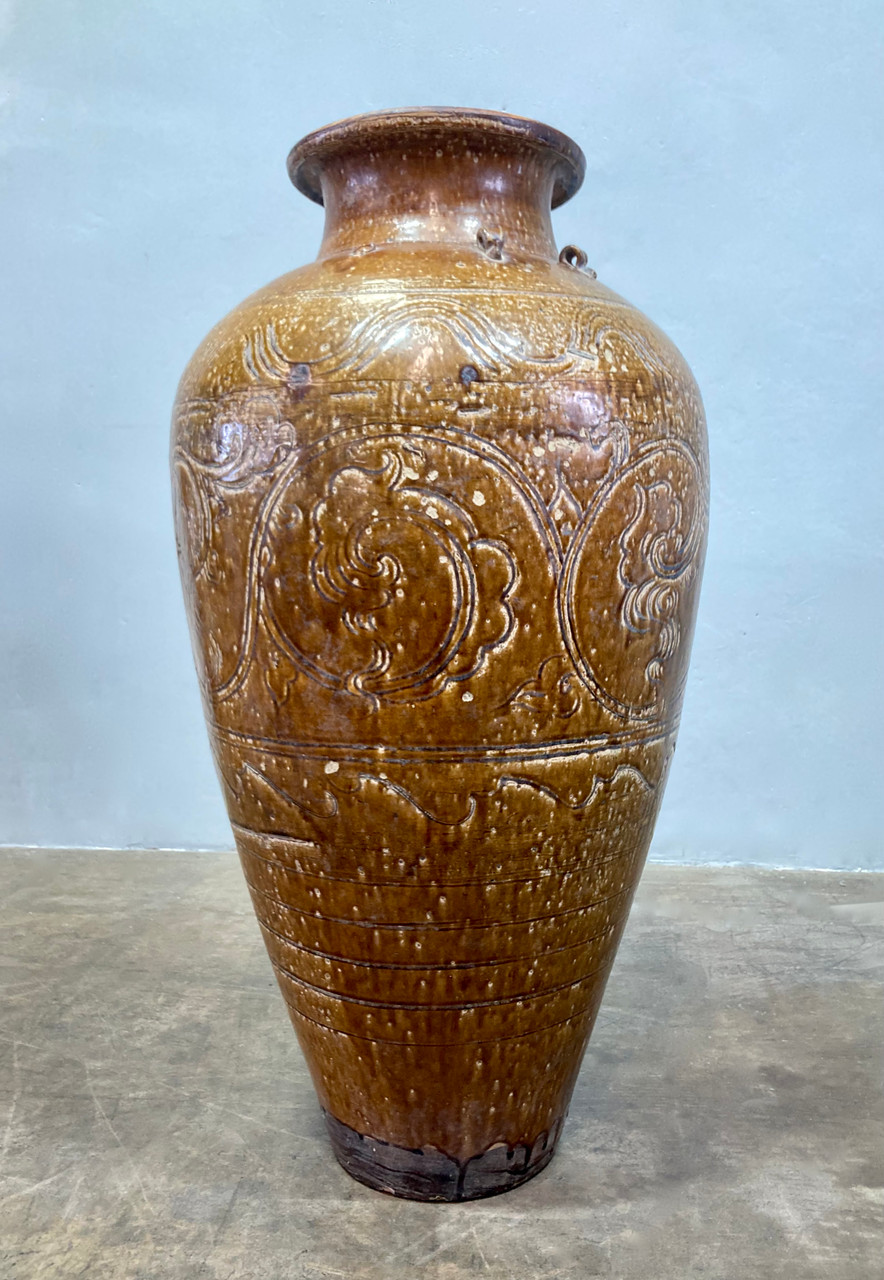 Large sculptural Martaban glazed earthenware urn. Chinese or South-East Asian style, likely dating from the late 18th or early 19th Century. Heavy rough ceramic interior with glazed pale brown finish. Organic filigree and geometric designs decorating the exterior.
