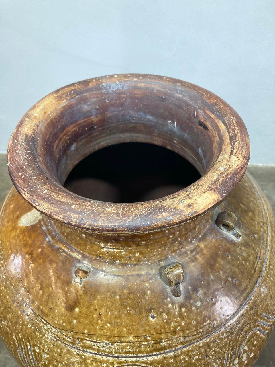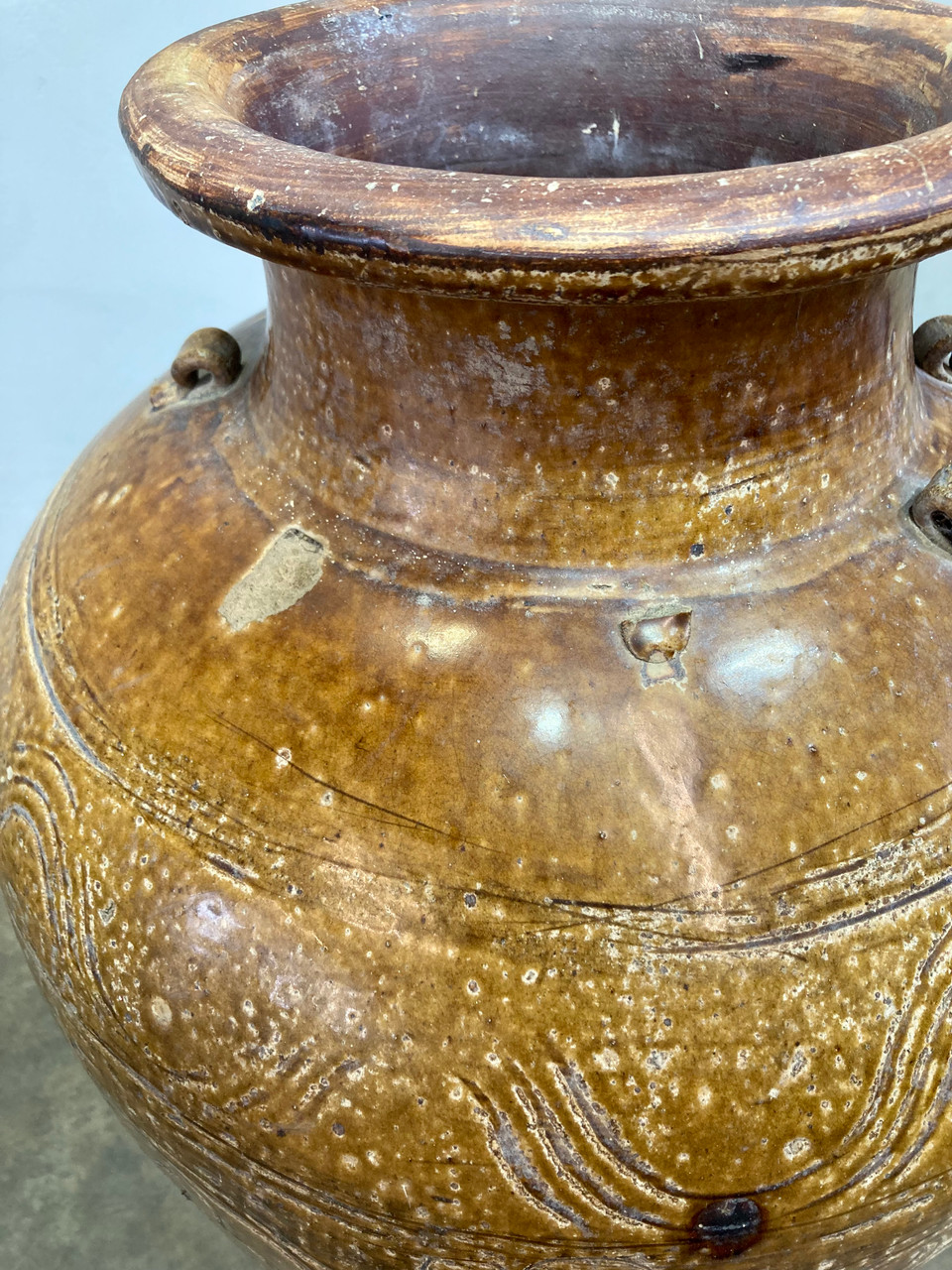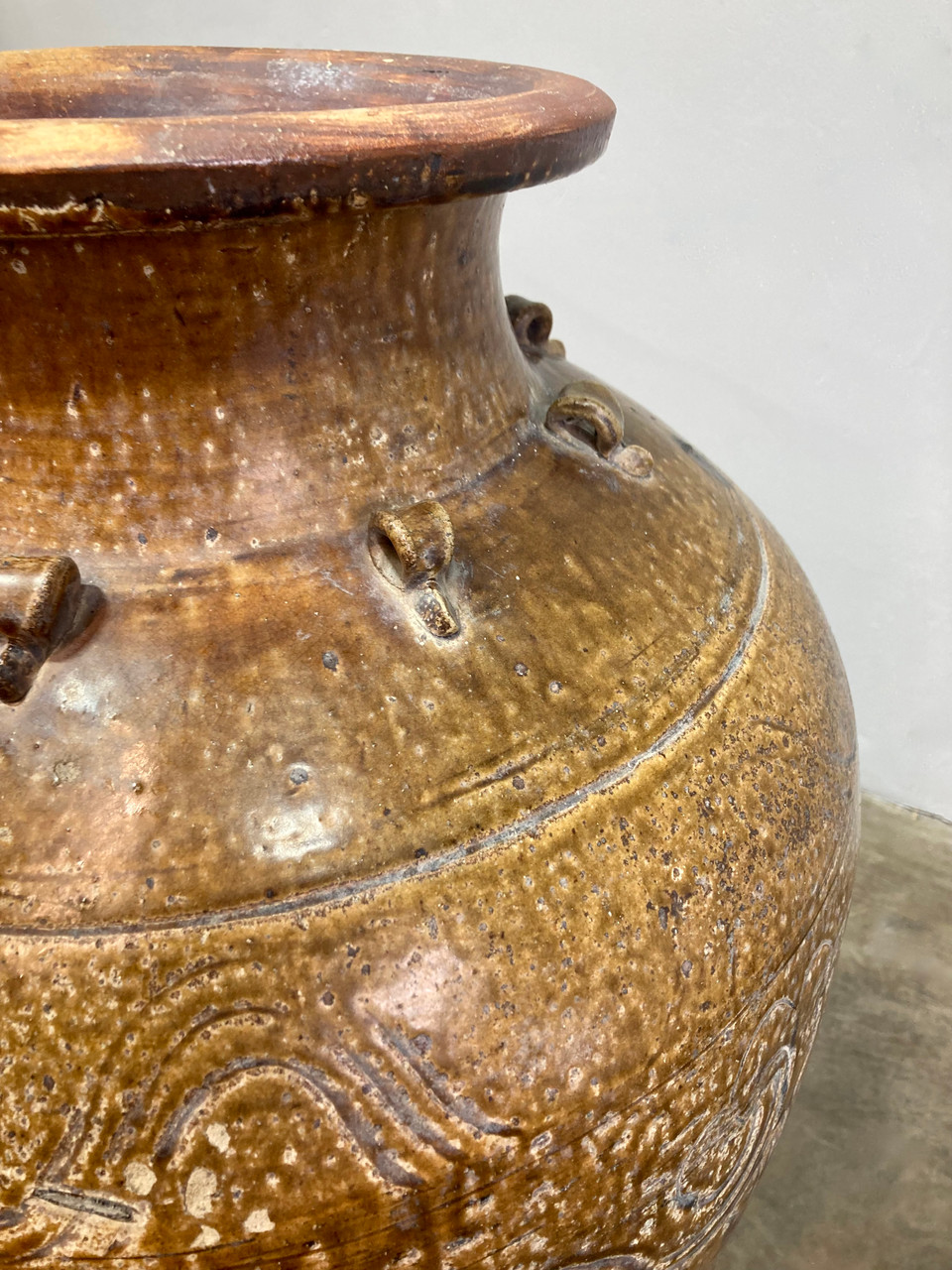 Large sculptural Martaban glazed earthenware urn. Chinese or South-East Asian style, likely dating from the late 18th or early 19th Century. Heavy rough ceramic interior with glazed pale brown finish. Organic filigree and geometric designs decorating the exterior.