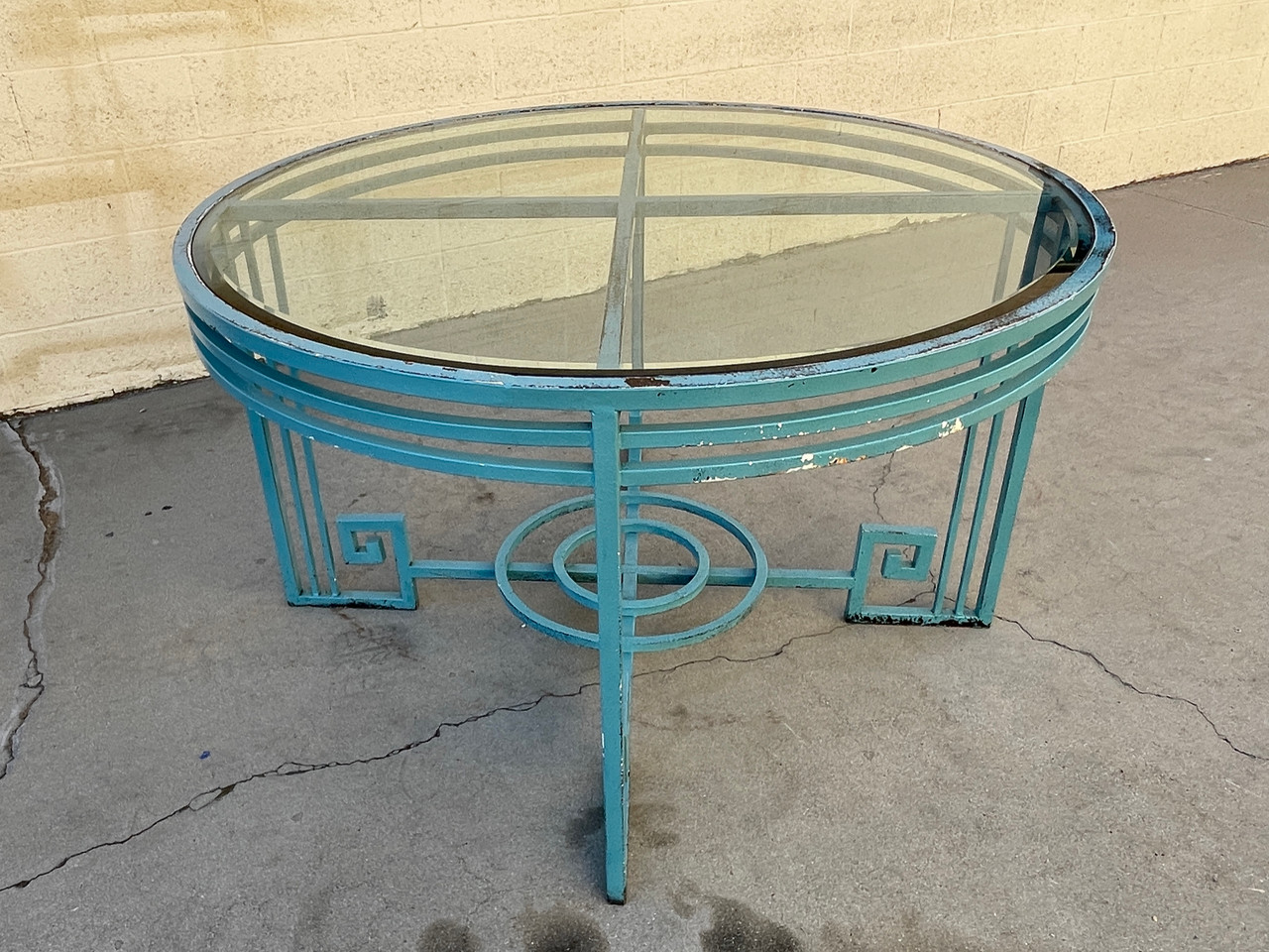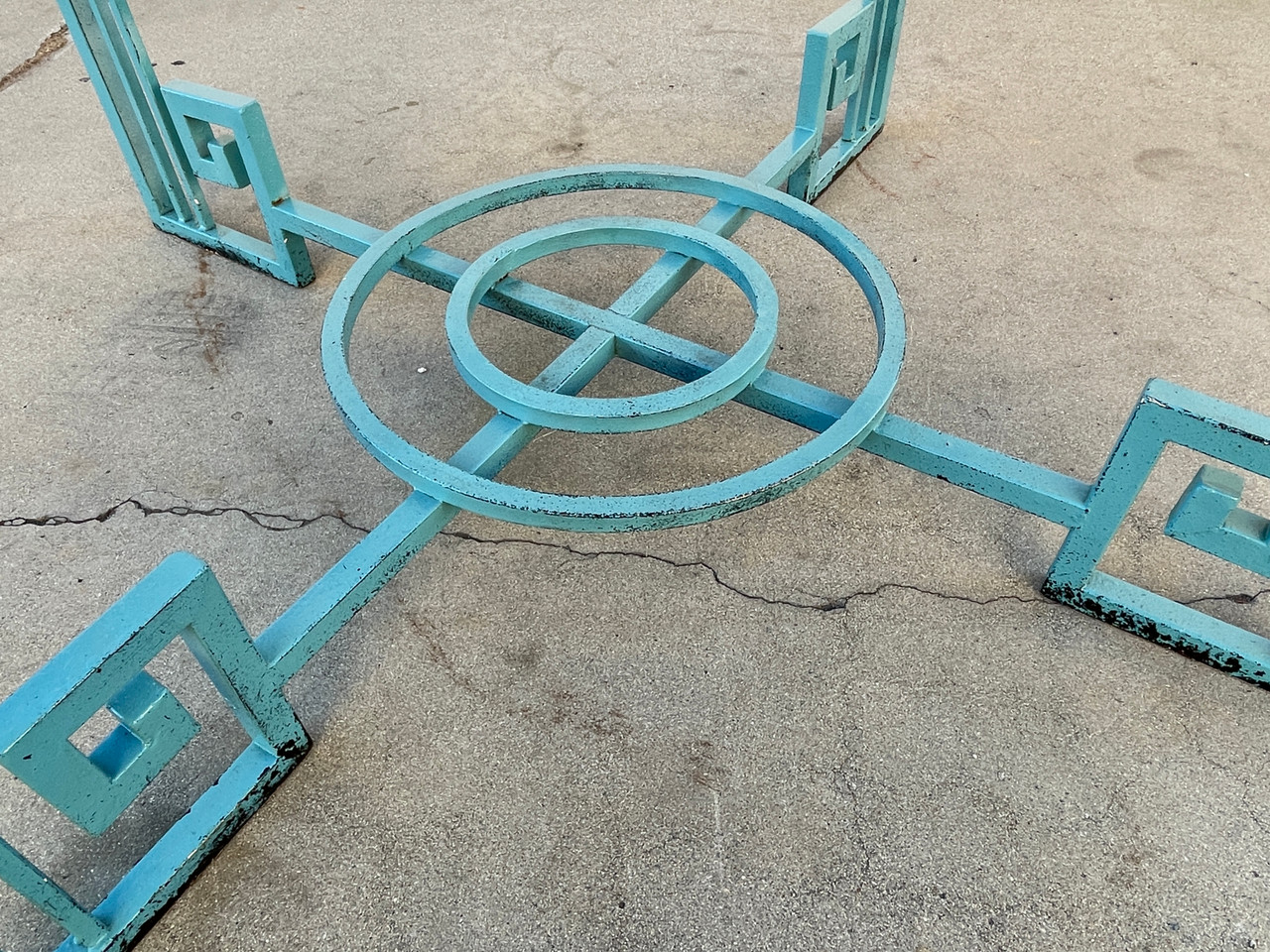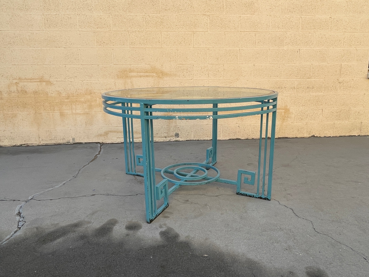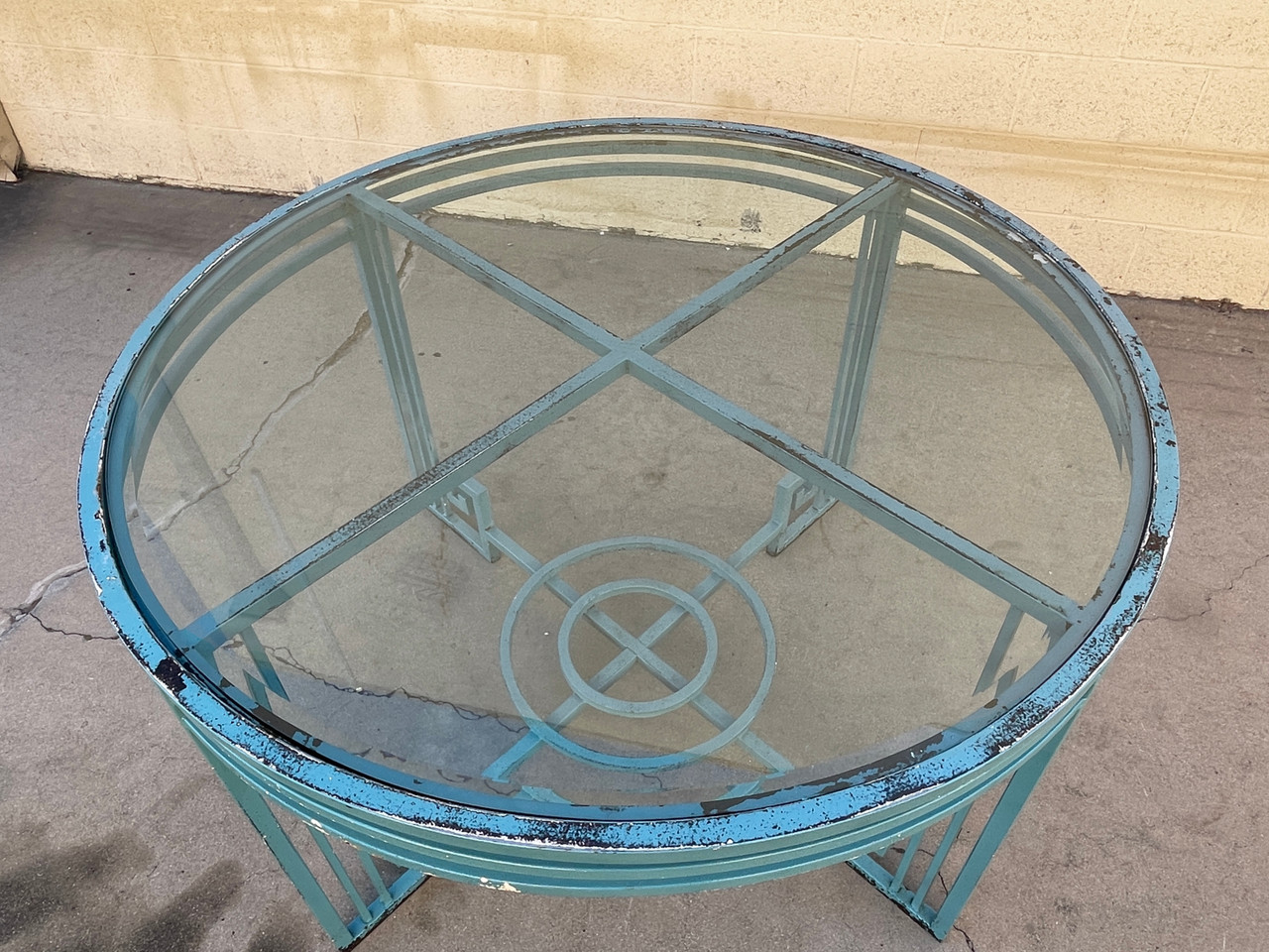 Custom made Deco patio table with 1/2" beveled glass top. Cool turquoise distressed paint finish. Great for inside or outside use. HEAVY!