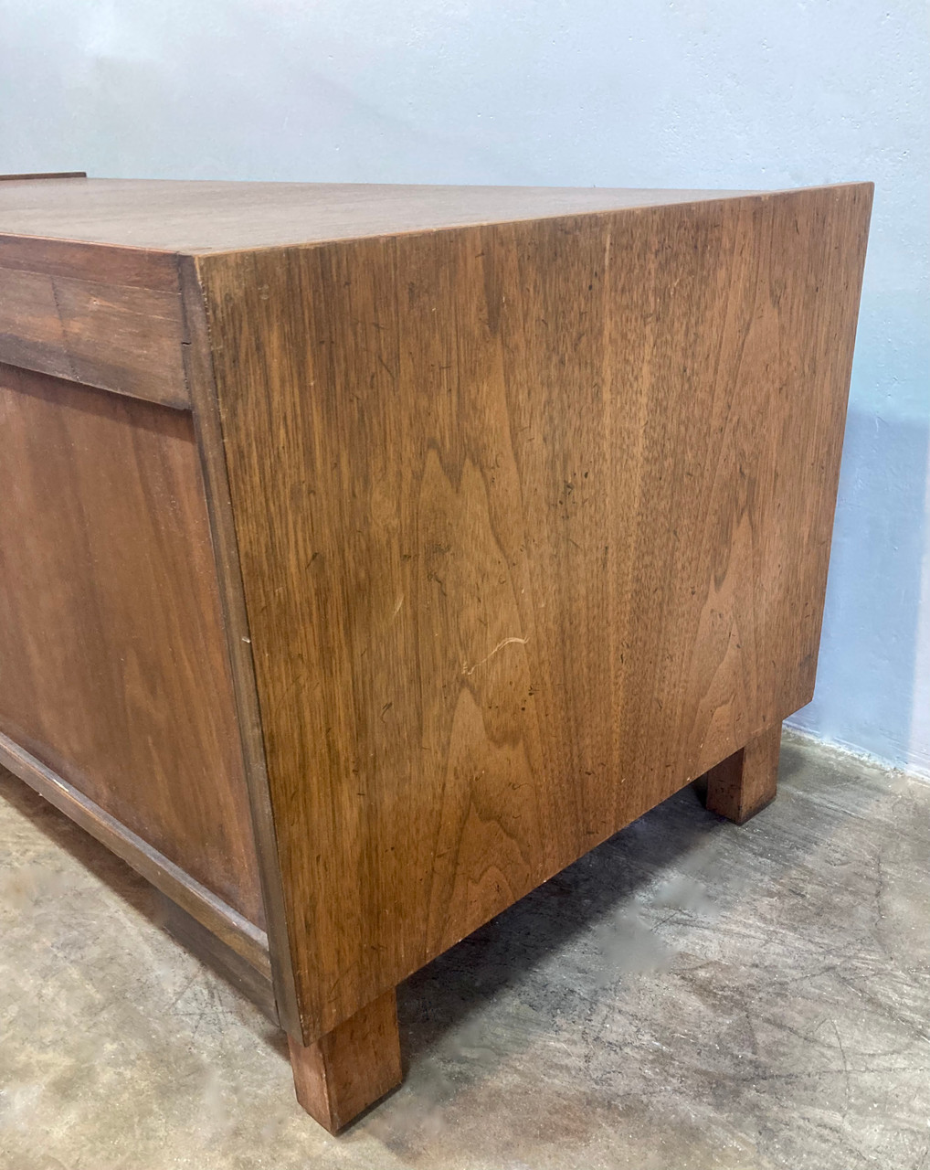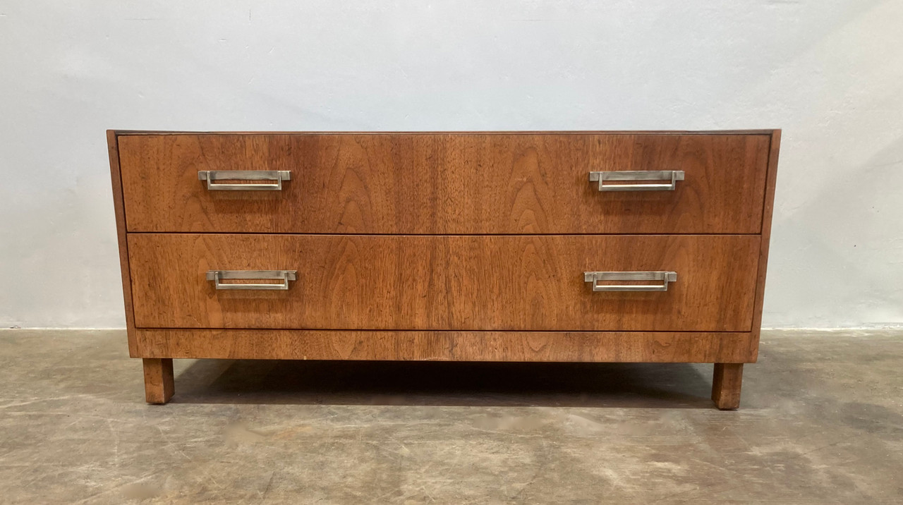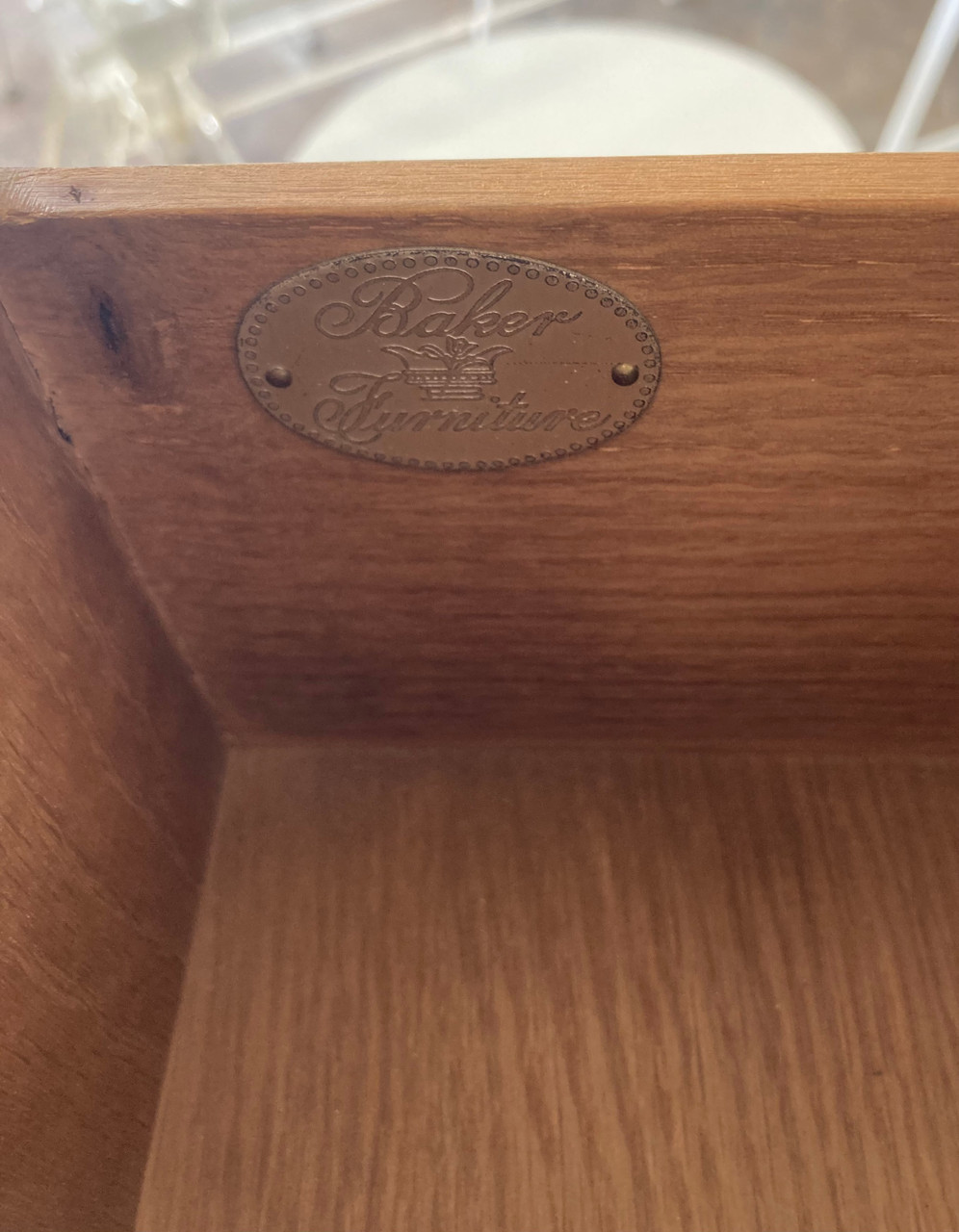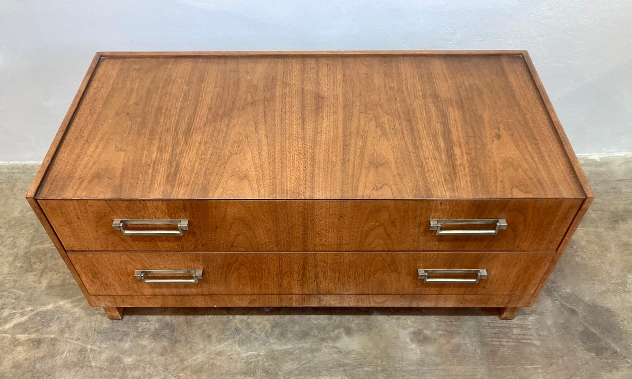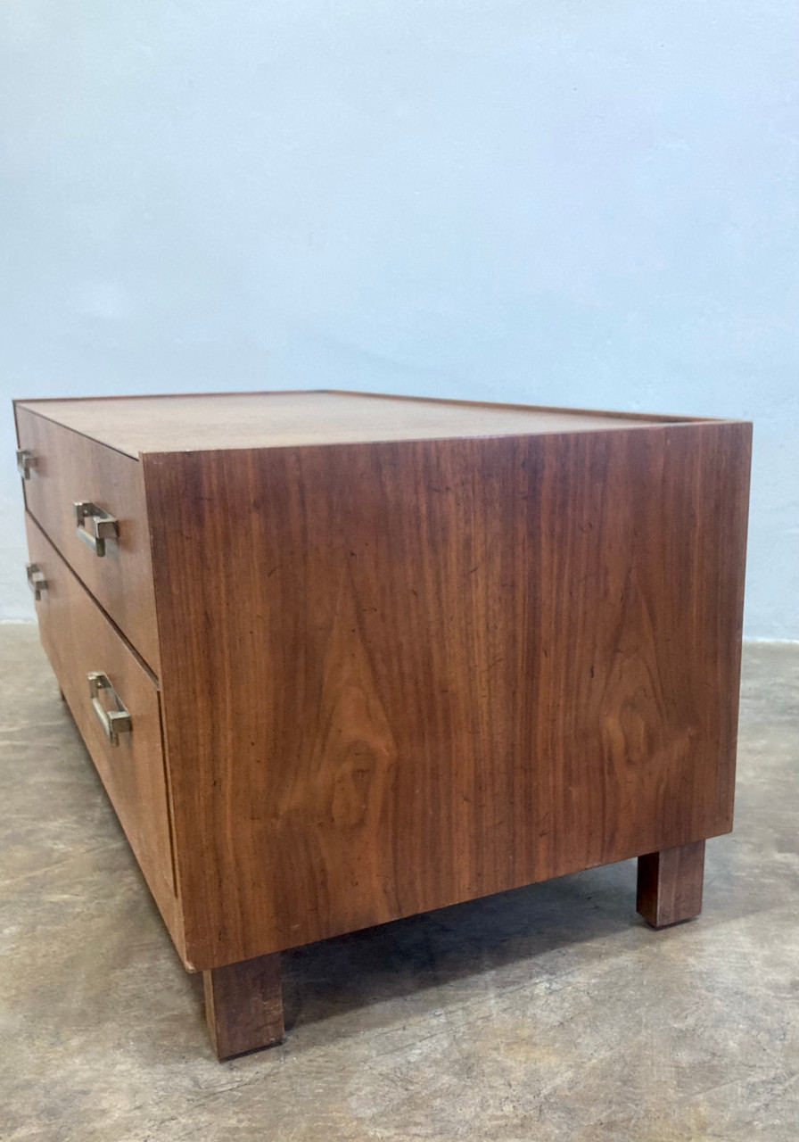 Walnut two-drawer chest by Baker Furniture. In great vintage condition from the 1960's. Brass hardware and solid walnut legs. Perfect for use as a console chest or bedroom storage. Dovetail joints connecting the drawers to the front pieces.