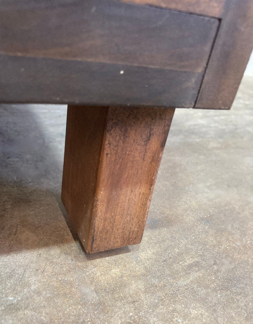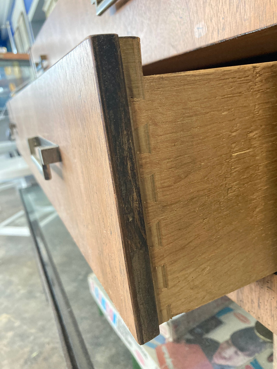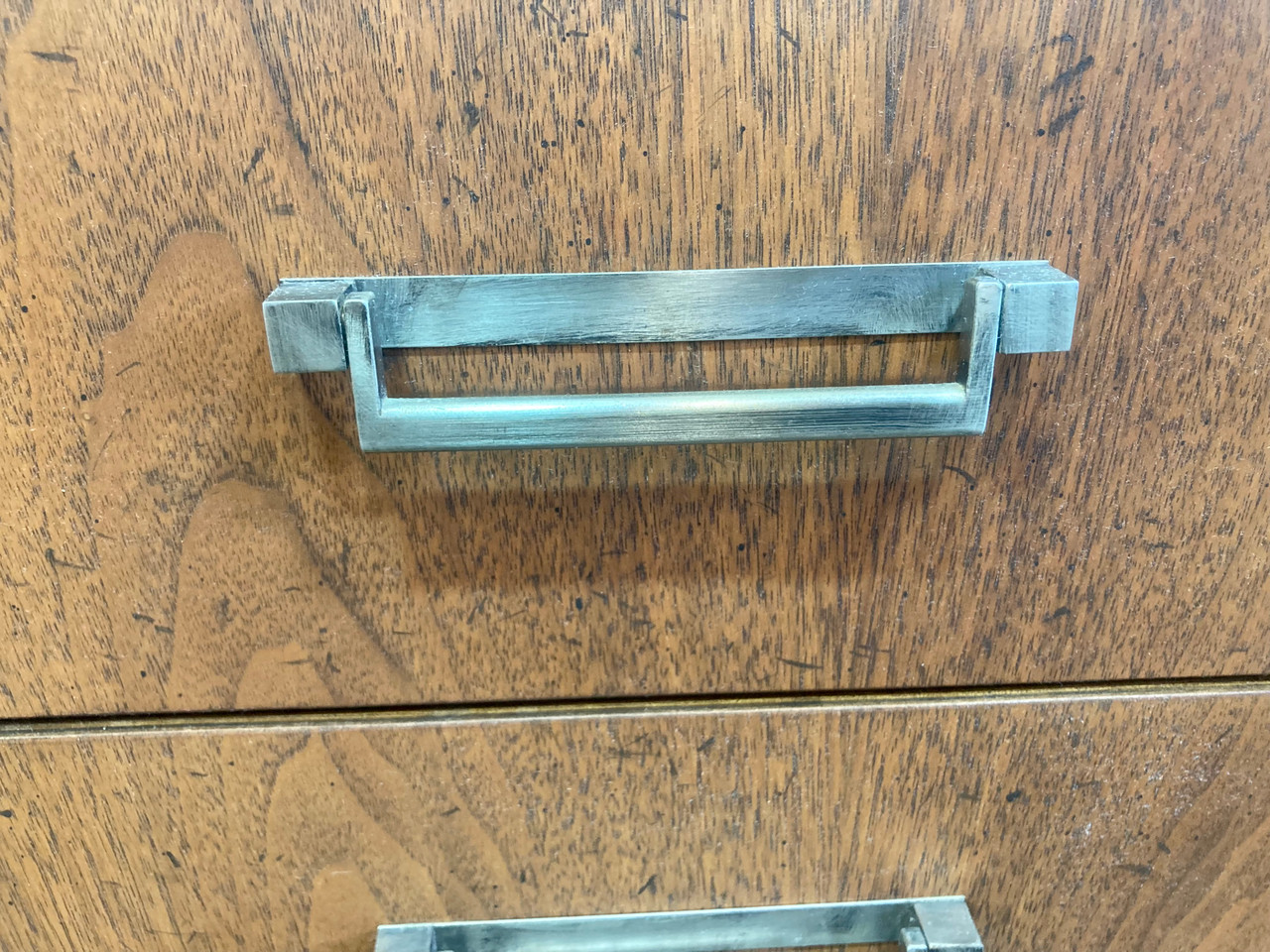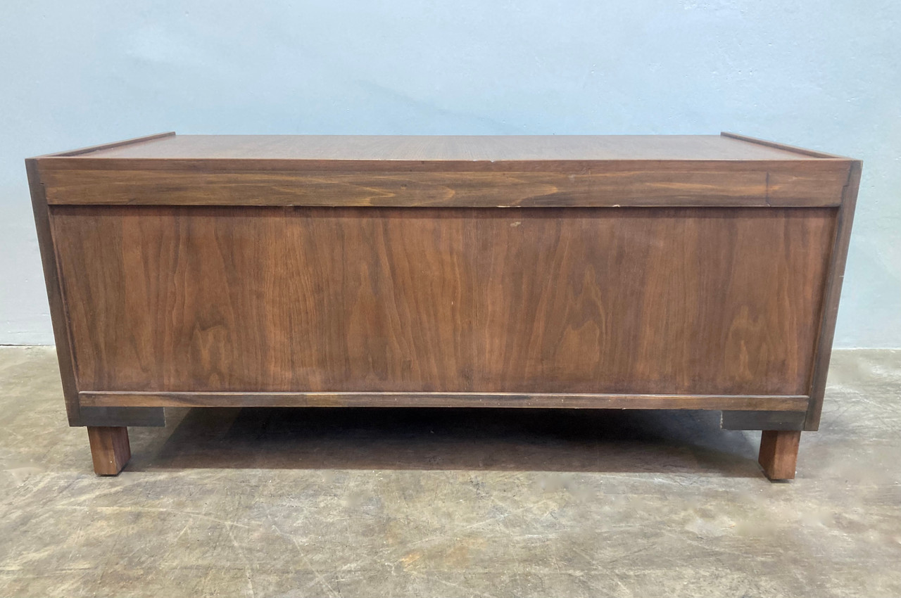 Walnut two-drawer chest by Baker Furniture. In great vintage condition from the 1960's. Brass hardware and solid walnut legs. Perfect for use as a console chest or bedroom storage. Dovetail joints connecting the drawers to the front pieces.