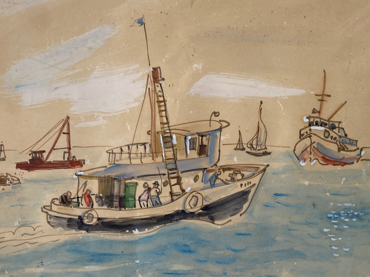Vintage painting of Portofino California by George Shellhase. Gorgeous landscape painting of fishermen on boats. In excellent vintage condition as pictured.