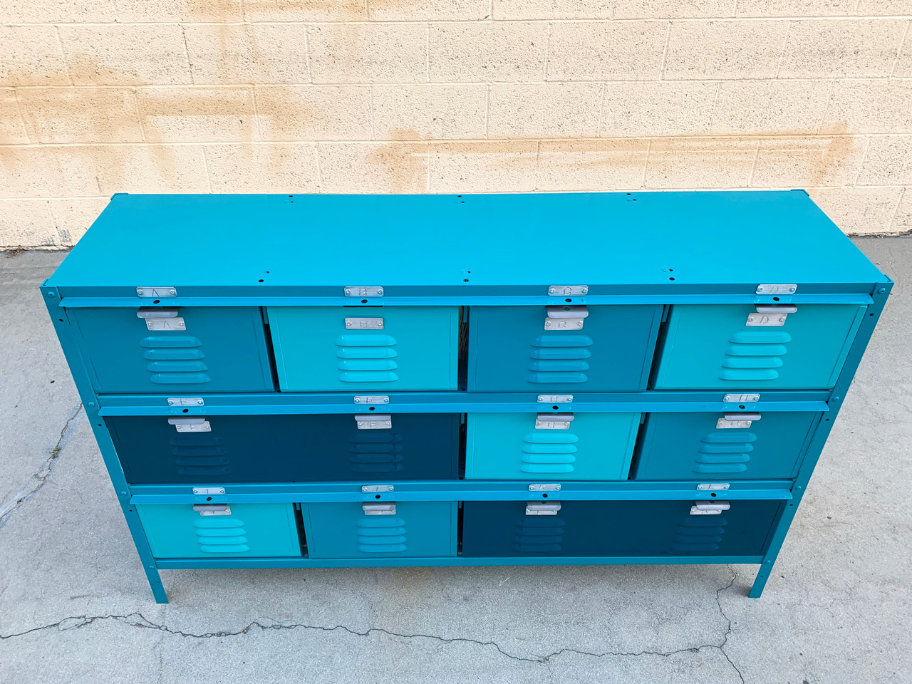 Custom made 4 x 3 locker basket unit with baskets in shades of teal. Pictured unit features a combination of single wide and double wide baskets.