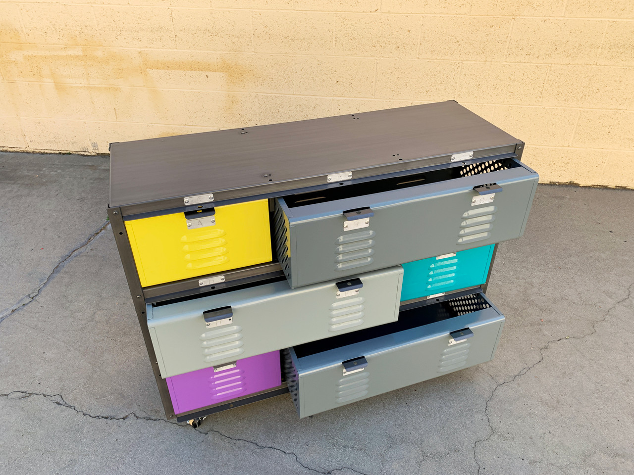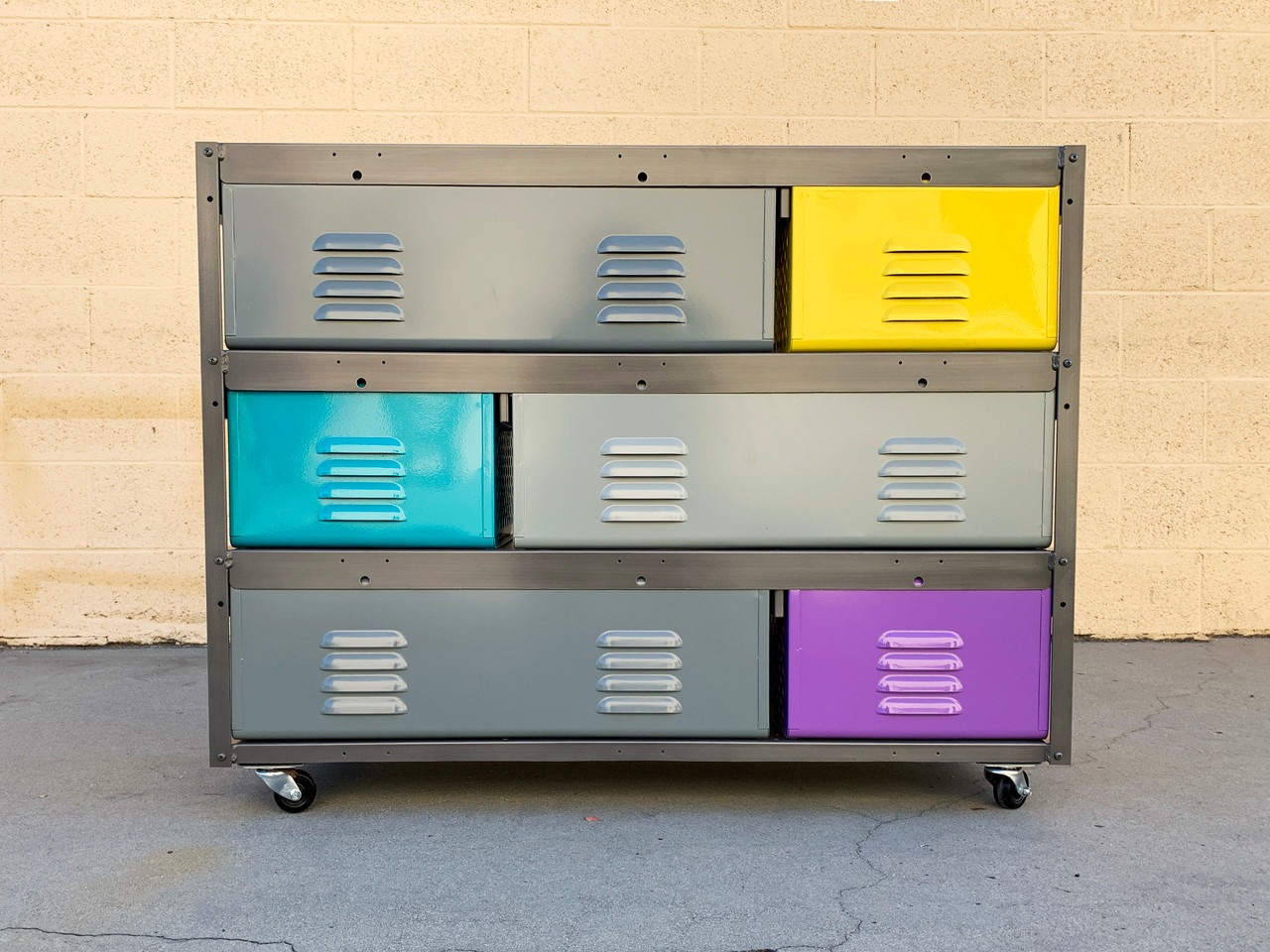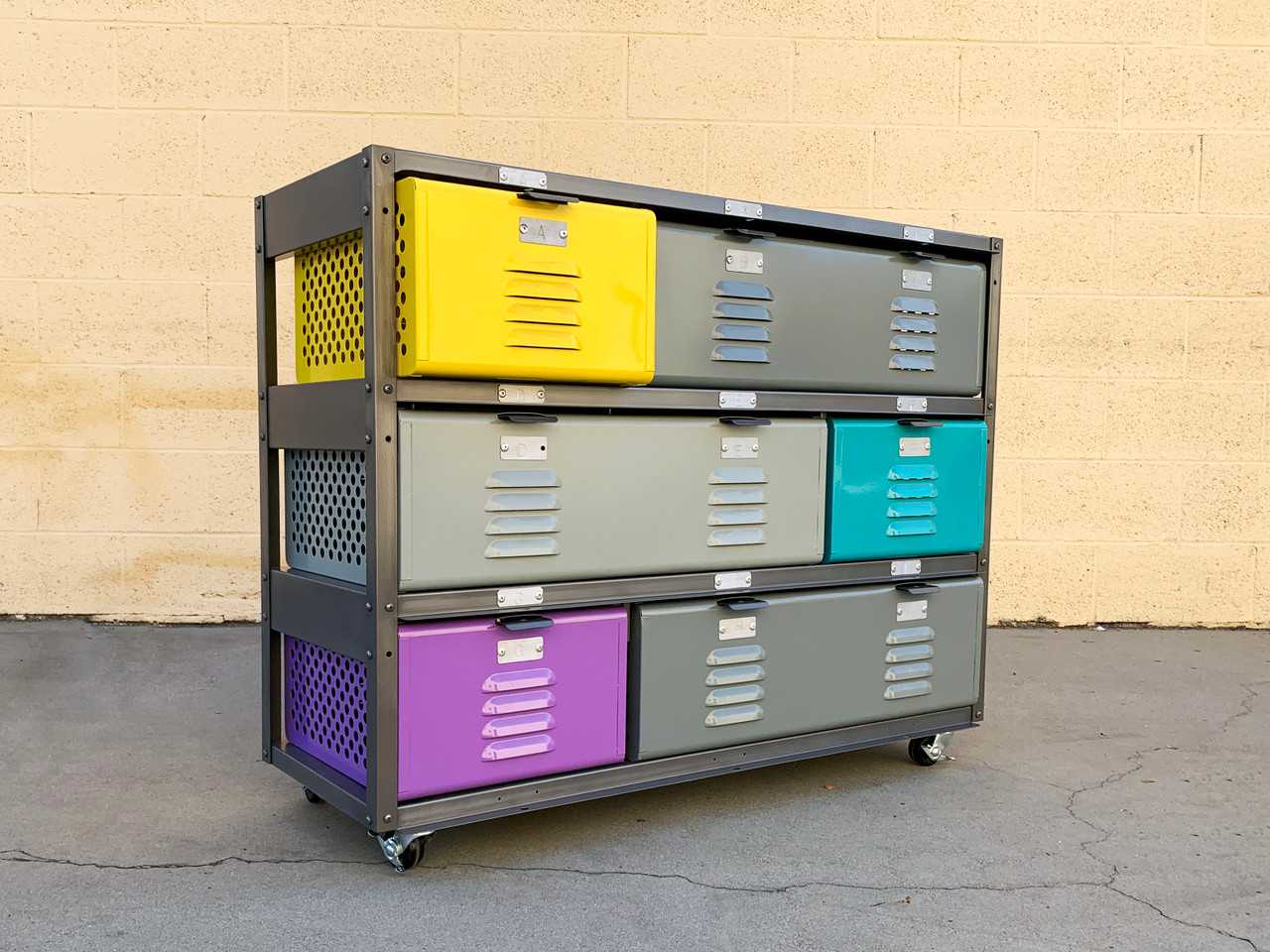 All new, custom fabricated 3 wide x 3 high locker basket unit inspired by those of the 1950s and 60s. Our new units feature a special update: 3 double-wide size baskets for extra storage. Drawers feature capability to add lock. This unit is designed with casters for easy mobility.