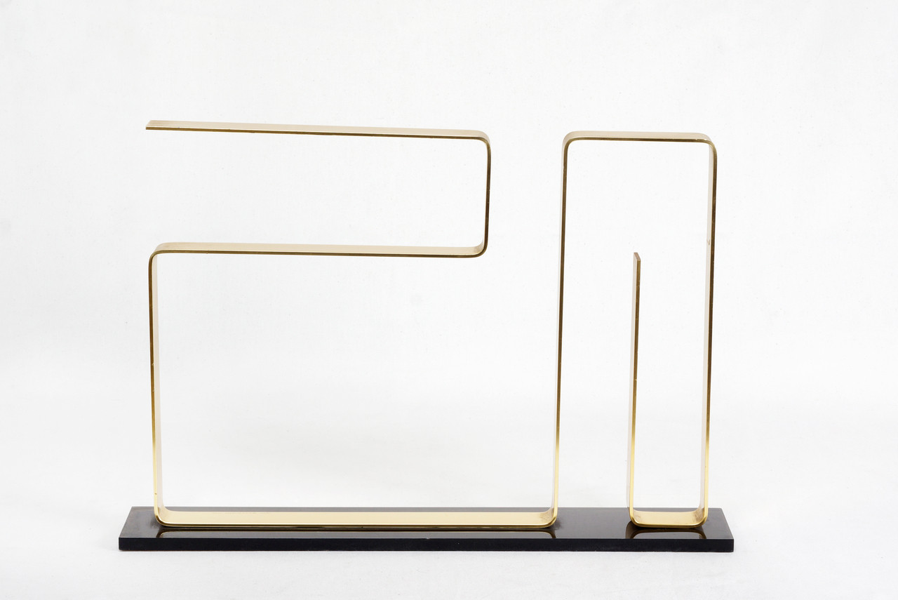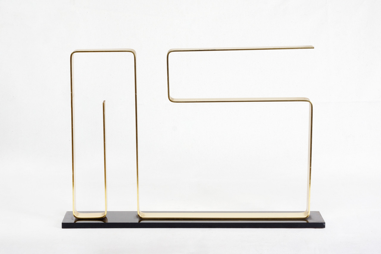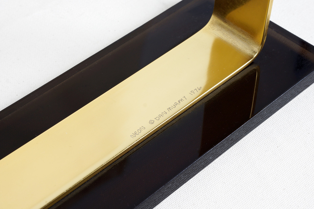 Extraordinary brass sculpture by American artist Dan Murphy. A single strip of bent brass sits on an acrylic base, abstracting the letters in the word NEON to create a dynamic, modernist form. Signed, titled and dated 1976. Please note small (1/4") flaw on base.