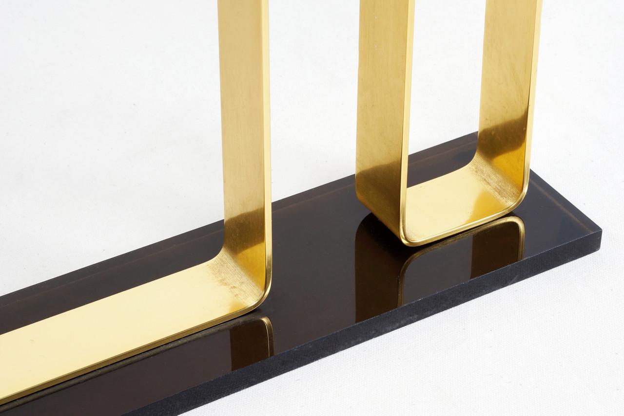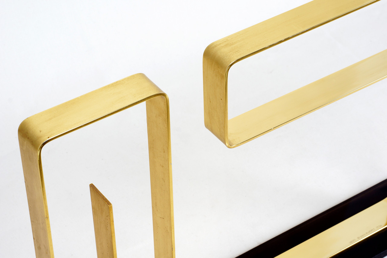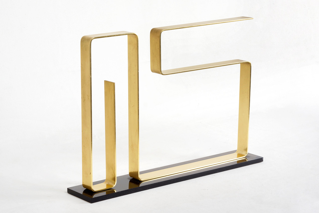 Extraordinary brass sculpture by American artist Dan Murphy. A single strip of bent brass sits on an acrylic base, abstracting the letters in the word NEON to create a dynamic, modernist form. Signed, titled and dated 1976. Please note small (1/4") flaw on base.