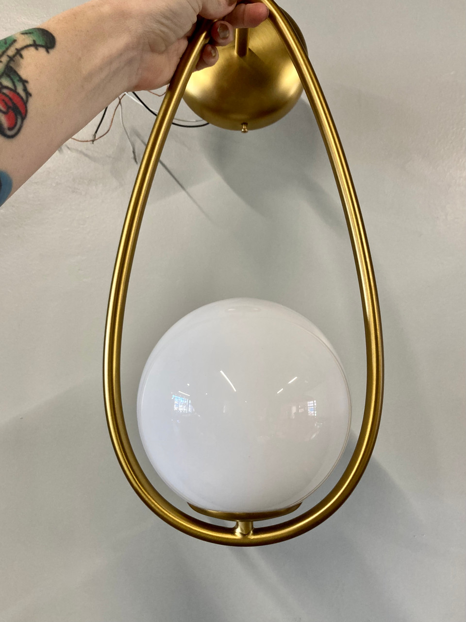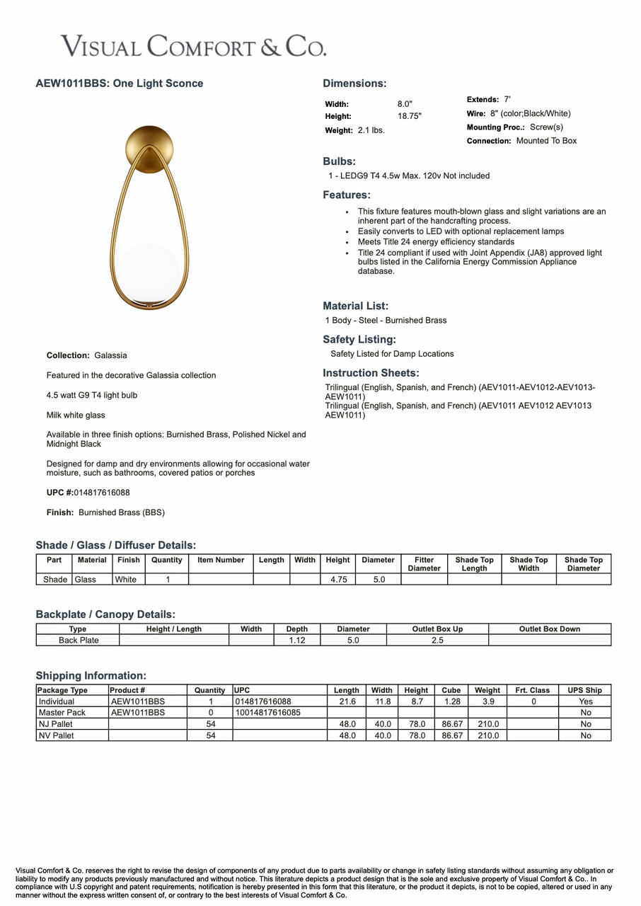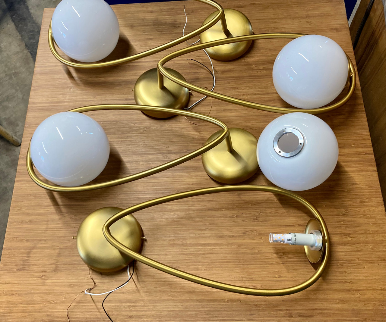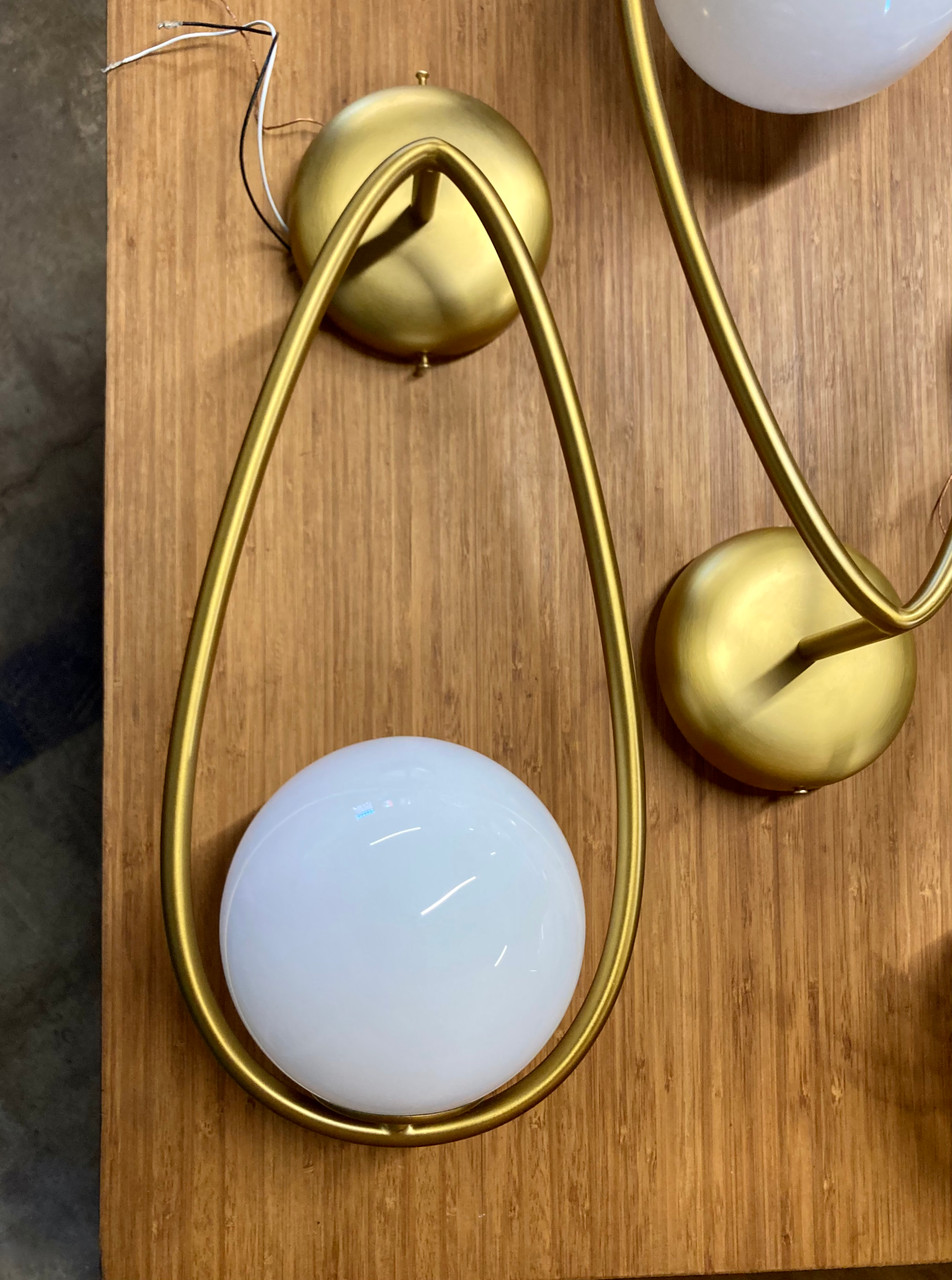Kinetic sculpture-inspired sconce made by Visual Comfort. Steel frame is made of steel with a burnished brass finish. Milk glass bulbs easily screw into frame. Sold individually or as a set of four. See tear sheet for additional details.