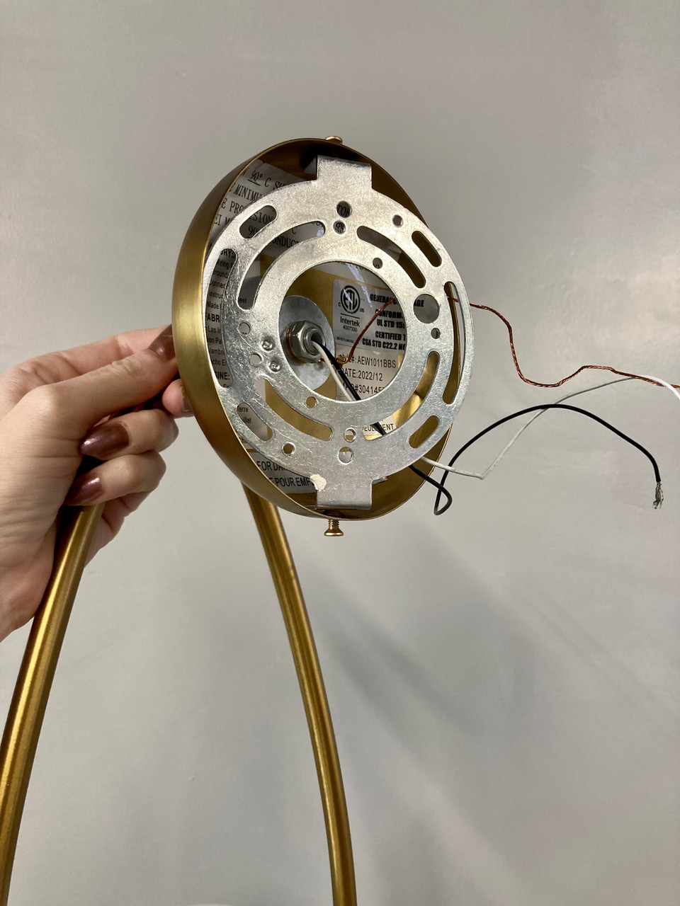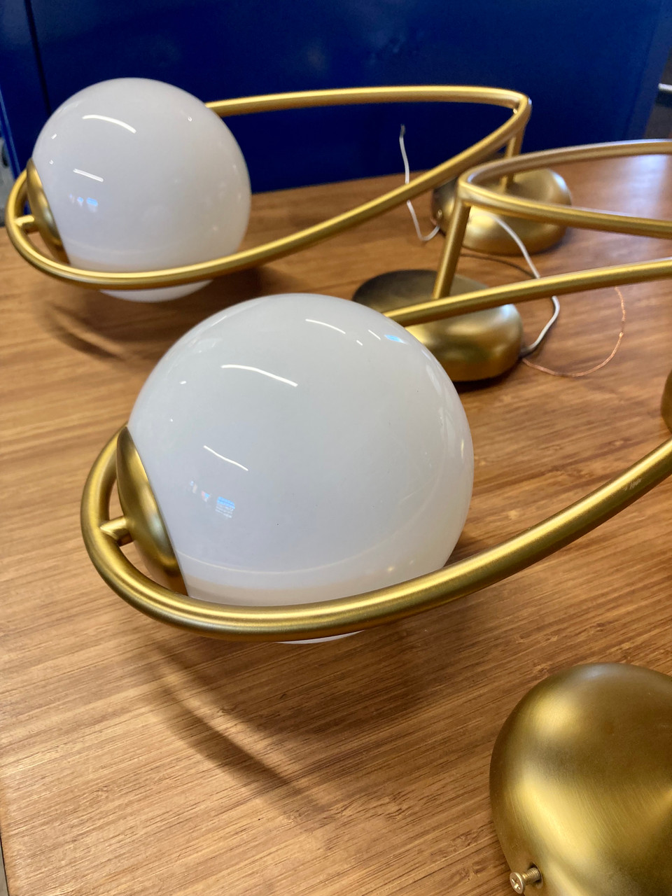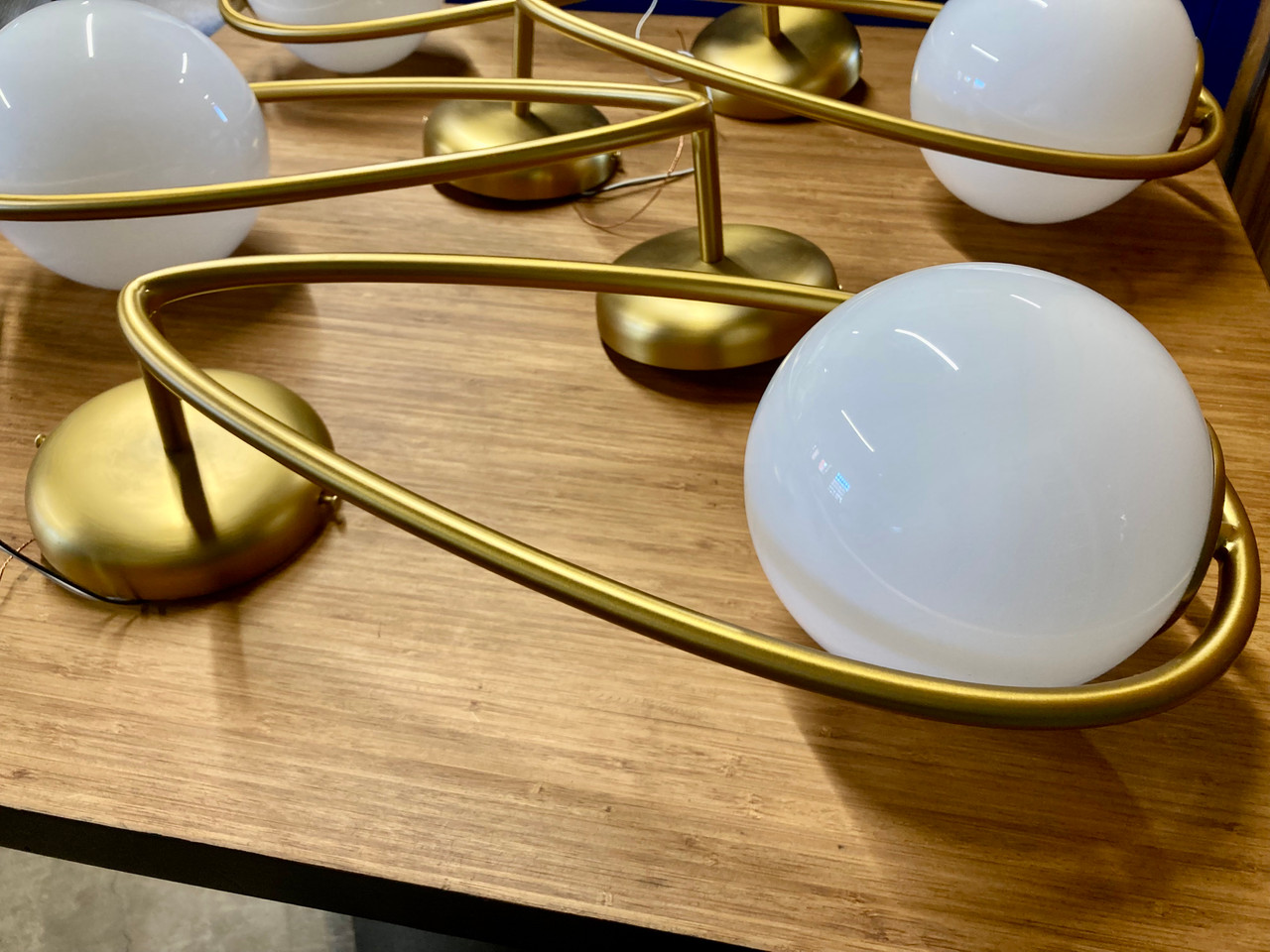 Kinetic sculpture-inspired sconce made by Visual Comfort. Steel frame is made of steel with a burnished brass finish. Milk glass bulbs easily screw into frame. Sold individually or as a set of four. See tear sheet for additional details.