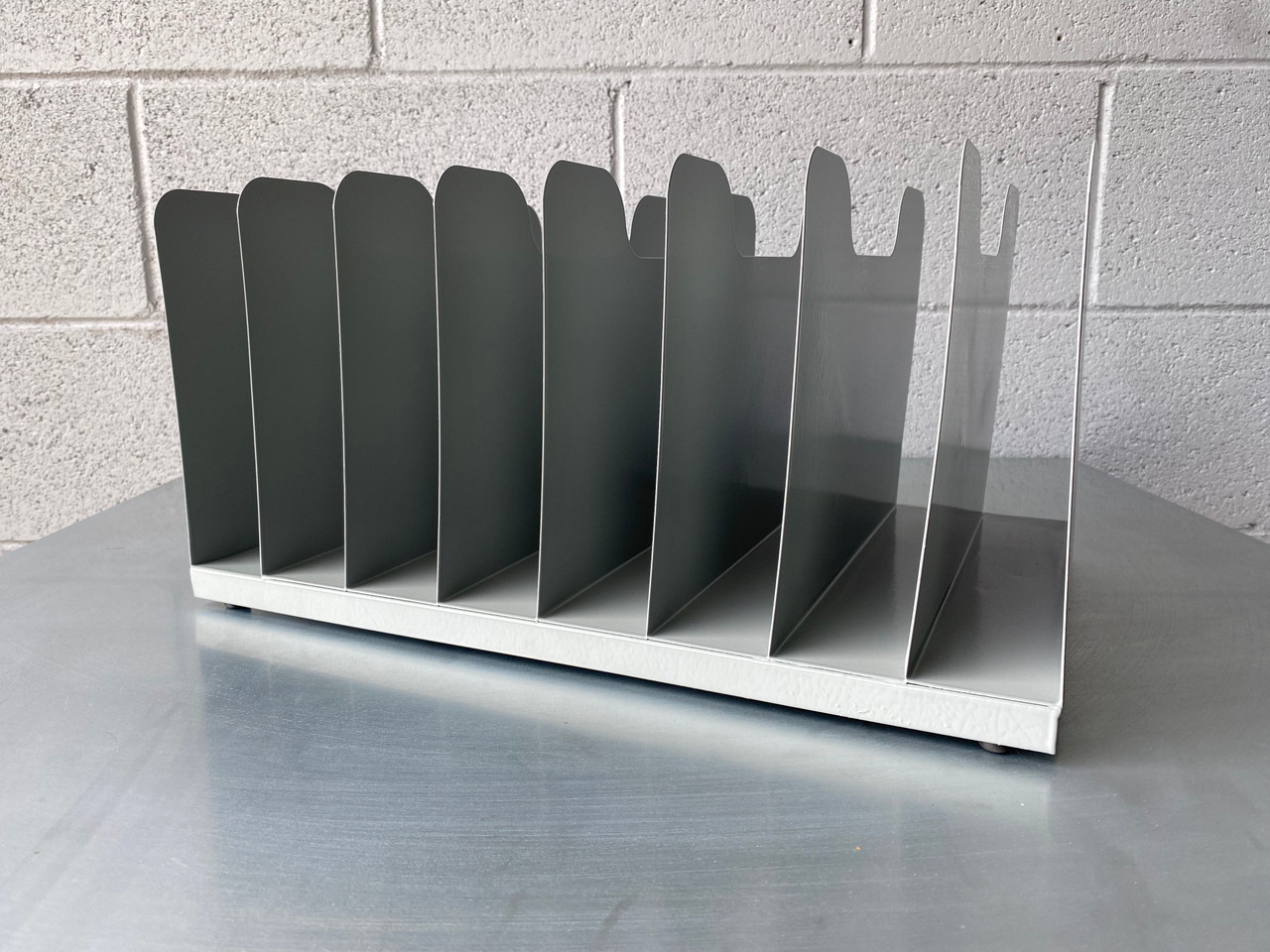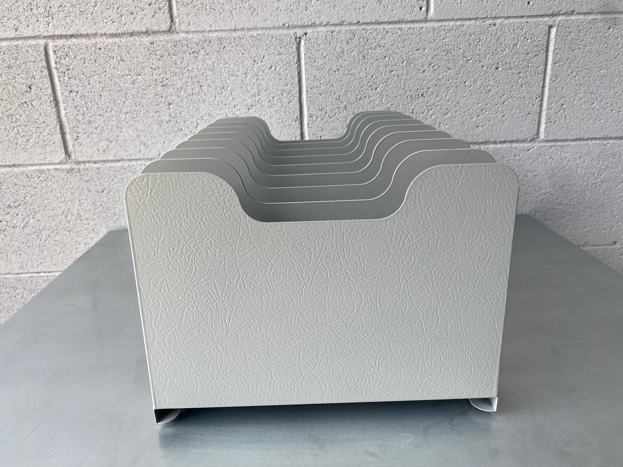 1970s retro office file / paper / magazine holder stripped and freshly powder coated in Cloudy Grey (GR16). Features 8 paper slots sure to keep your mid-century modern desk in tip-top shape. Easily wall-mounts.