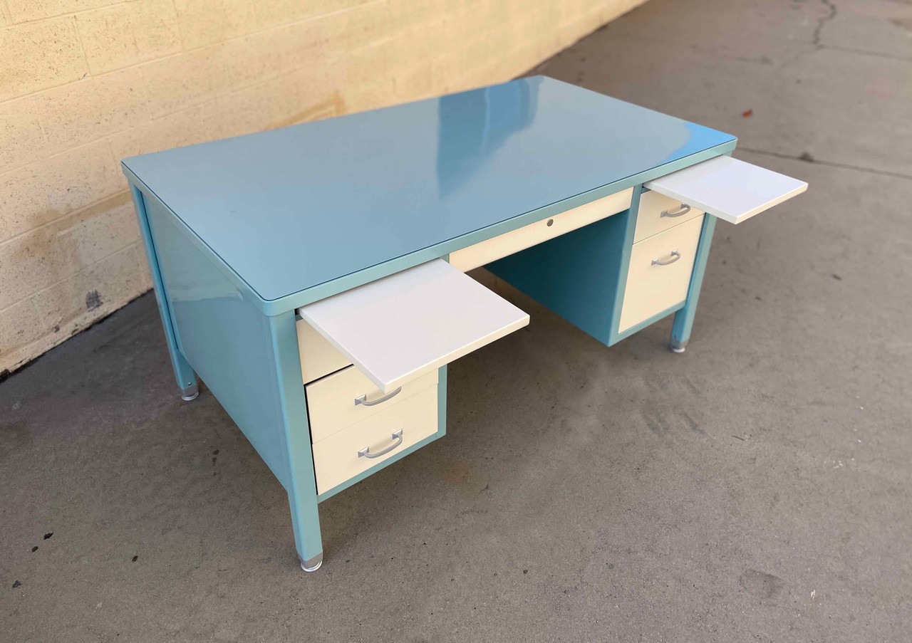 1940s double pedestal tanker stick leg desk. Refinished in two-tone sea foam (RAL6027) and gloss cream. Features a long and narrow table top with ample drawer space for file storage. Complete with brushed aluminum pulls, this retro beauty is ready to add flare to your office.