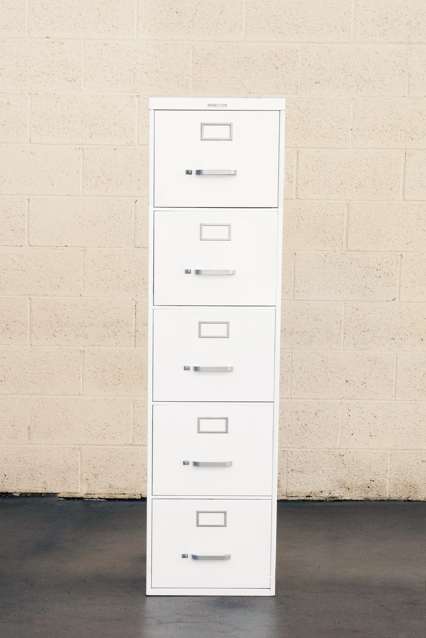 1970s tanker style steel file cabinet refinished in gloss white with brushed aluminum hardware. Vertical 5-drawer configuration. Please note, our file cabinets are refinished to order; the models we refinish are of similar style and era, but will very based on availability.