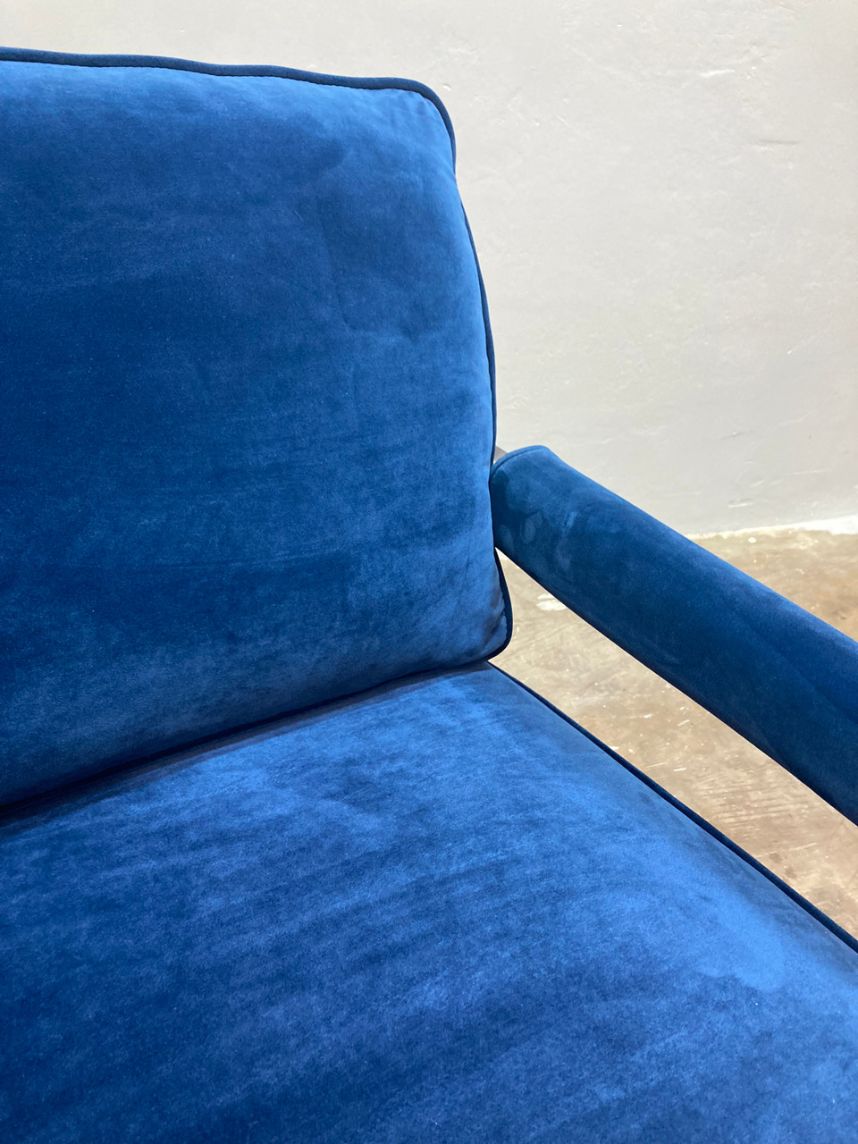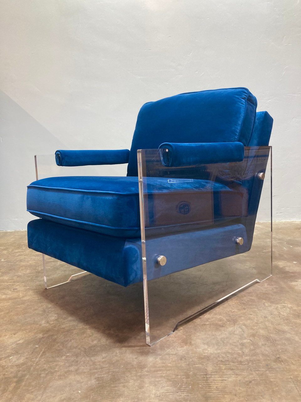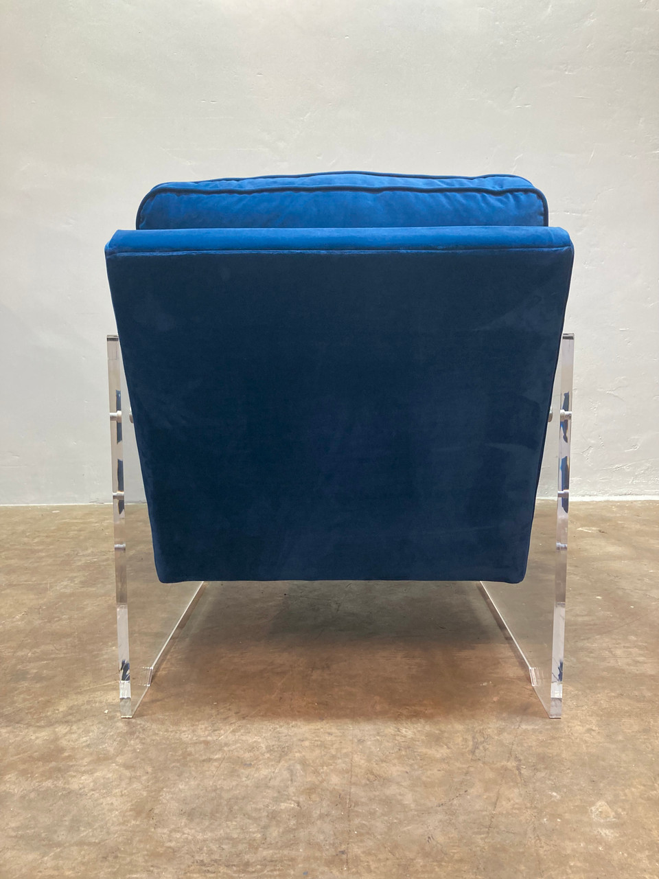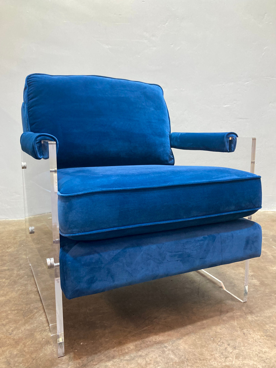 Beautiful armchair, constructed with a translucent acrylic frame and upholstered in deep blue velvet. The practical design is comfortable for lounging, while being a striking design element in any room. Chair is in excellent vintage condition, as pictured.