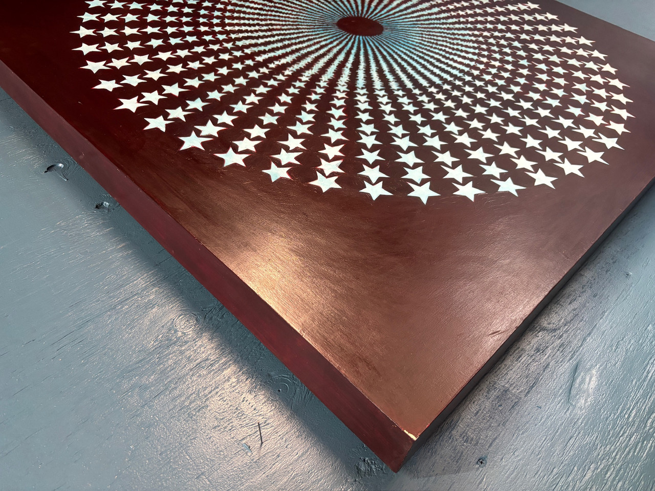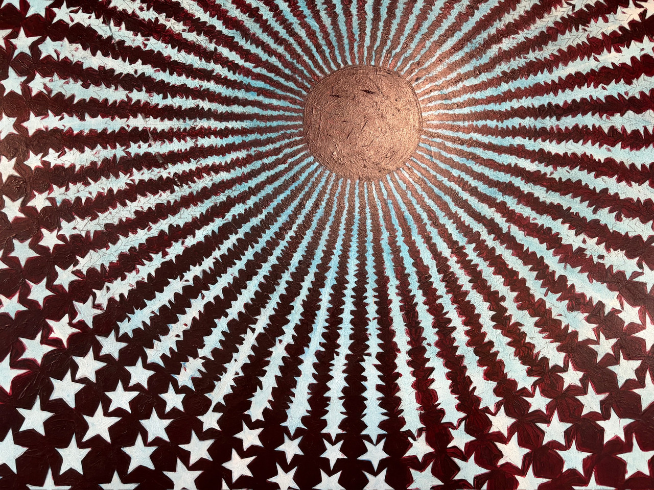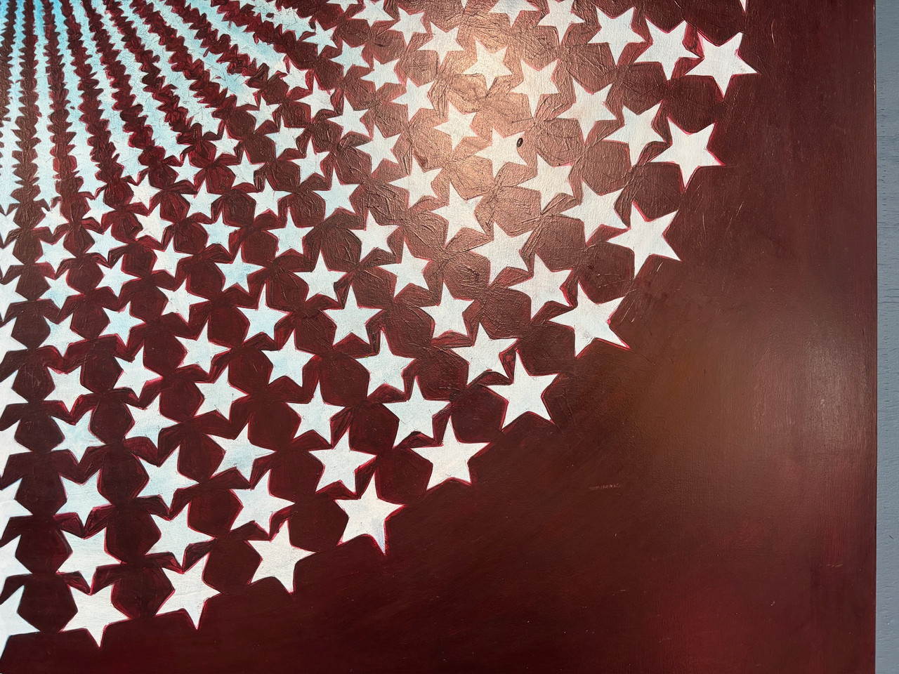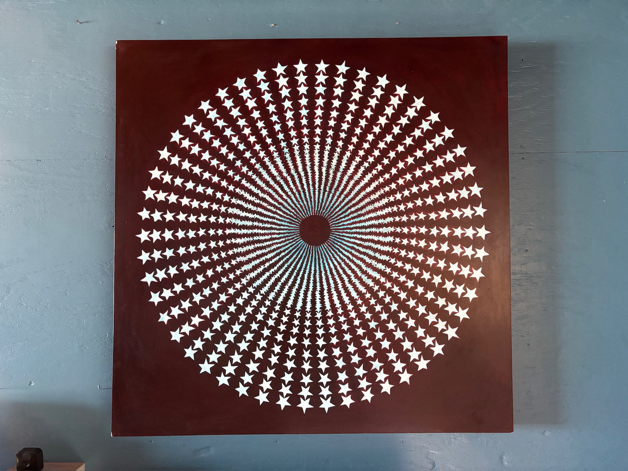 Original oil on wood-panel painting by Turkish artist, Hatice Güleryüz. Symmetrical design of repeated star motifs. Painted in colors of Ox-blood, Pale blue, and white.