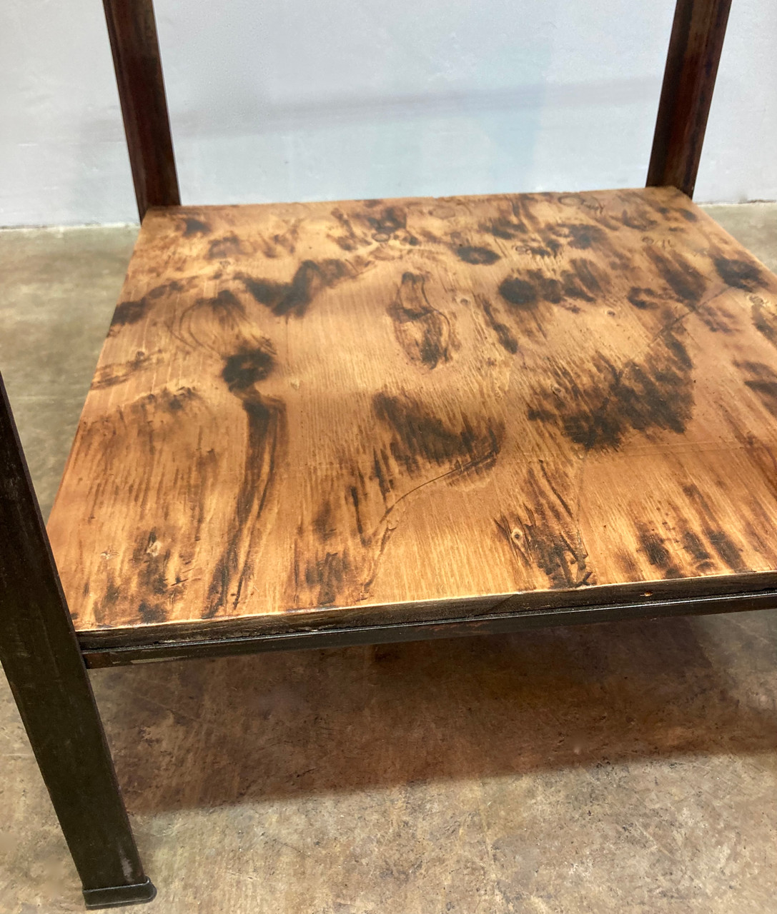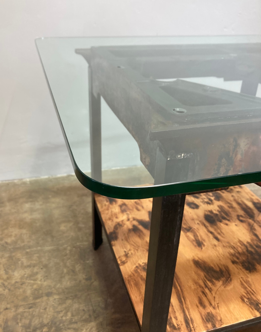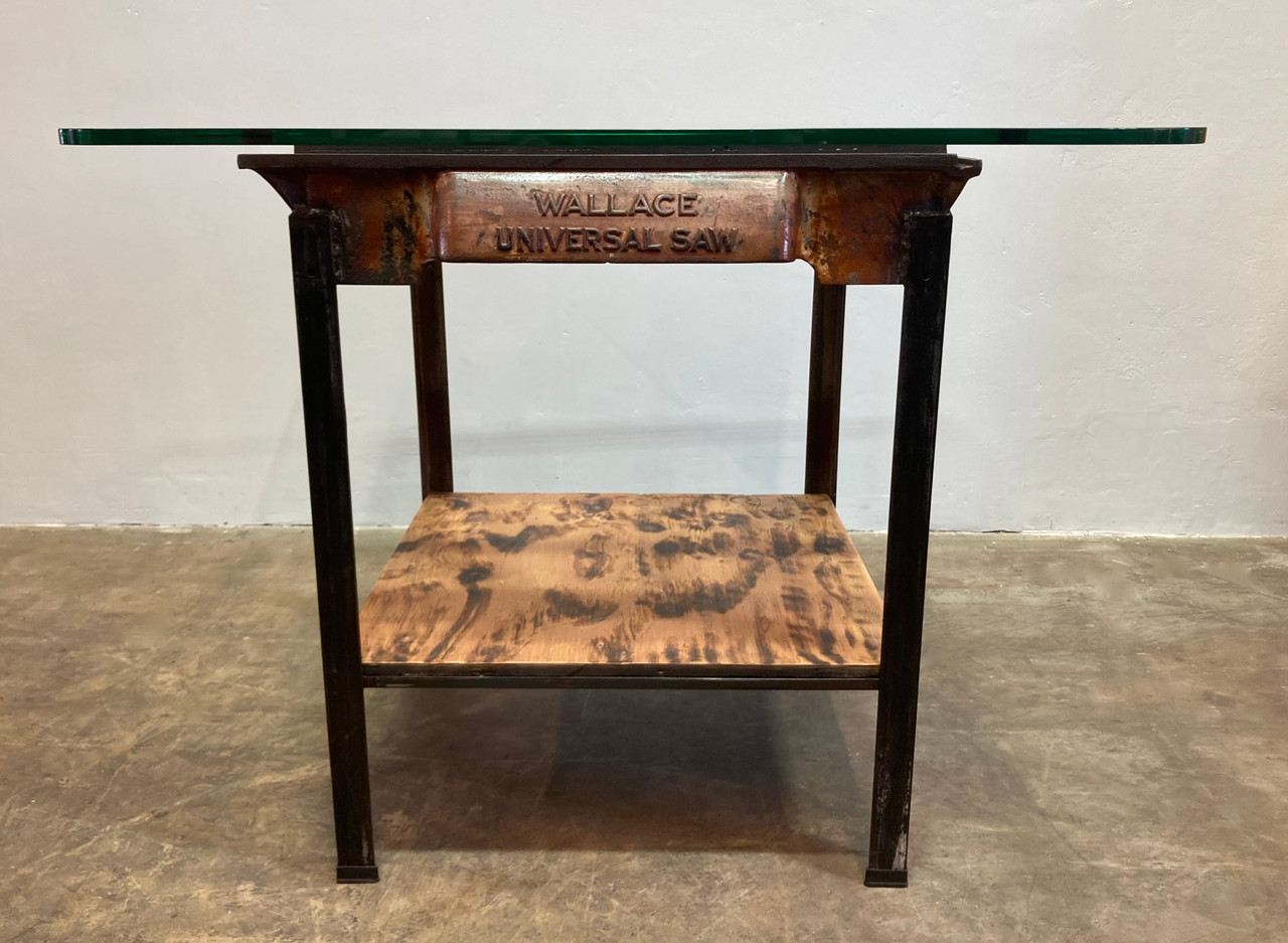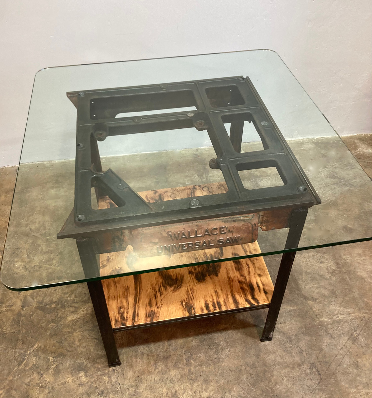 Rehab Vintage Interiors custom table, featuring a reclaimed antique work table and custom cut glass top. Size of the table would make a great cocktail or kitchen table. Wallace Saw Co. industrial table was made in the US in the early 20th century. Wood shelf has been newly textured and refinished.