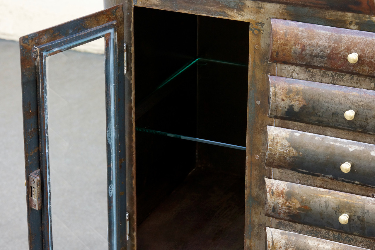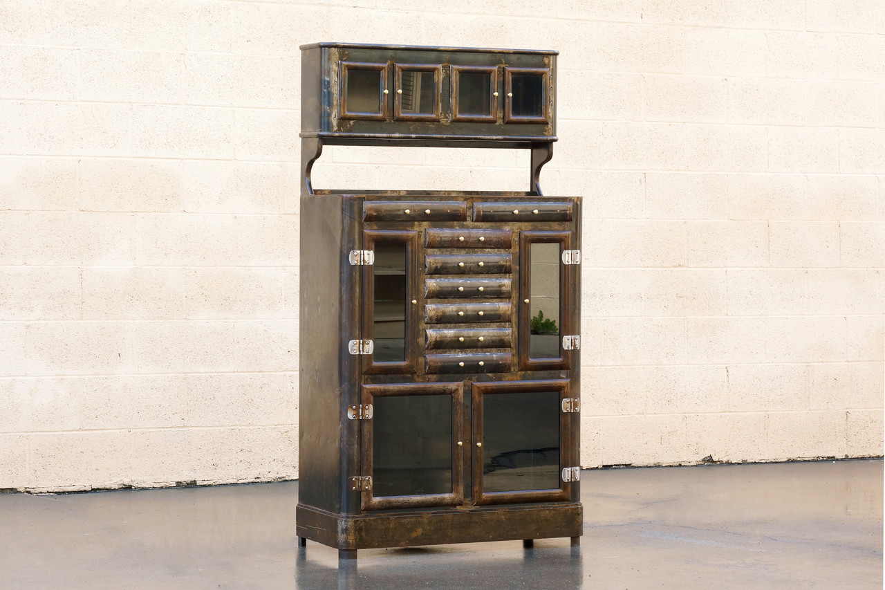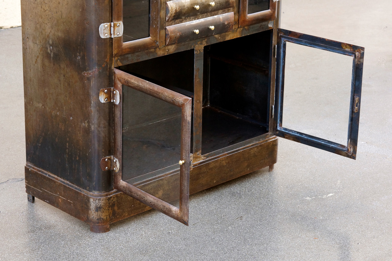 Gorgeous 1920s apothecary cabinet with many drawers, glass doors and and two glass shelves. This industrial-era piece features a distressed patina, lightly clear-coated to maintain its variation.