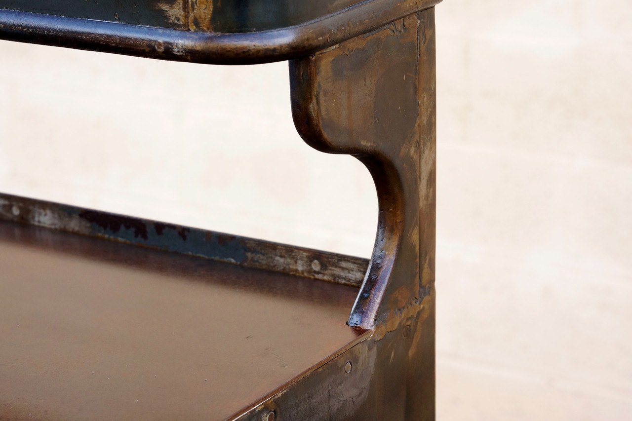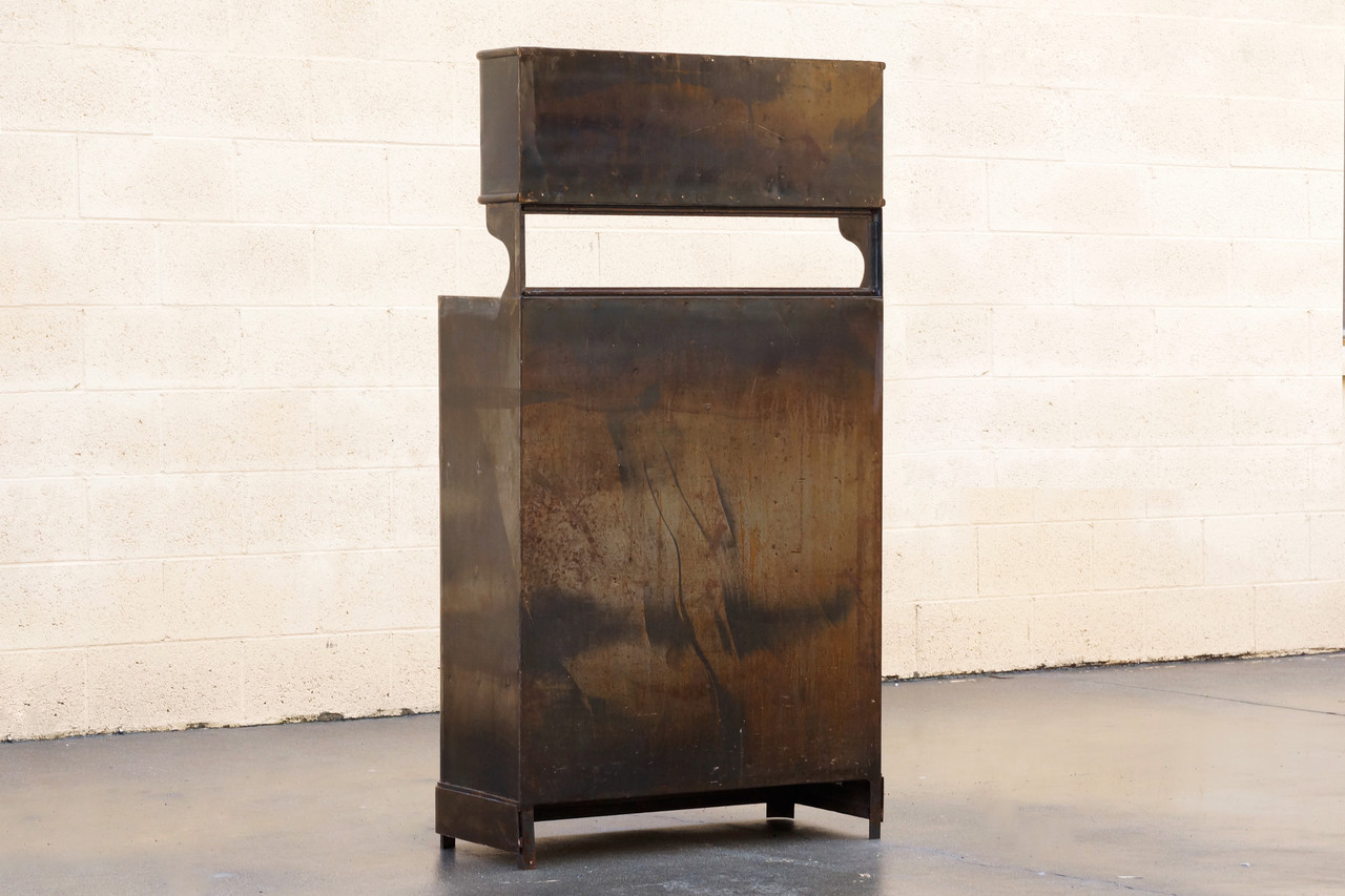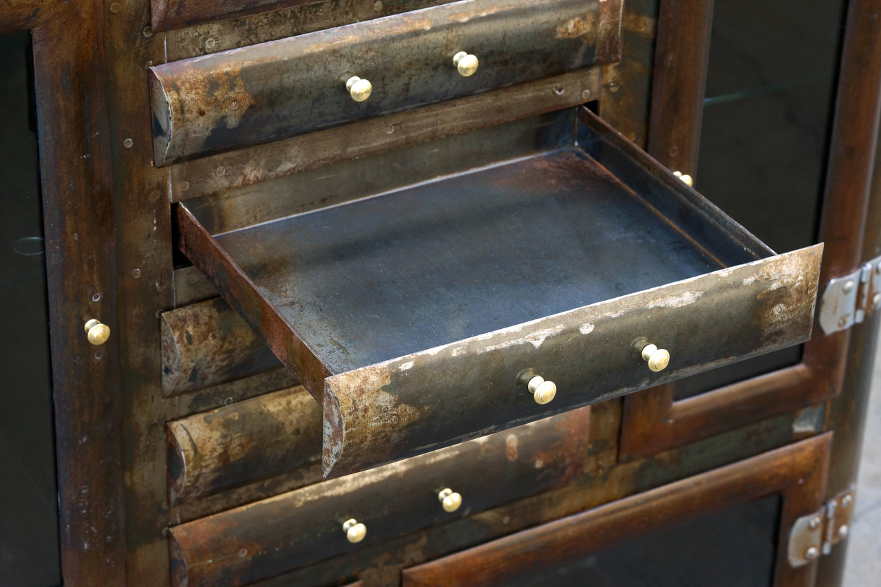Gorgeous 1920s apothecary cabinet with many drawers, glass doors and and two glass shelves. This industrial-era piece features a distressed patina, lightly clear-coated to maintain its variation.