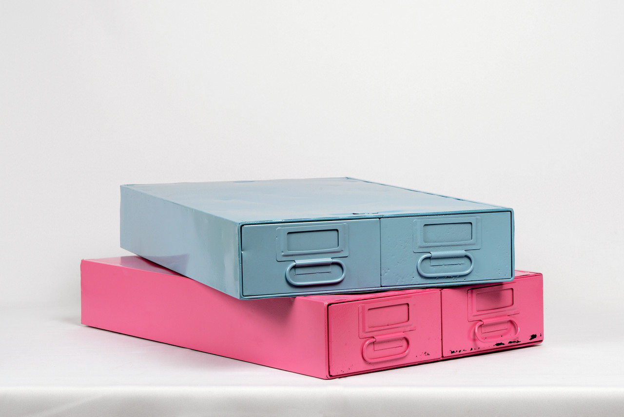 1940s card catalog filing unit with two deep, side by side pull-out drawers. Freshly powder coated steel in gloss Sky Blue (RAL5024). This heavy-duty organizational unit is perfect for storing anything from office supplies to recipe cards. Great for stacking. Variety of colors available; each sold separately. Please visit our storefront or contact us for the full selection.