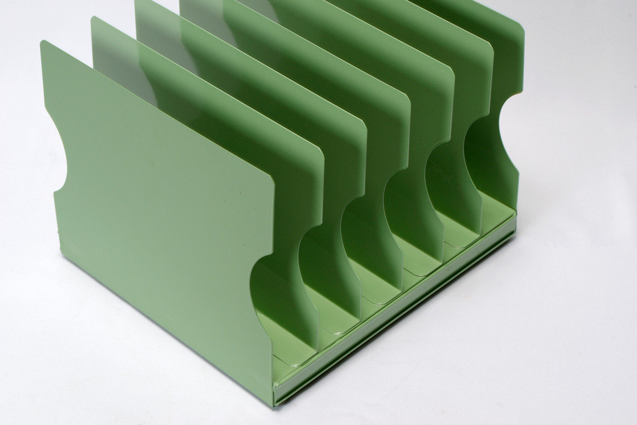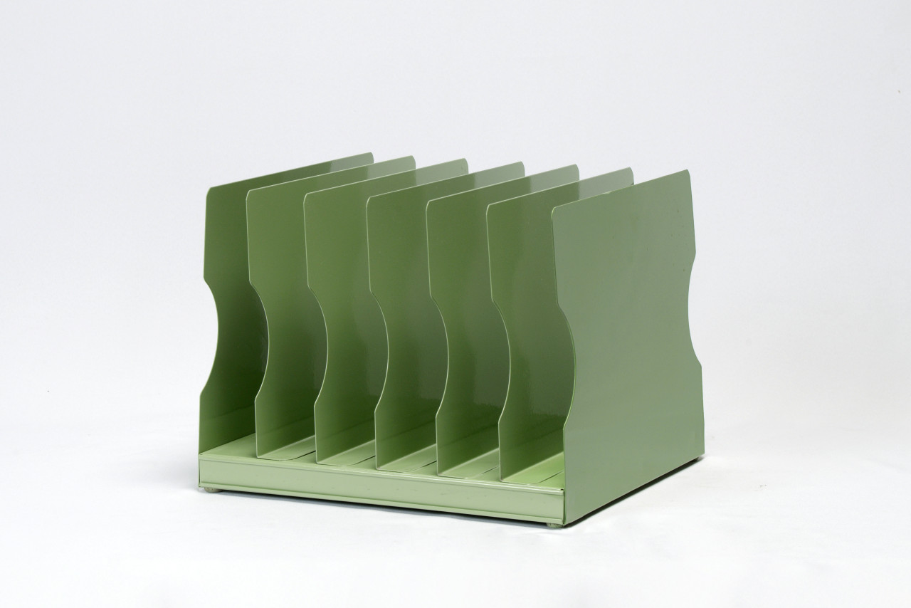 Wonderfully retro desktop file organizer from the 1940s. Vintage steel refinished in Sage Green powder coat (RAL6021). Six slots, perfect for keeping all your important papers in one tidy place.