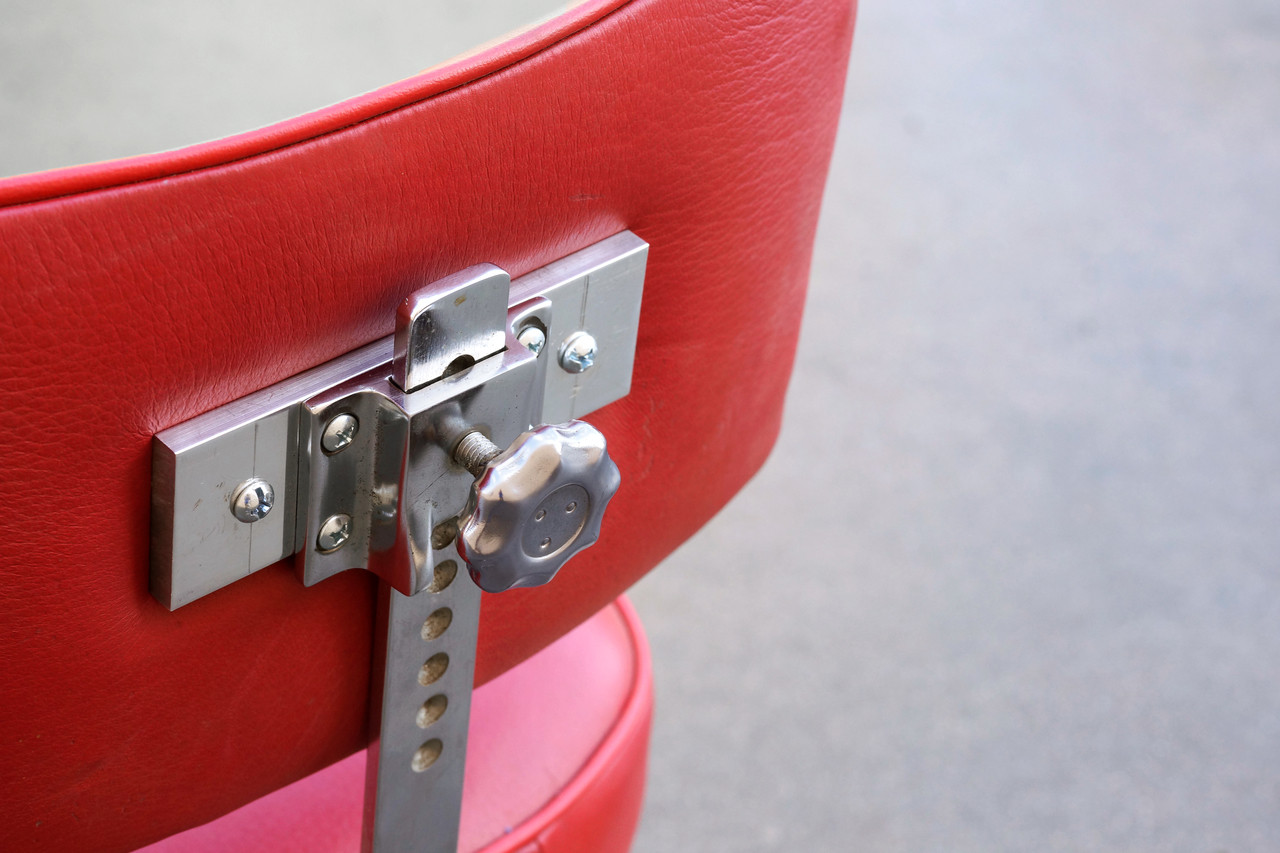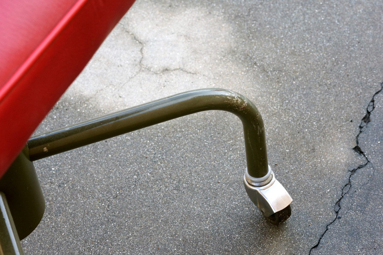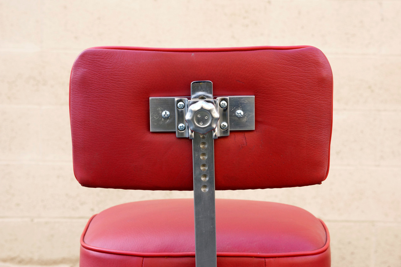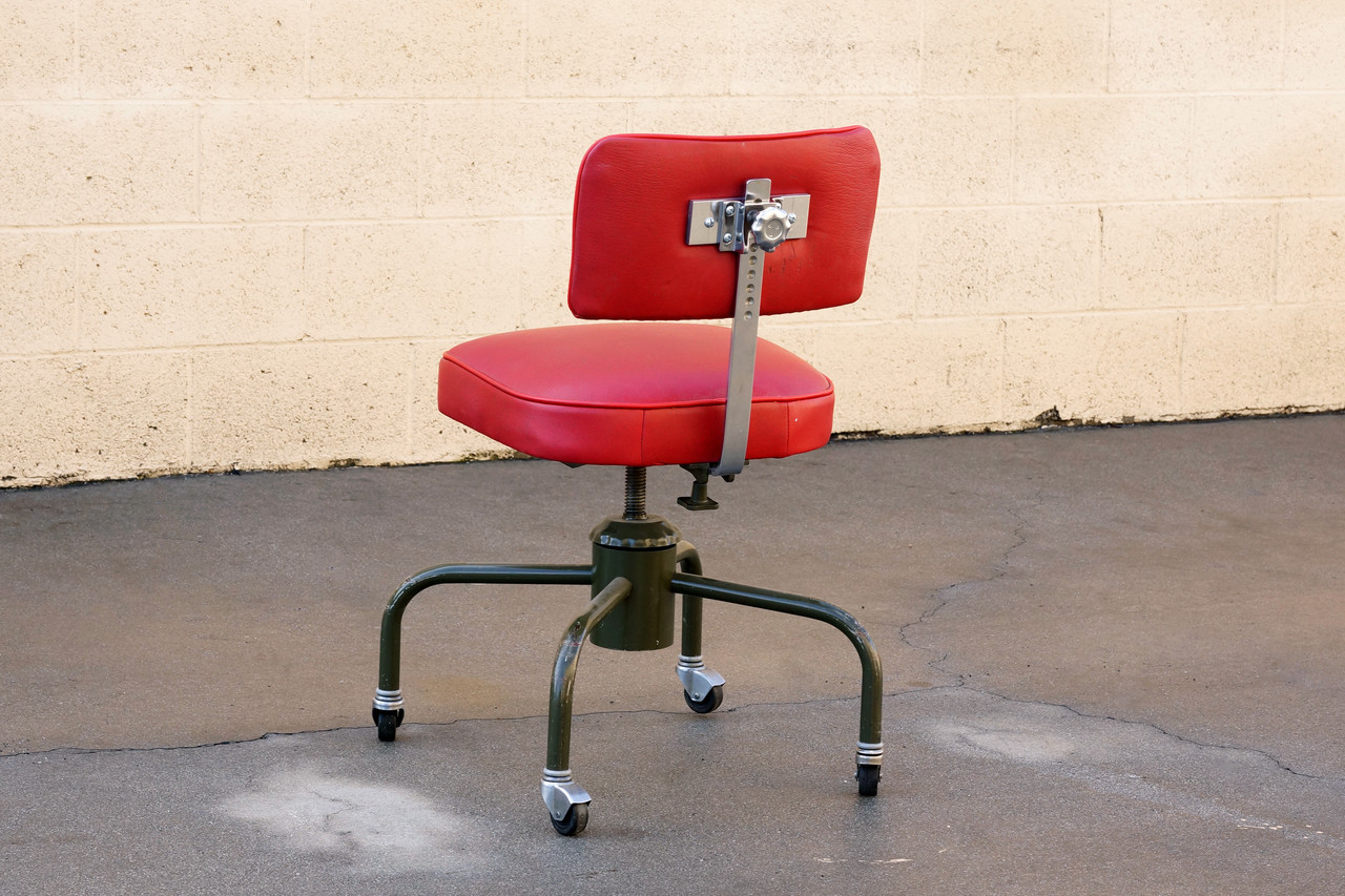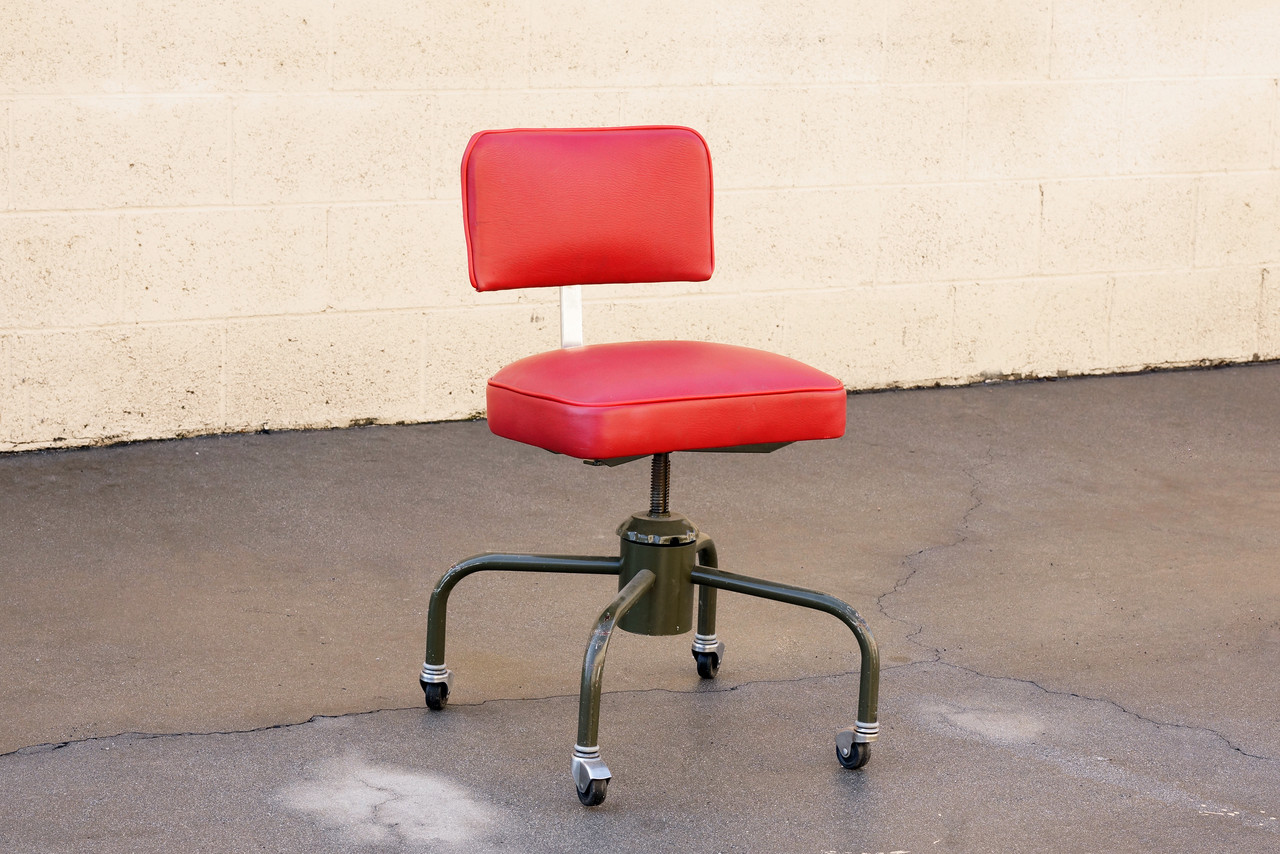 We refinished this 1940s industrial drafting stool in quality deerskin leather and left the original army green paint intact. This iconic seat swivels, rolls on casters and height adjusts.