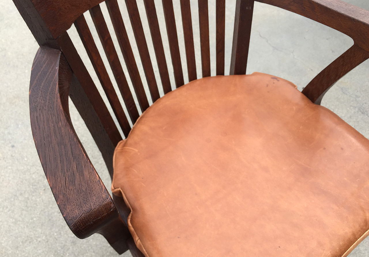 Beautifully articulated oak lawyer chair, circa 1940s. Features newly reupholstered leather seat, slat back and reconditioned wood frame. Excellent refinished condition.