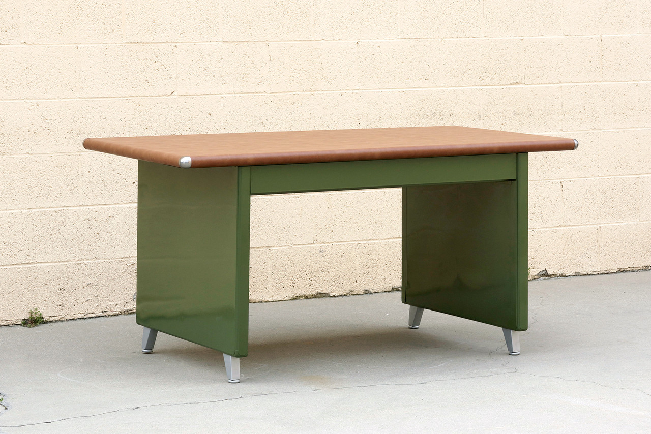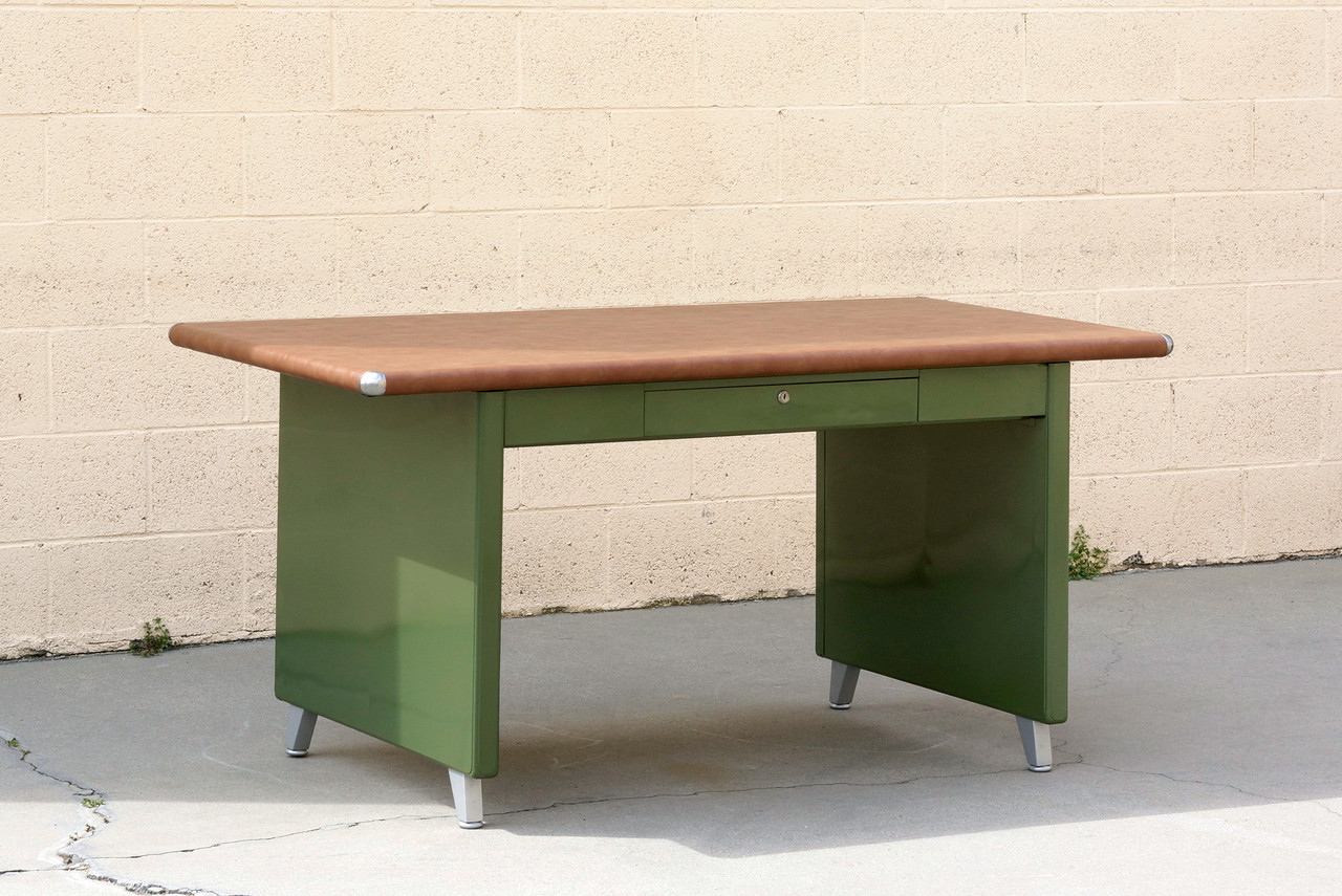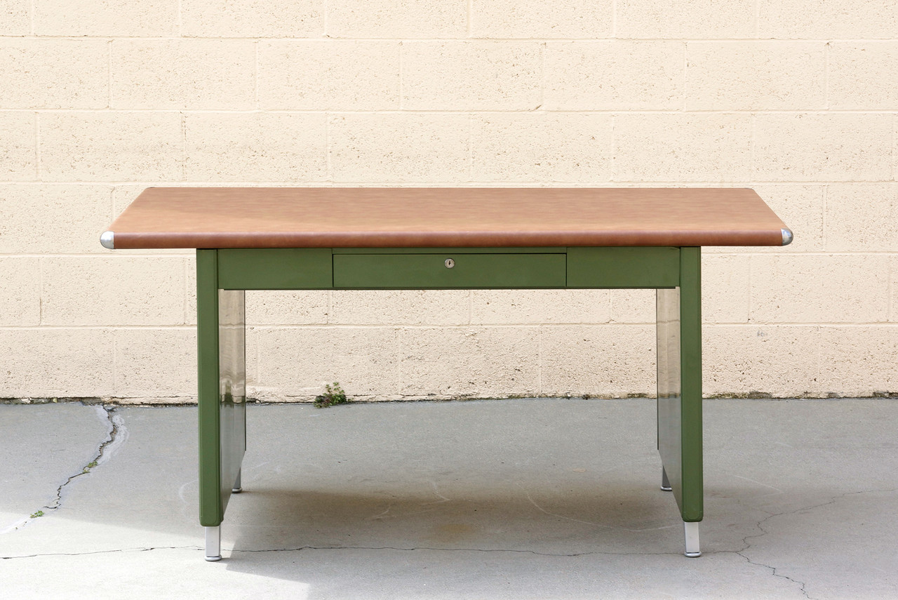 What a beauty! We refinished this rare 1940s Shaw Walker panel leg tanker table in an army green powder coat with a camel-colored vinyl top. Original splayed legs powder coated in metallic silver; polished steel table-top bumpers. Features a single locking drawer (key not included). Steno chair sold separately.