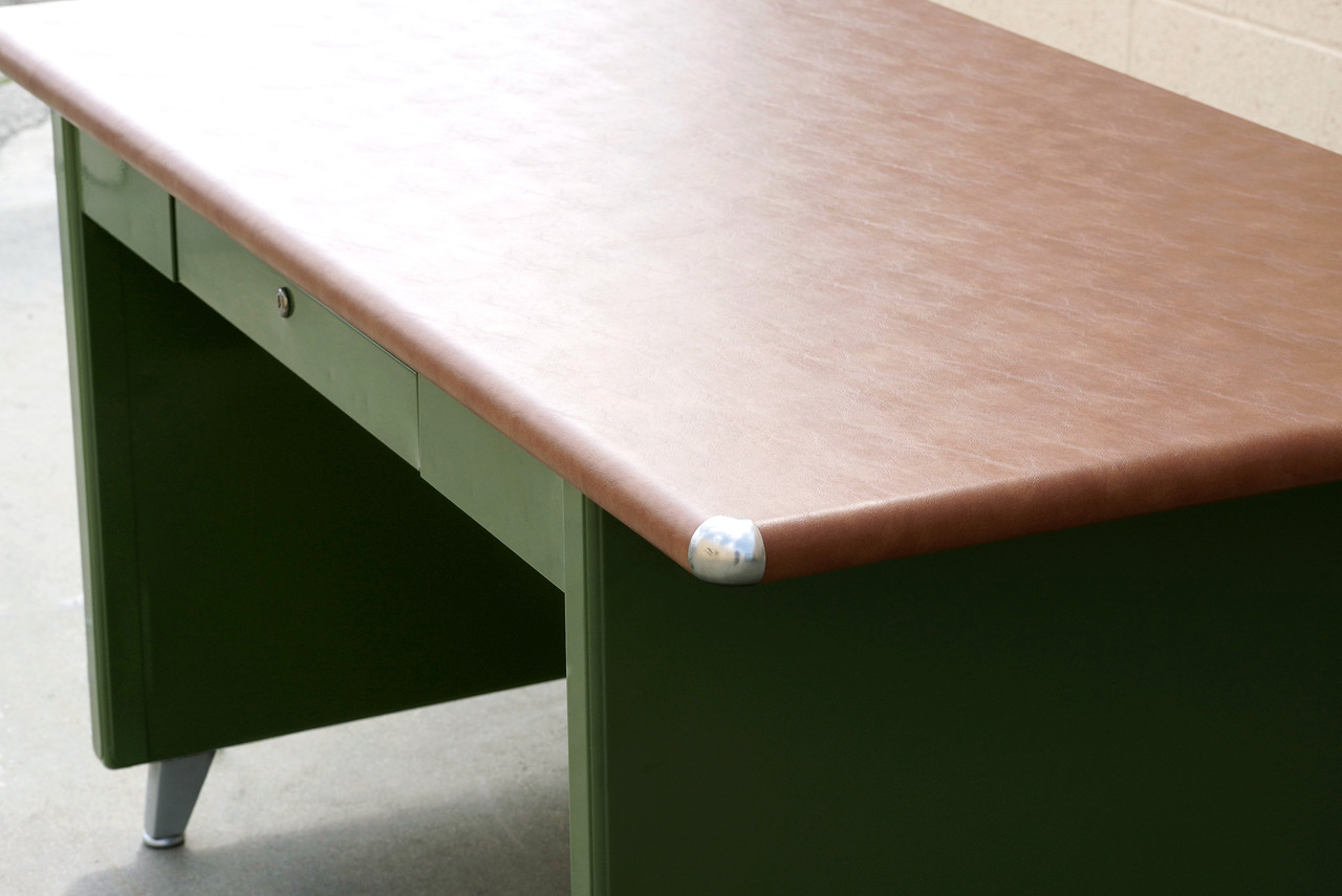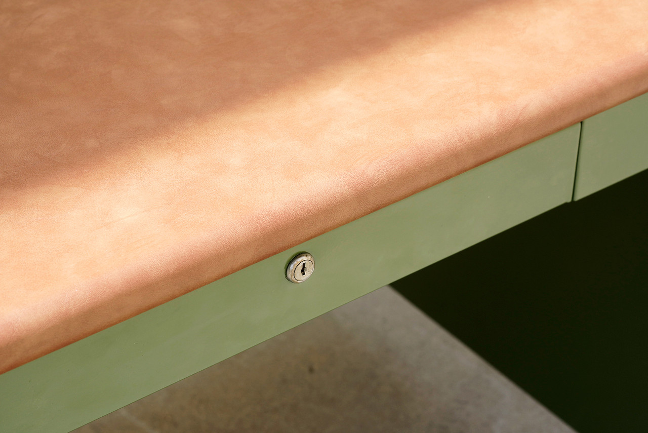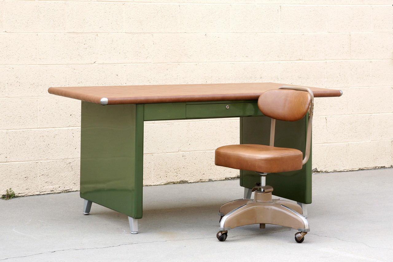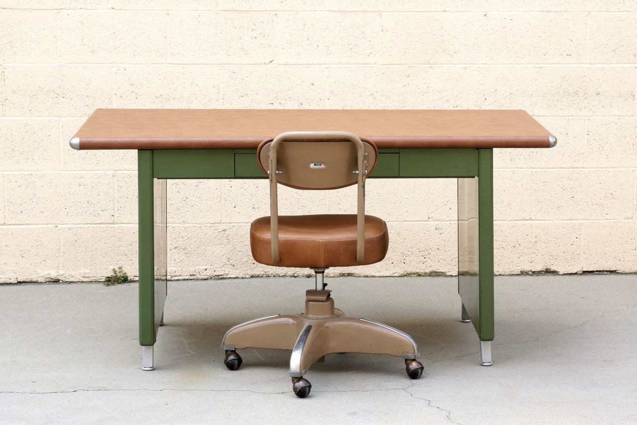 What a beauty! We refinished this rare 1940s Shaw Walker panel leg tanker table in an army green powder coat with a camel-colored vinyl top. Original splayed legs powder coated in metallic silver; polished steel table-top bumpers. Features a single locking drawer (key not included). Steno chair sold separately.