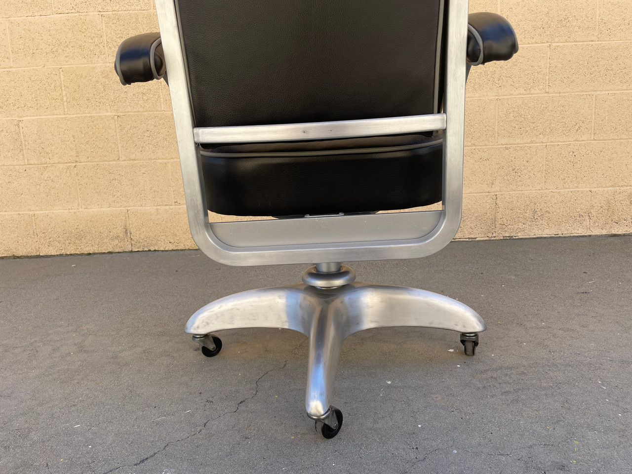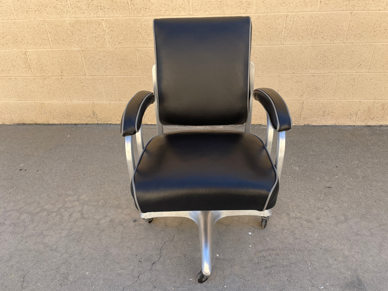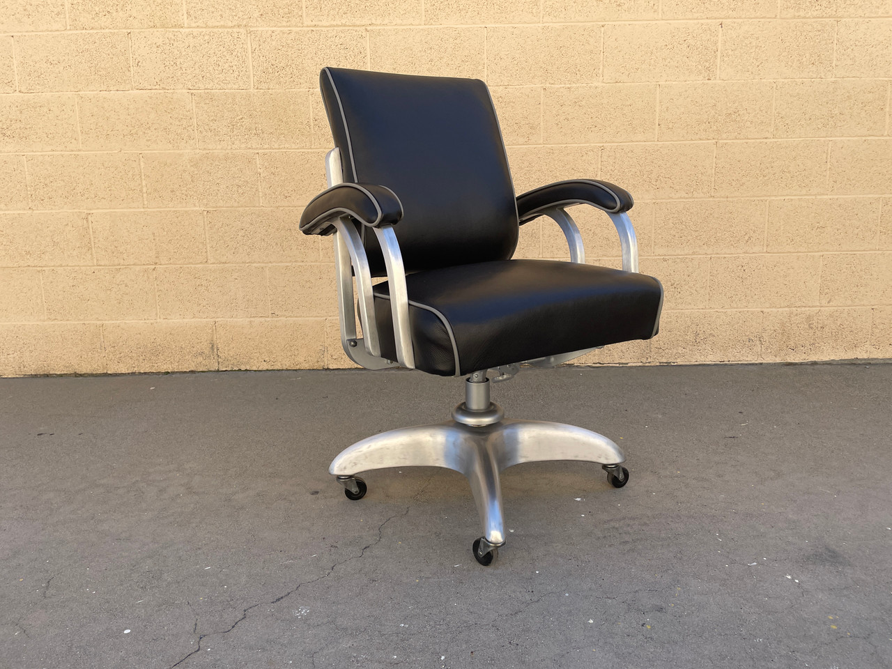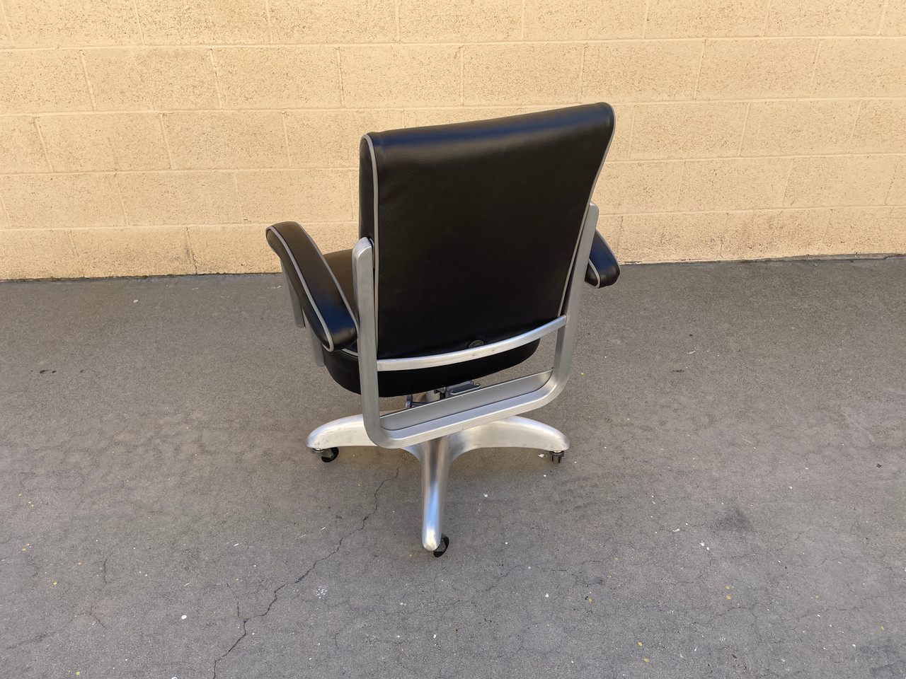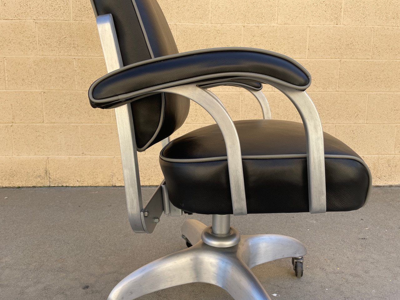 General Fireproofing Company's iconic "Good Form" double loop steno chair. Brushed aluminum frame refinished. Reupholstered in black leather. Swivels, rolls and adjusts.