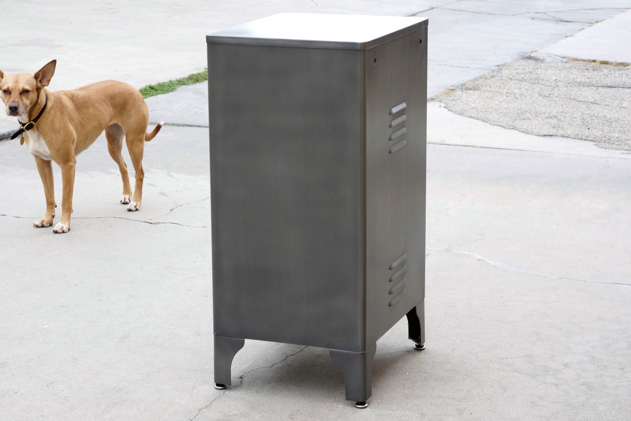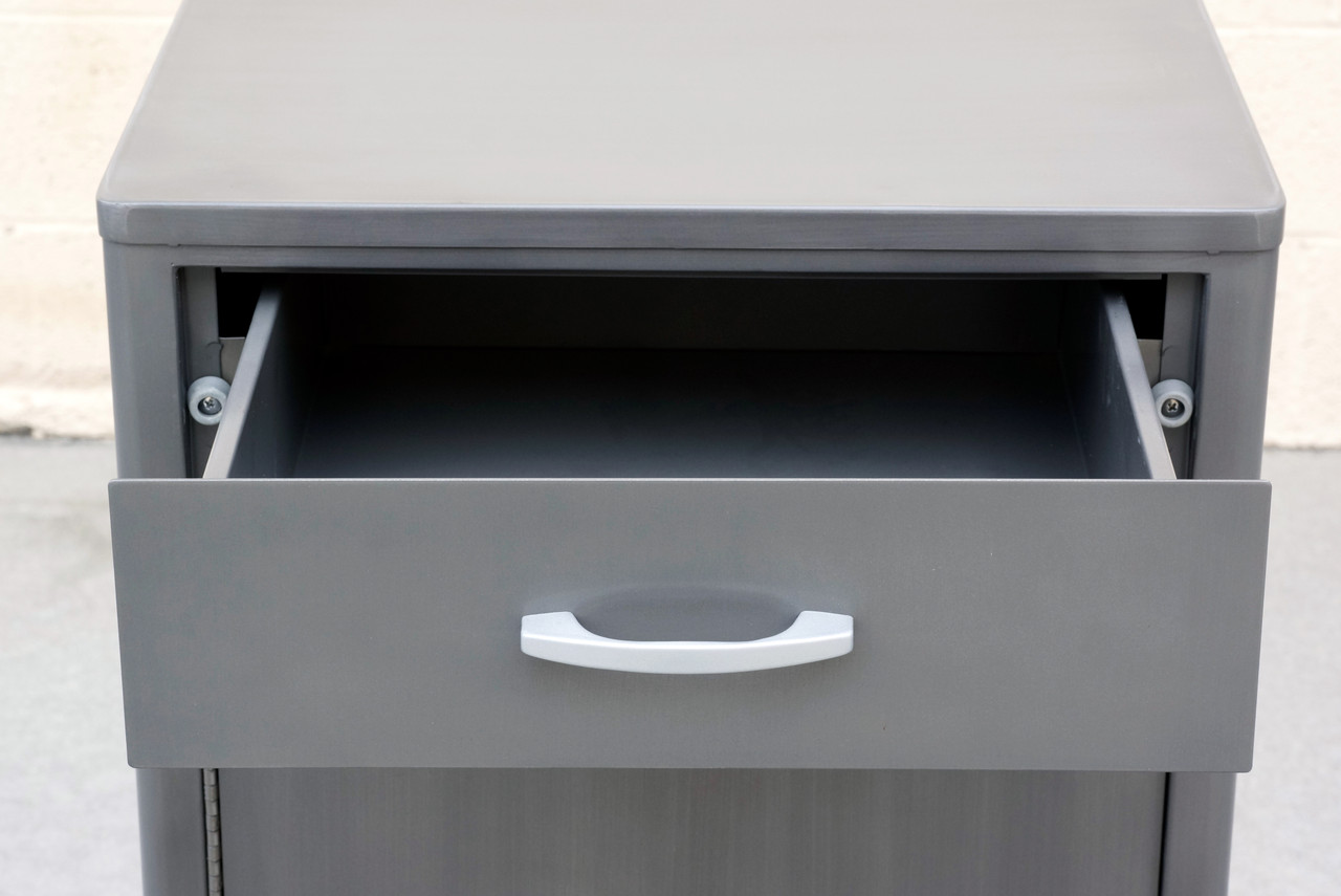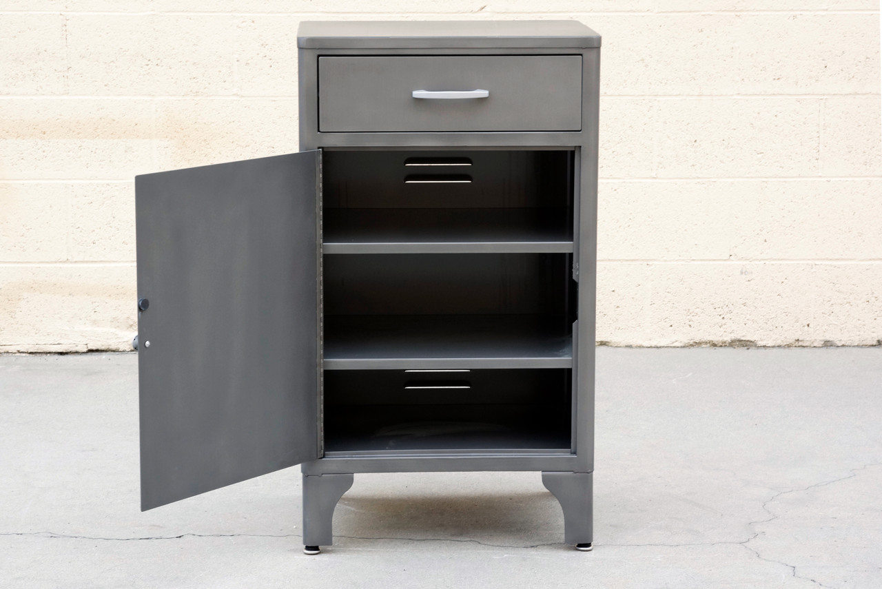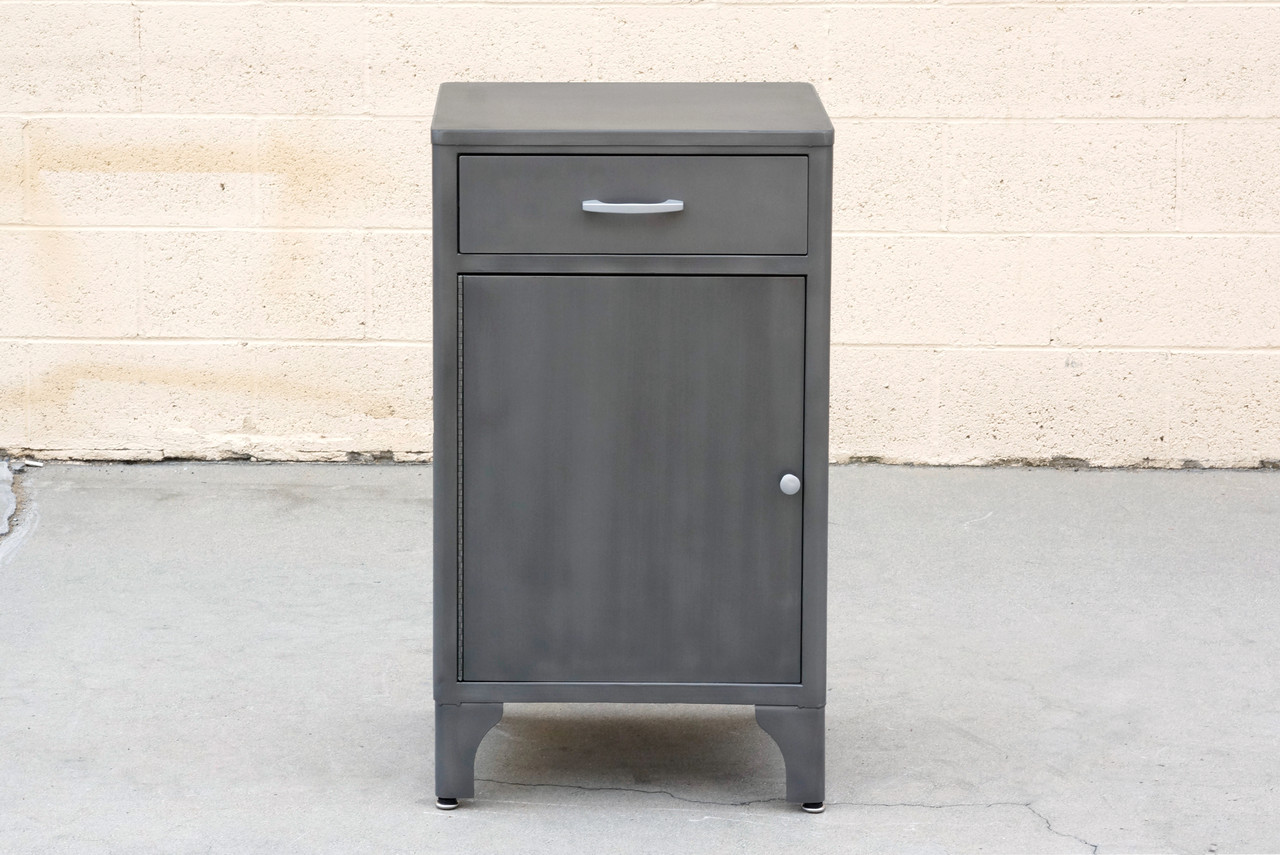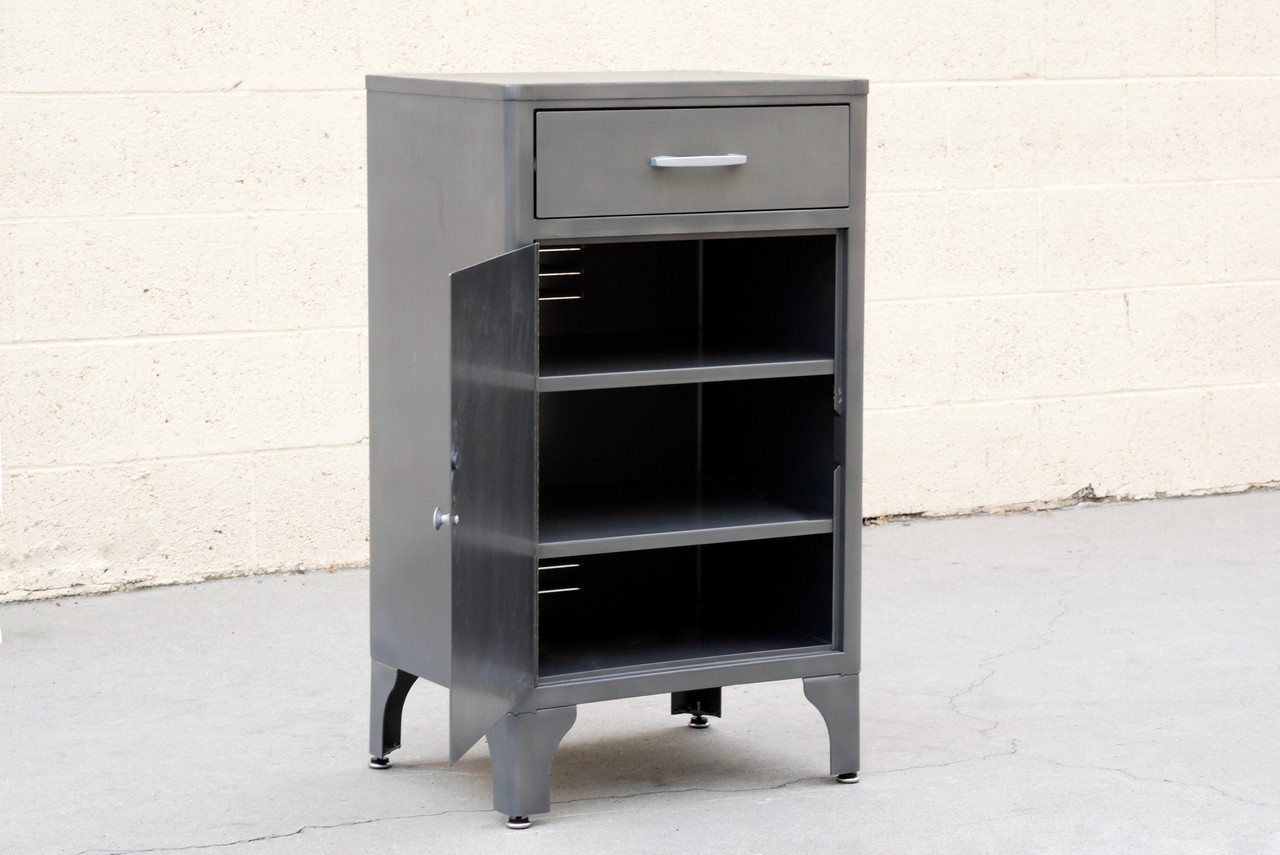 Classic 1950s industrial medical cabinet refinished in a natural steel powder coat. This quality-made steel unit features single drawer and magnetized cabinet door with double shelves. Original hardware, refinished.