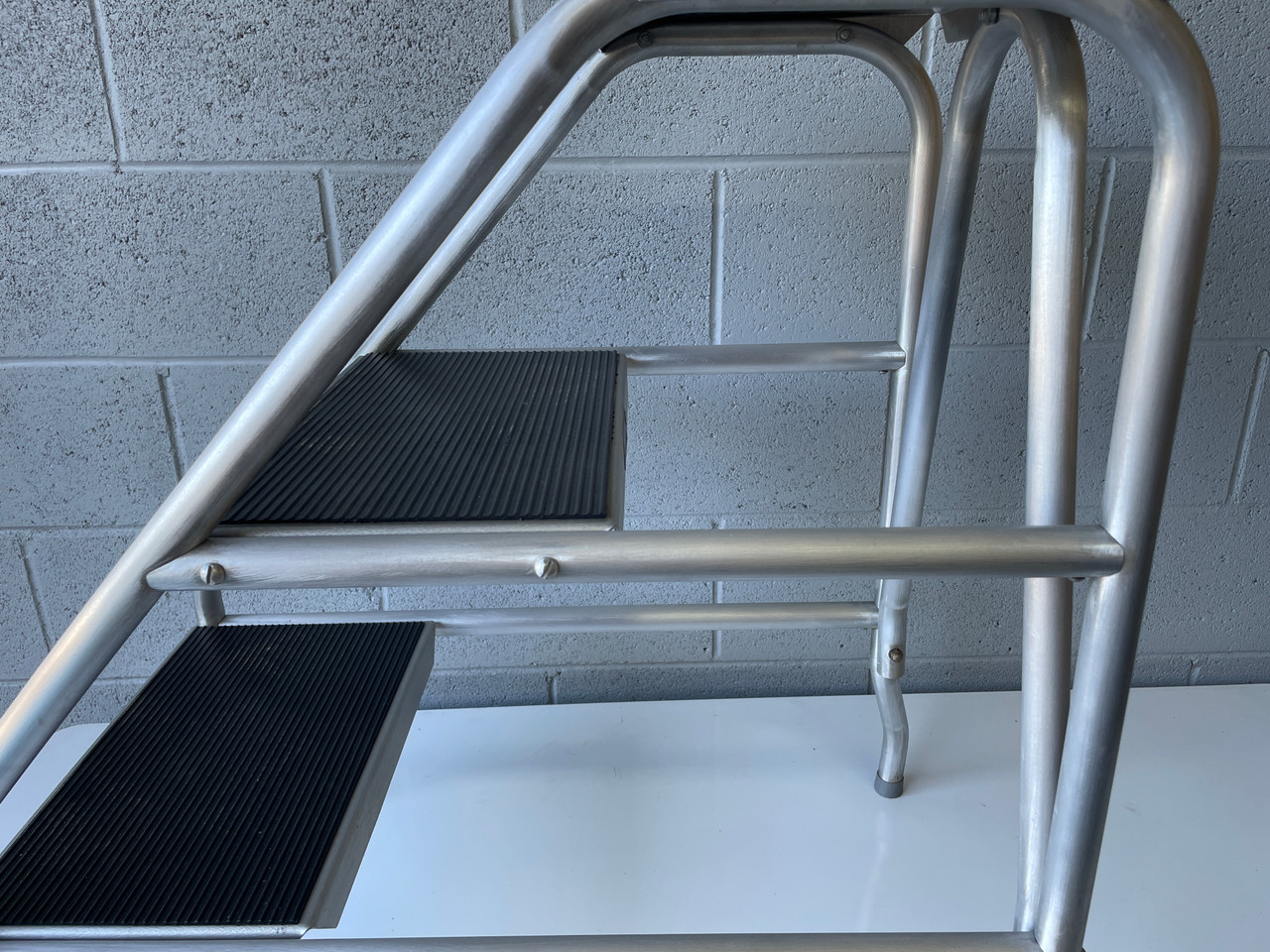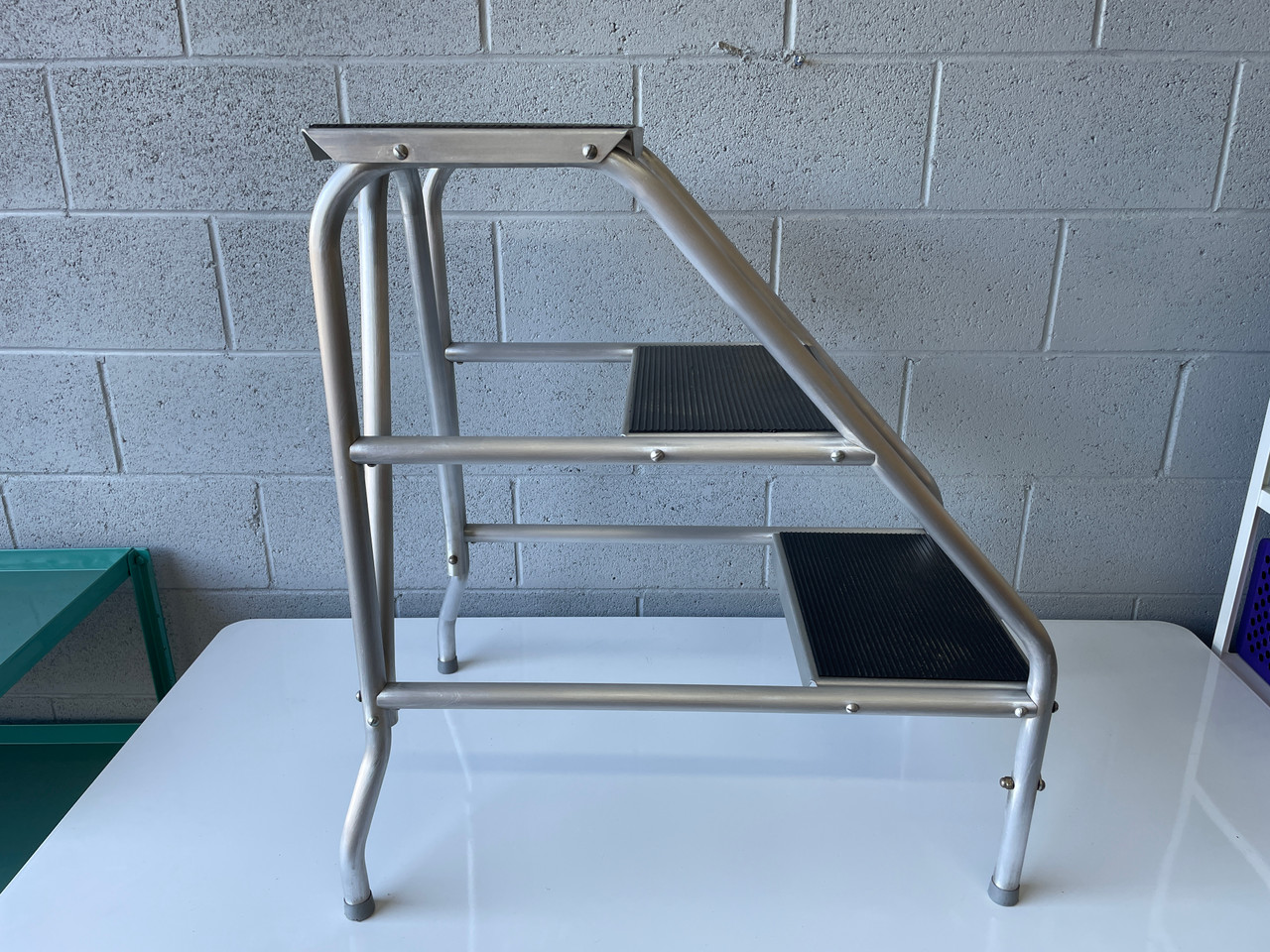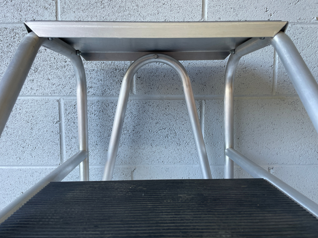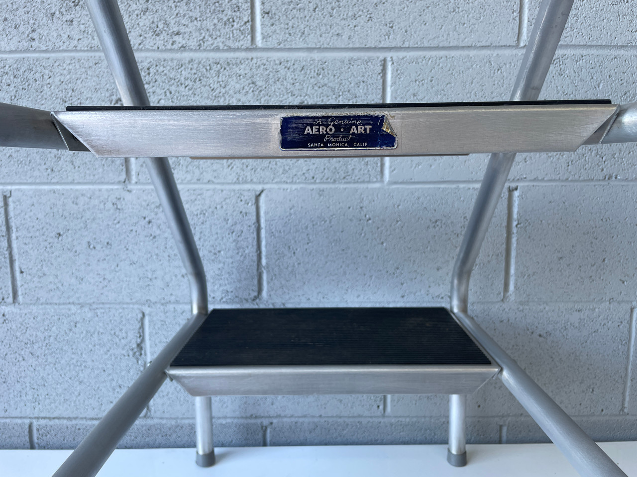 Mid century step stool made by Aero-Art in Santa Monica, CA. Used to repair vintage planes. Made of curved aluminum tubing with black rubber step pads. So sturdy that it still has the original label! In excellent vintage condition as pictured. Slight wear and scratches due to age, but fully functional.