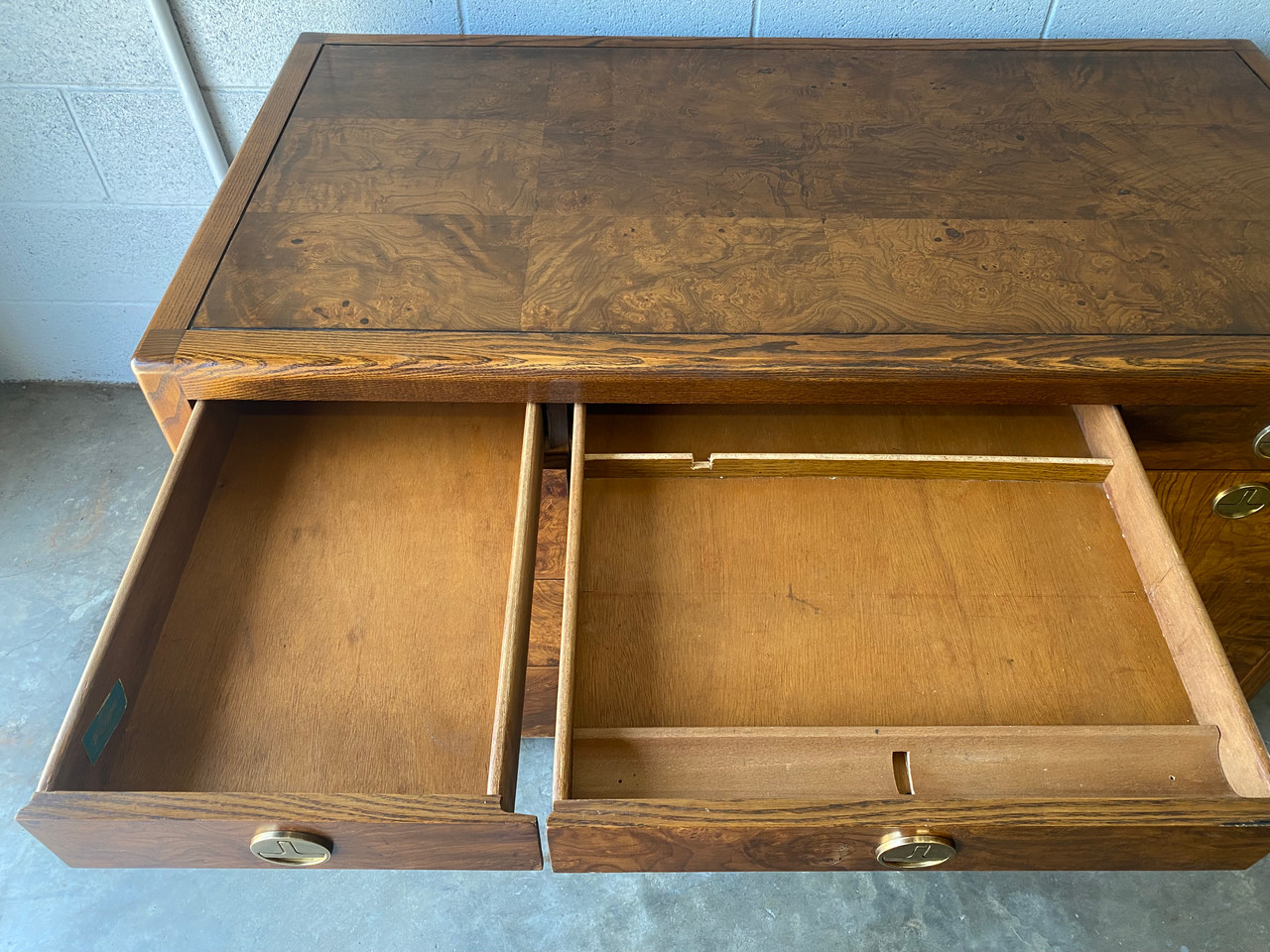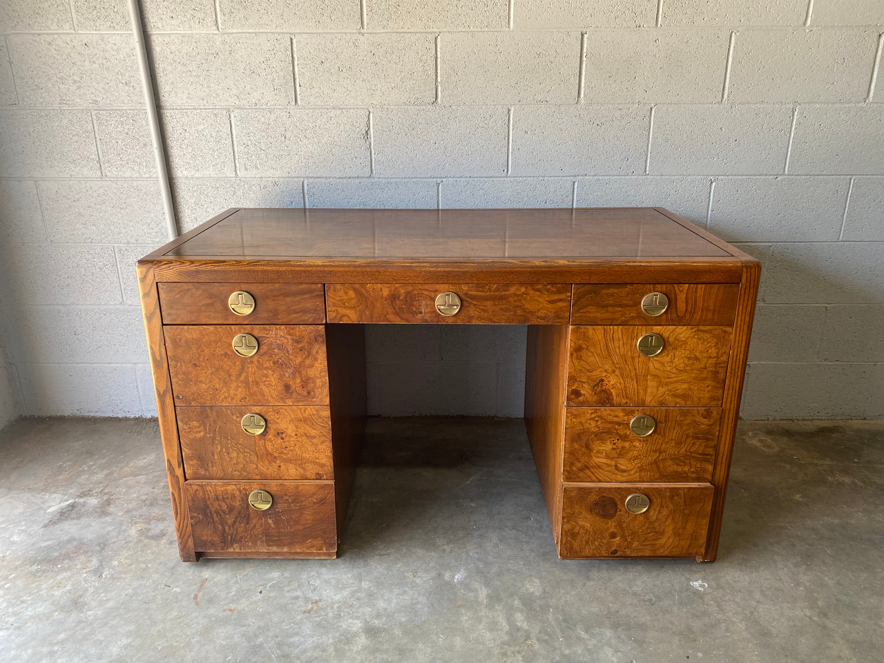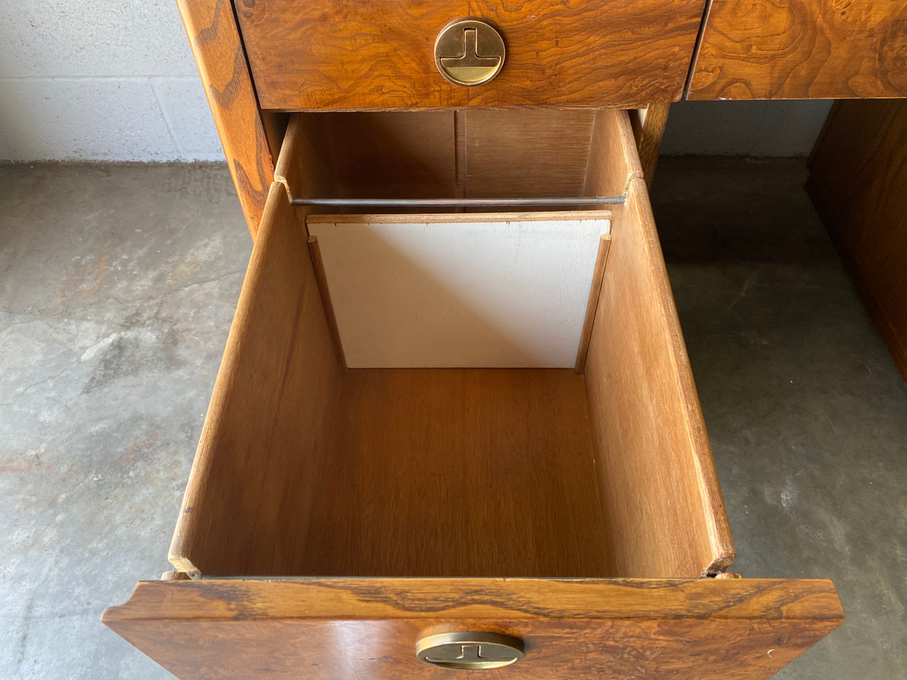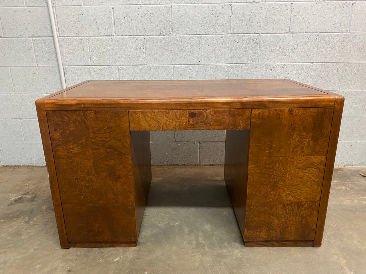 Mid-sized burlwood desk by Sligh. Solid wood construction with burl veneer finish. Excellent size for a small home office or bedroom. Structurally sound with some blemishes and loss of lacquer in some areas. Good overall vintage condition.