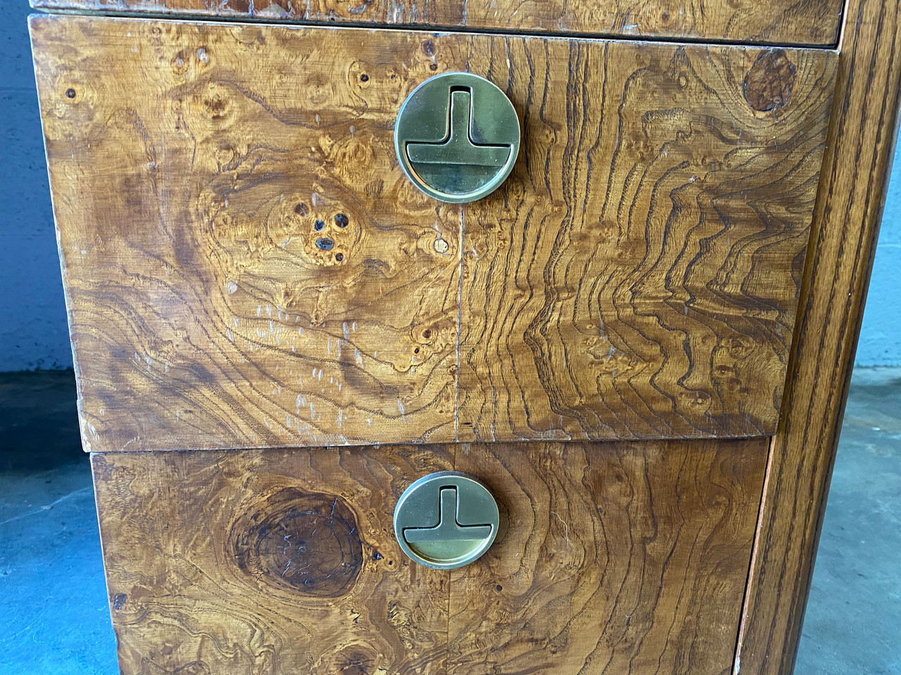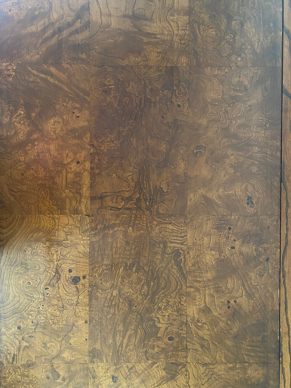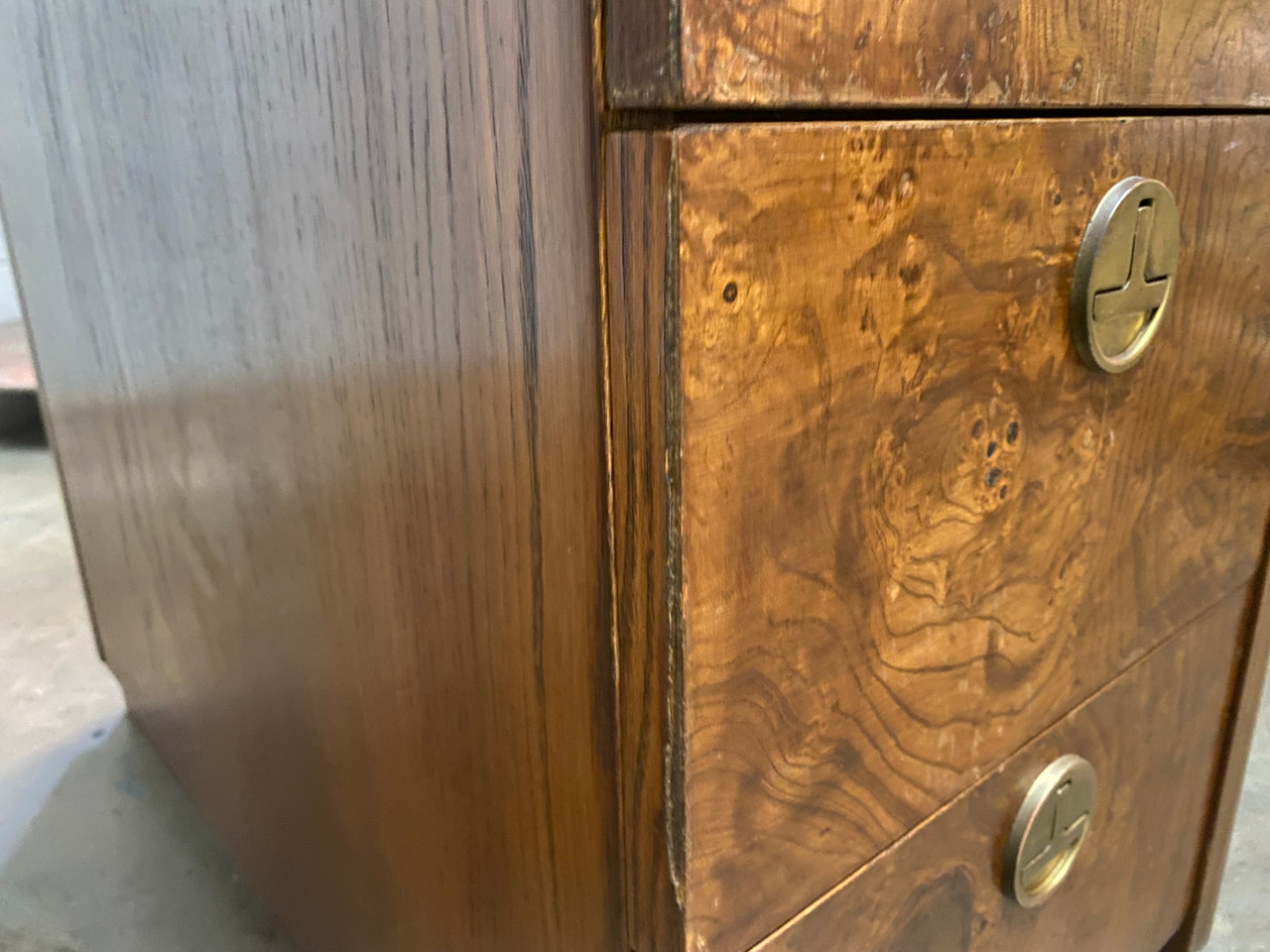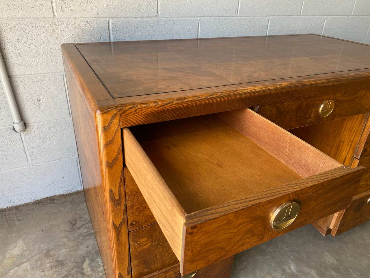 Mid-sized burlwood desk by Sligh. Solid wood construction with burl veneer finish. Excellent size for a small home office or bedroom. Structurally sound with some blemishes and loss of lacquer in some areas. Good overall vintage condition.
