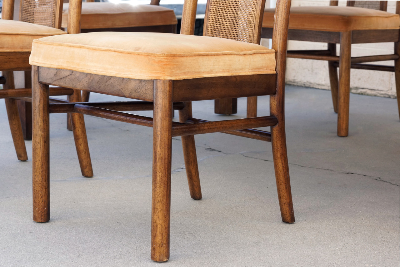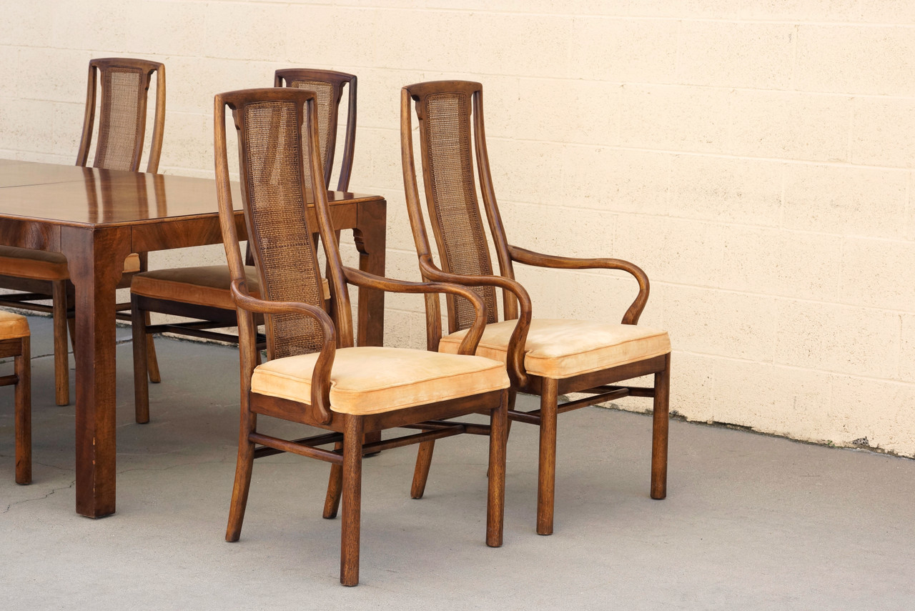 Stunning 11-piece set includes: table, double leaves, 8 guest chairs and two armchairs. Set sold as is. Wood shows gentle nicks as pictured. Cane is in great condition. Original velvet upholstery shows wear, please refer to photos.