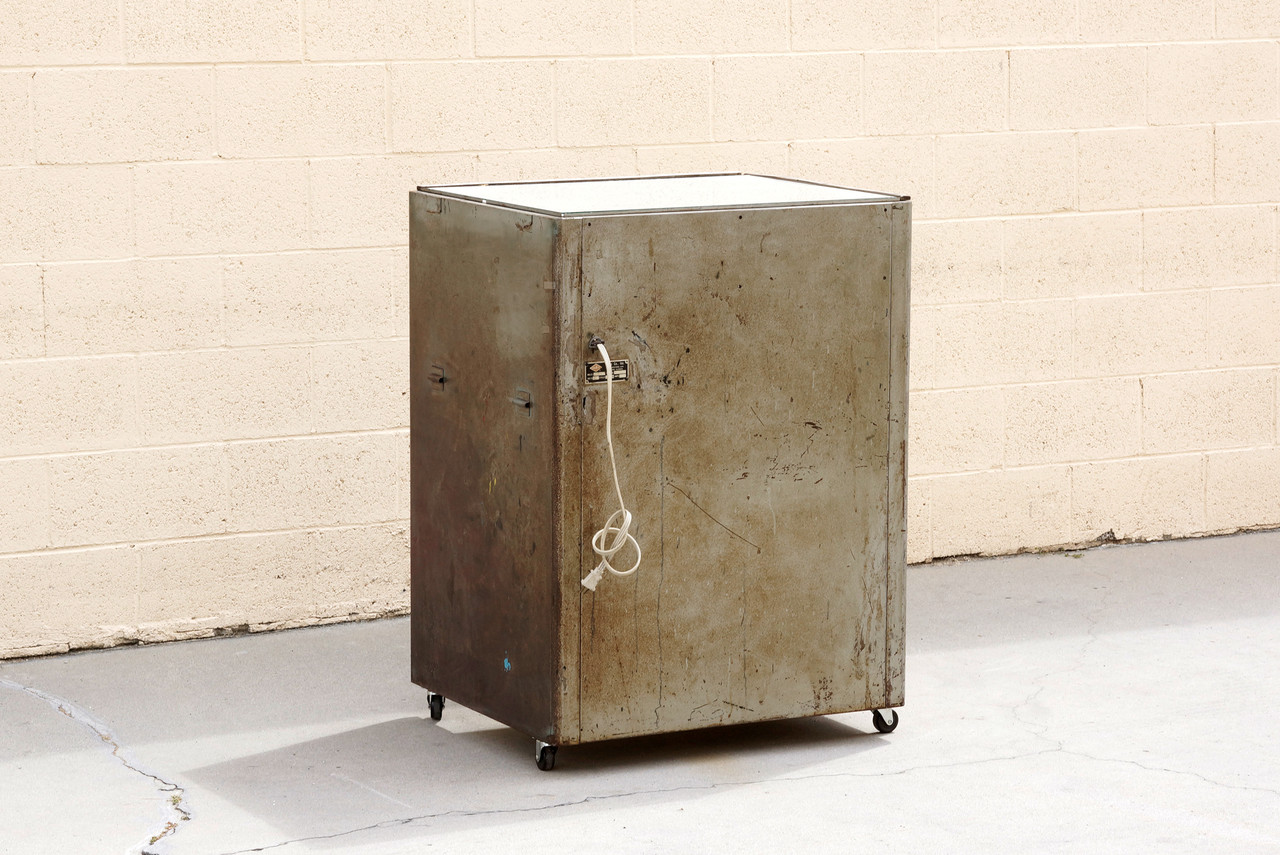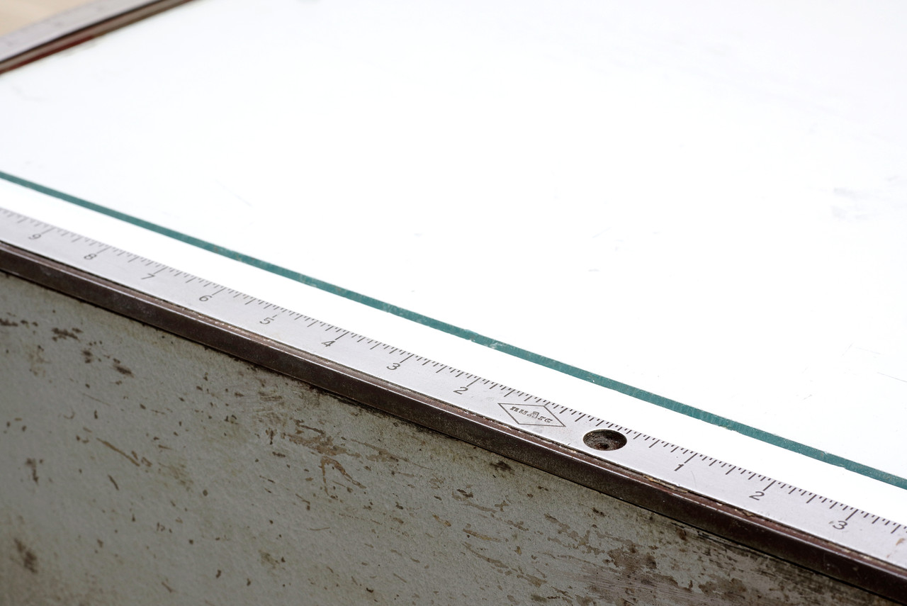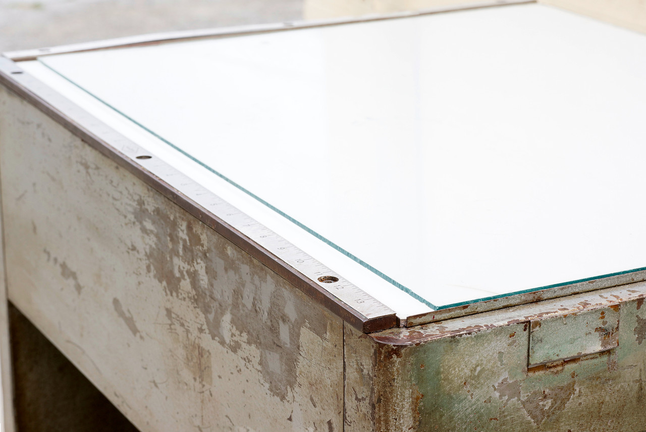 1960s industrial light box table by Nuarc Graphic Arts Equipment. It works! Put it to use to view negatives or transparencies. Makes for a neat retail display. We are selling this piece "as is;" structurally and functionally sound with excellent vintage industrial patina to steel.