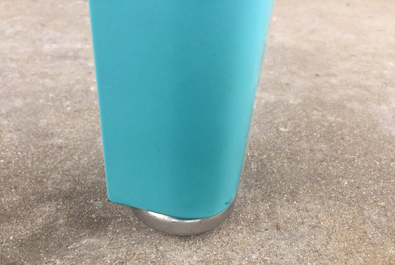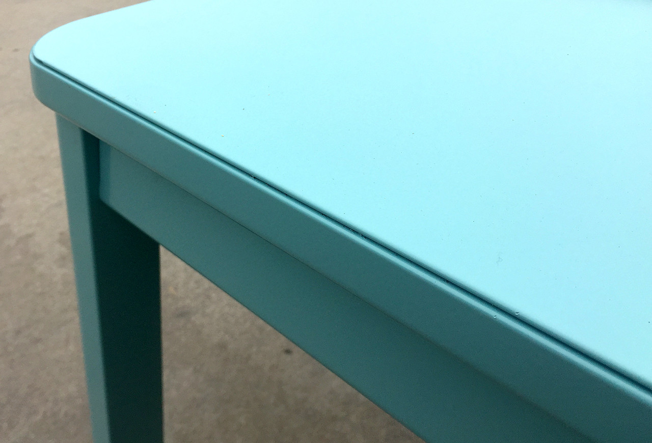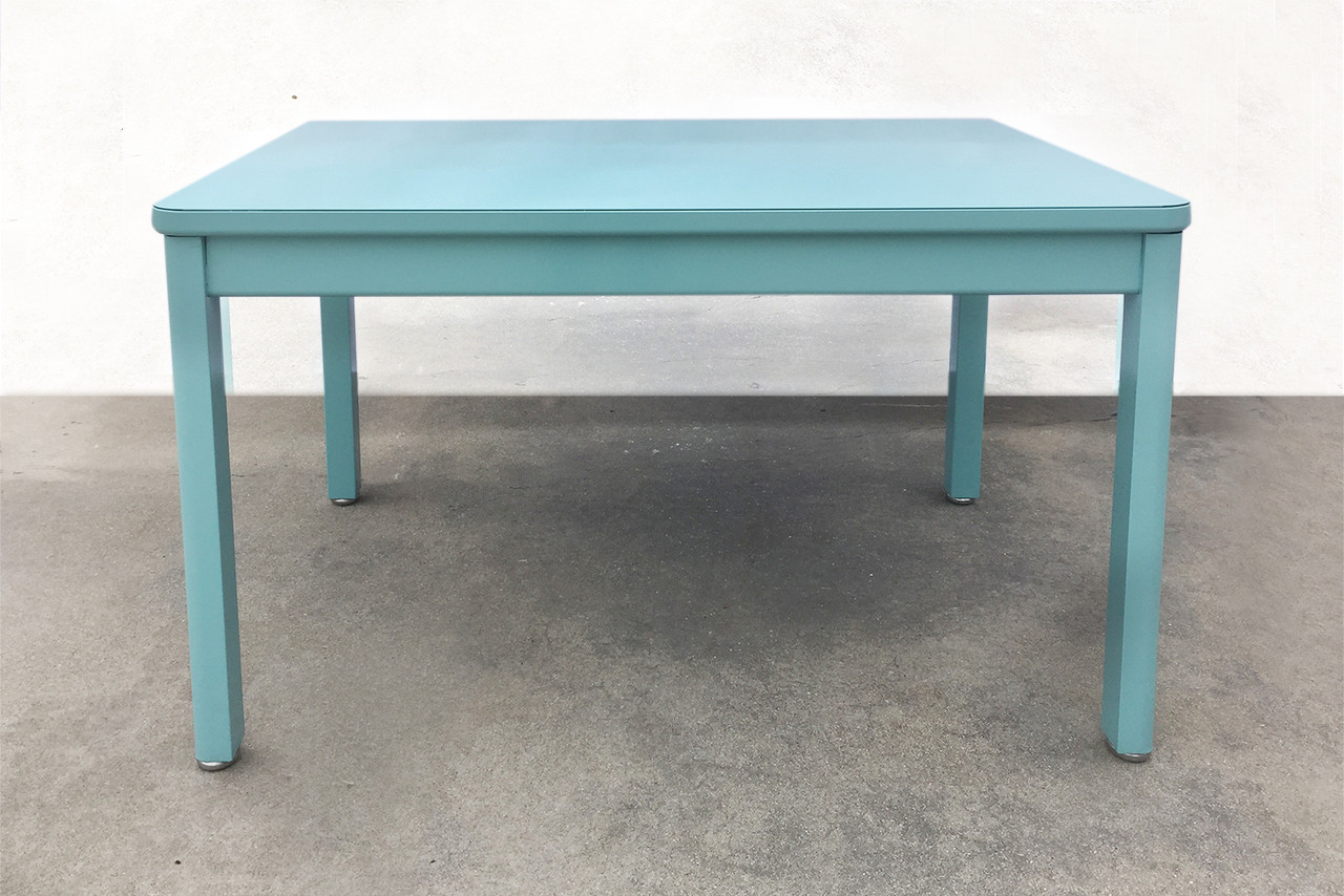 1960s McDowell Craig tanker table. We refinished this Classic steel piece with a high-gloss powder coat in ocean. Makes for an excellent retro kitchen or work table. Excellent refurbished condition.
