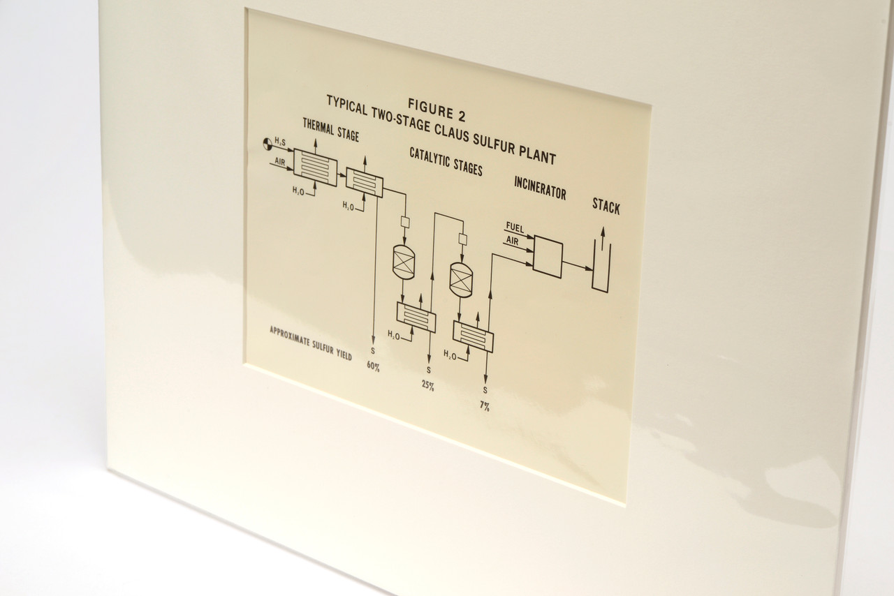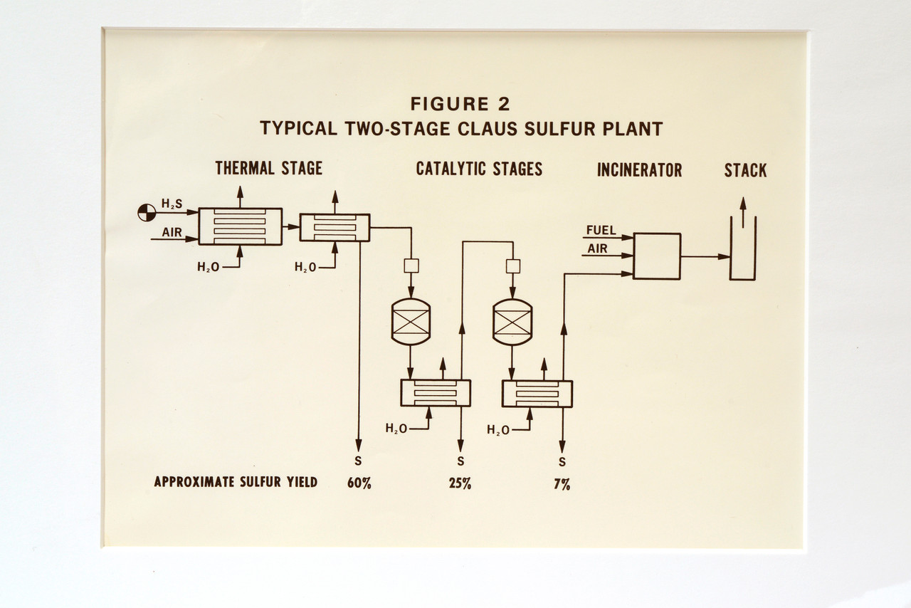 We got our hands on a stash of mid century scientific diagrams from the archives of the Griffith Observatory, Los Angeles. Figure 2, pictured here, breaks down "Typical Two-Stage Claus Sulfur Plant." Don't ask us to explain what on earth that means (something to do with recovering elemental sulfur from gaseous hydrogen sulfide?...), but we sure think it's a neat vintage print.