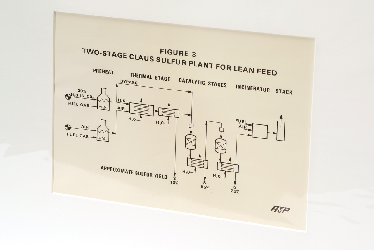 We got our hands on a stash of mid century scientific diagrams from the archives of the Griffith Observatory, Los Angeles. Figure 3, pictured here, breaks down "Two-Stage Claus Sulfur Plant for Lean Feed." Don't ask us to explain what on earth that means (something to do with recovering elemental sulfur from gaseous hydrogen sulfide?...), but we sure think it's a neat vintage print.