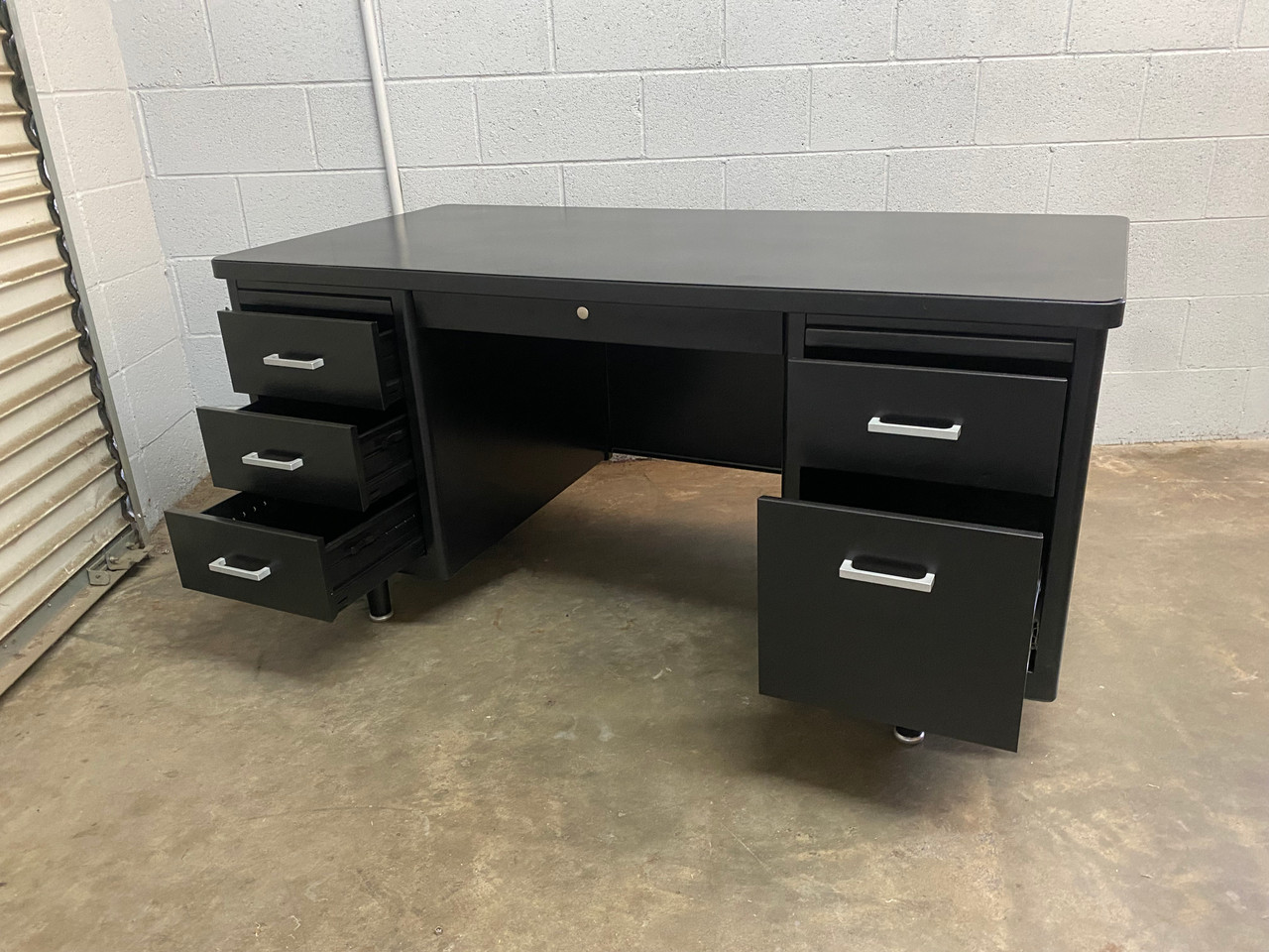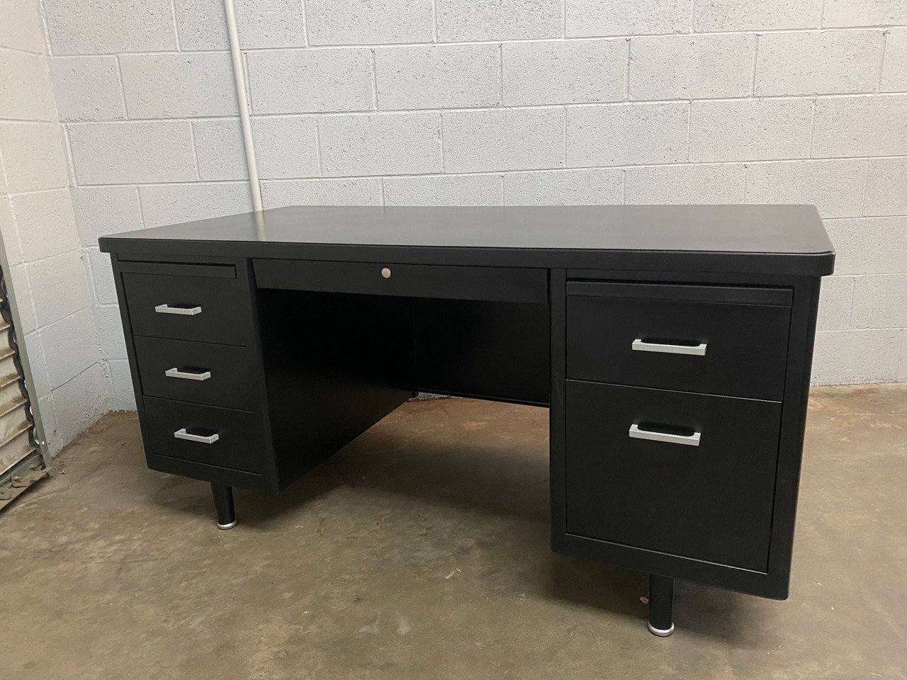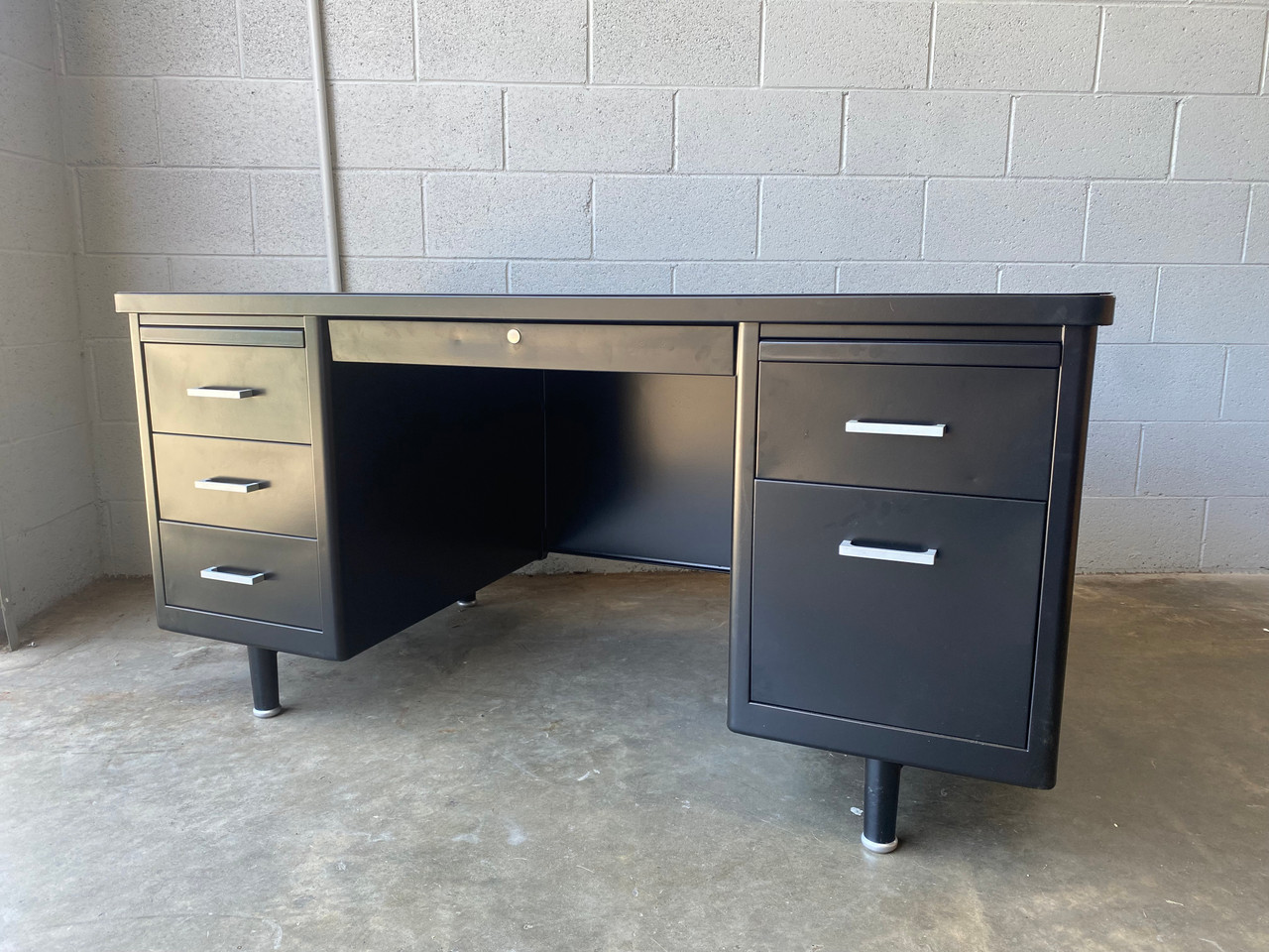 1960s Steelcase tanker desk on pontoon legs, refinished in black with silver hardware (Semi Gloss BK 08). In excellent refinished condition. Please refer to photos and contact us with any questions. One available immediately.