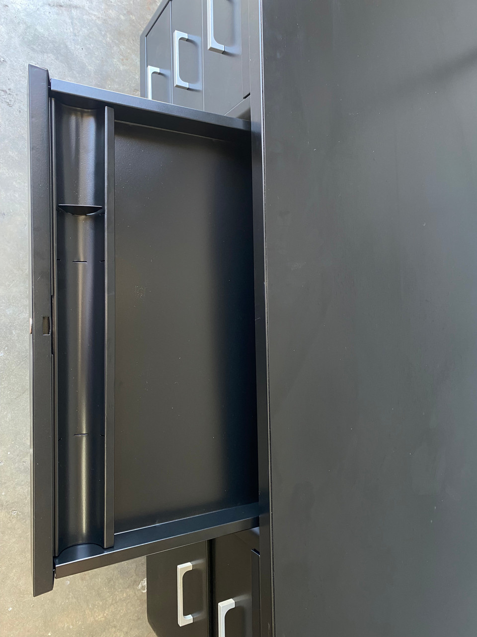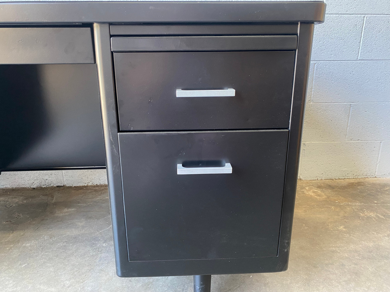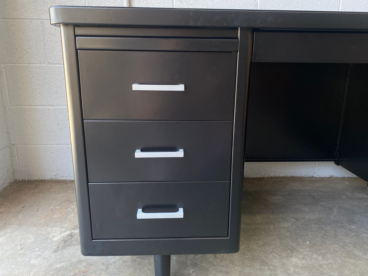 1960s Steelcase tanker desk on pontoon legs, refinished in black with silver hardware (Semi Gloss BK 08). In excellent refinished condition. Please refer to photos and contact us with any questions. One available immediately.